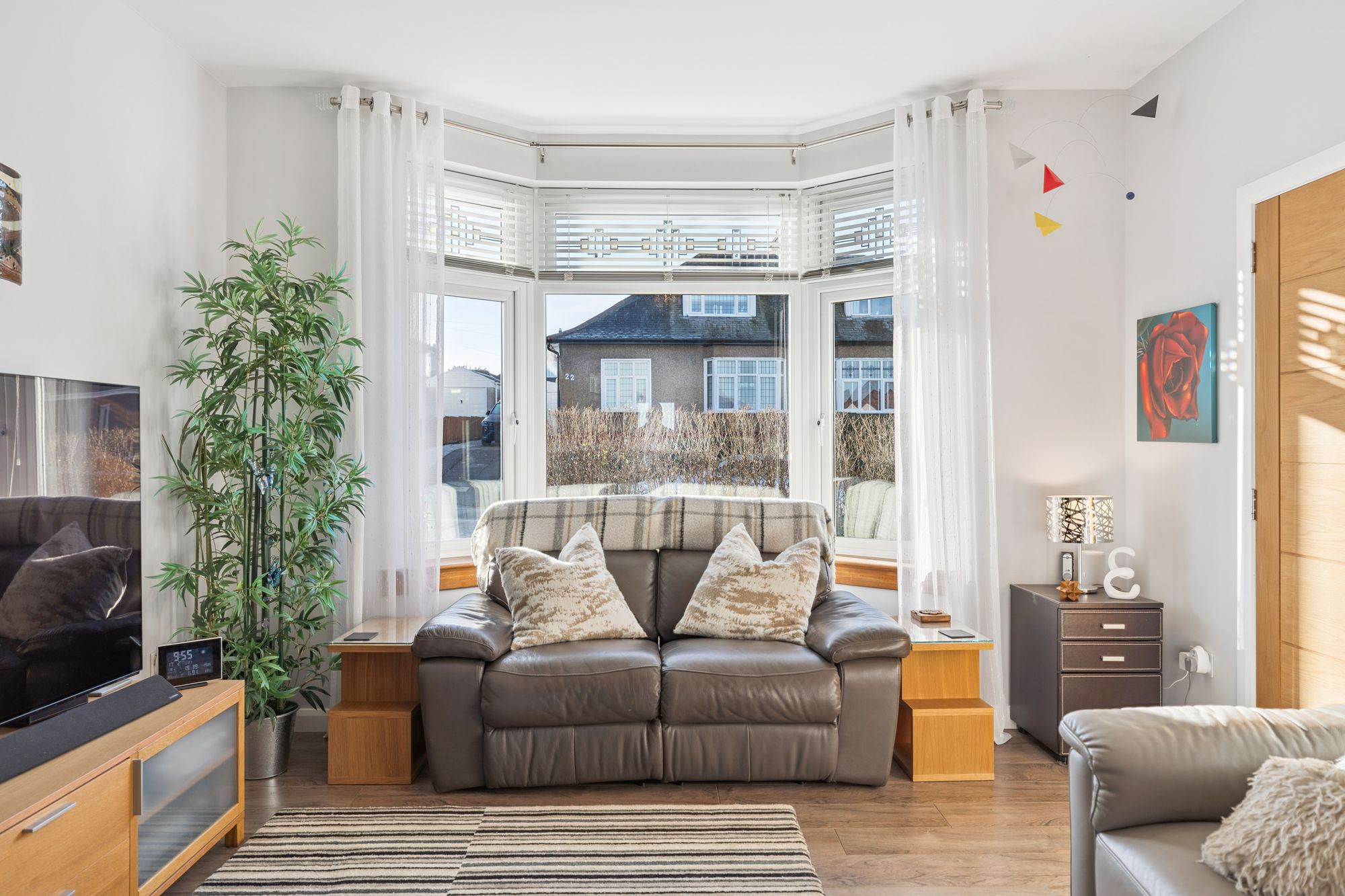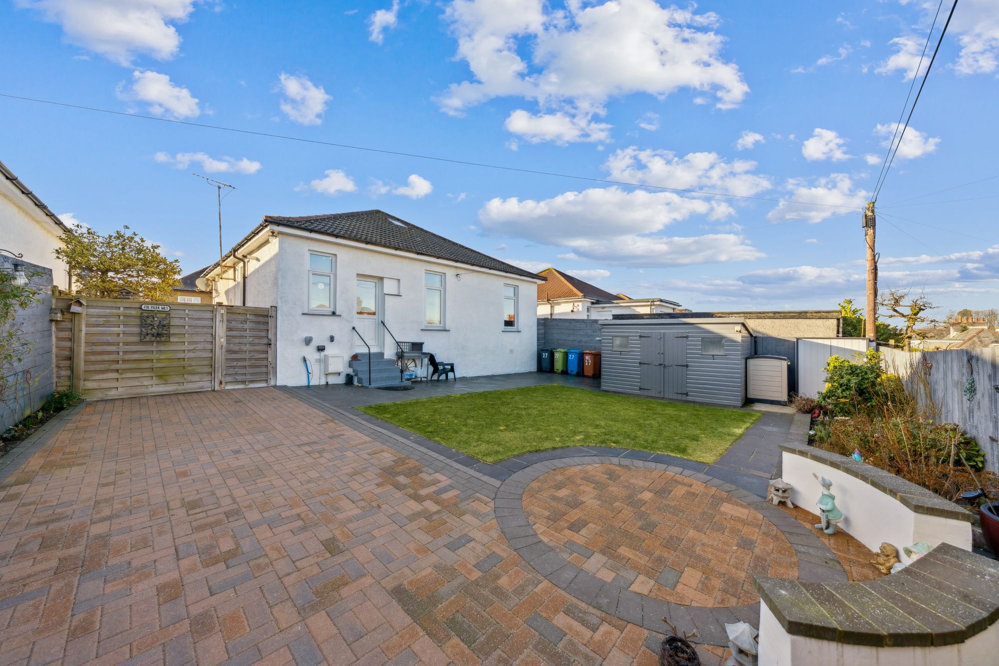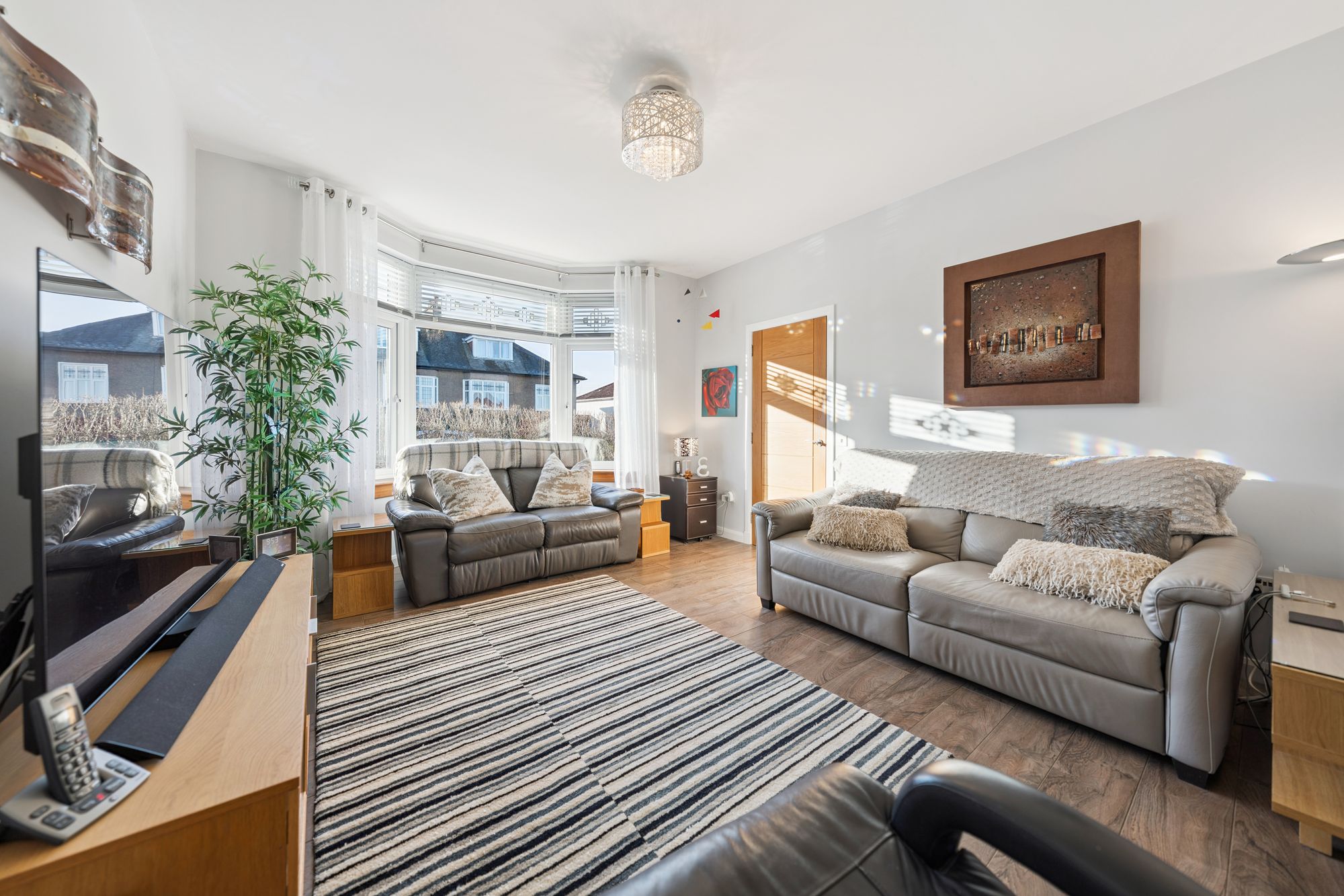 The front of the property is screened by manicured hedgerow and features extensive monoblock paving allowing off street parking for multiple vehicles. The rear garden has a view over Glasgow to the distant Campsie Fells. It is particularly private and features a central lawn with further monoblock and paving, a large shed for storage, and has low maintenance flower beds with irrigation system and outdoor power sockets, providing excellent space for outside entertaining.