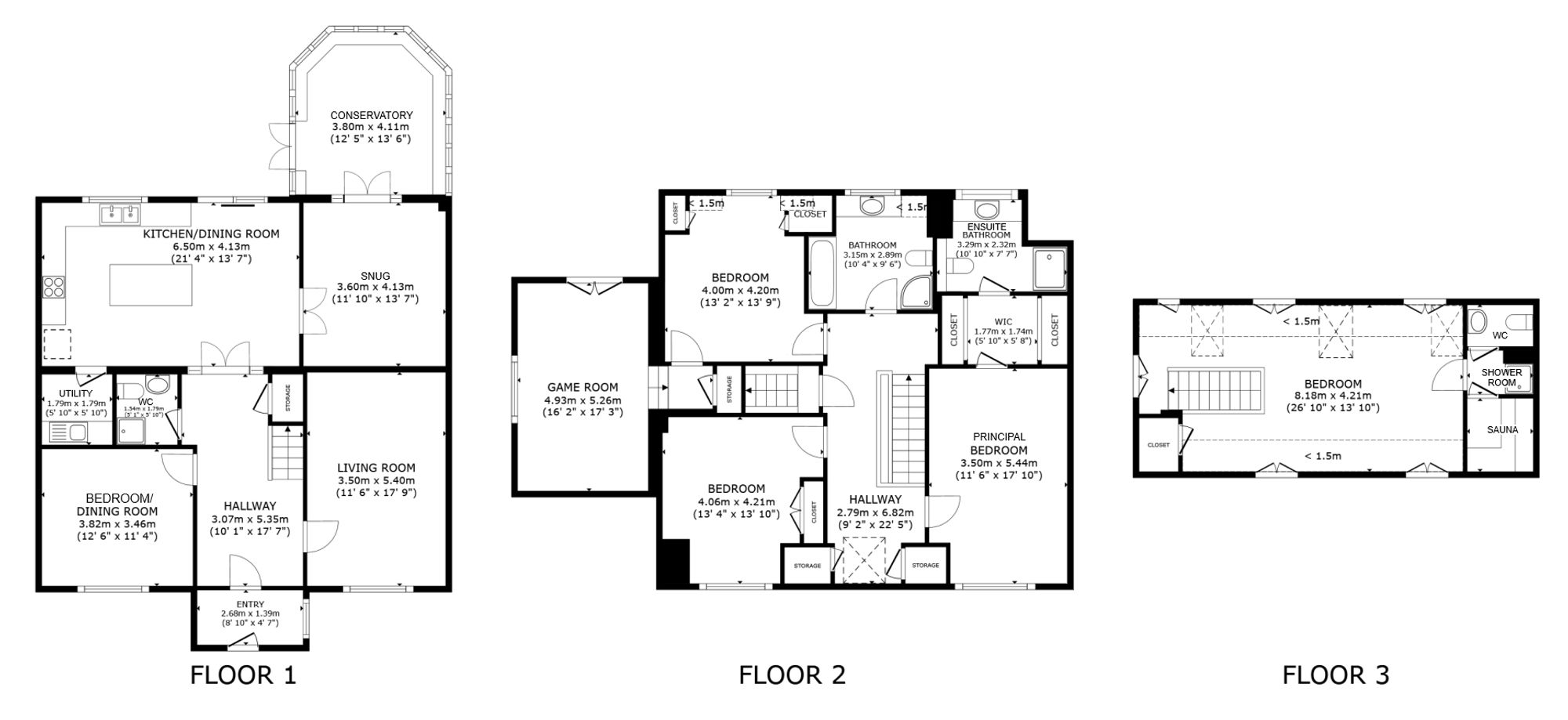 The first floor continues the theme of space and versatility. The principal bedroom serves as a luxurious retreat, featuring a dressing room and a stylish and contemporary ensuite shower room. Two further large double bedrooms each benefit from built-in storage, while a contemporary family bathroom completes the accommodation on this level. A generous games room is accessed via one of the bedrooms and could easily serve as a playroom, home office, or cinema room.