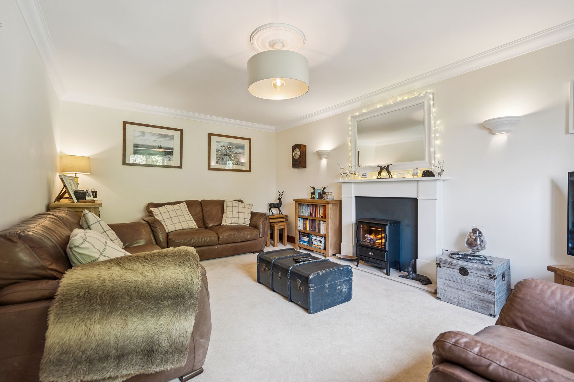 The ground floor welcomes you through an entrance vestibule into a broad hallway that sets the tone for the rest of the home. To the front, a bright and generous living room provides an ideal setting for relaxation or entertaining. A separate dining room offers a formal space for family meals or as additional accommodation, while the impressive open-plan kitchen and dining area forms the social heart of the home — complete with contemporary fittings, electric Aga, a central island, french doors leading to the garden, and serviced by a utility room. Adjacent to the kitchen is a cosy snug or family room, featuring a log-burning stove that creates a warm and inviting space for everyday living. The conservatory enjoys open views over the rear garden and creates a perfect indoor-outdoor connection. A downstairs shower-room completes the ground floor accommodation.