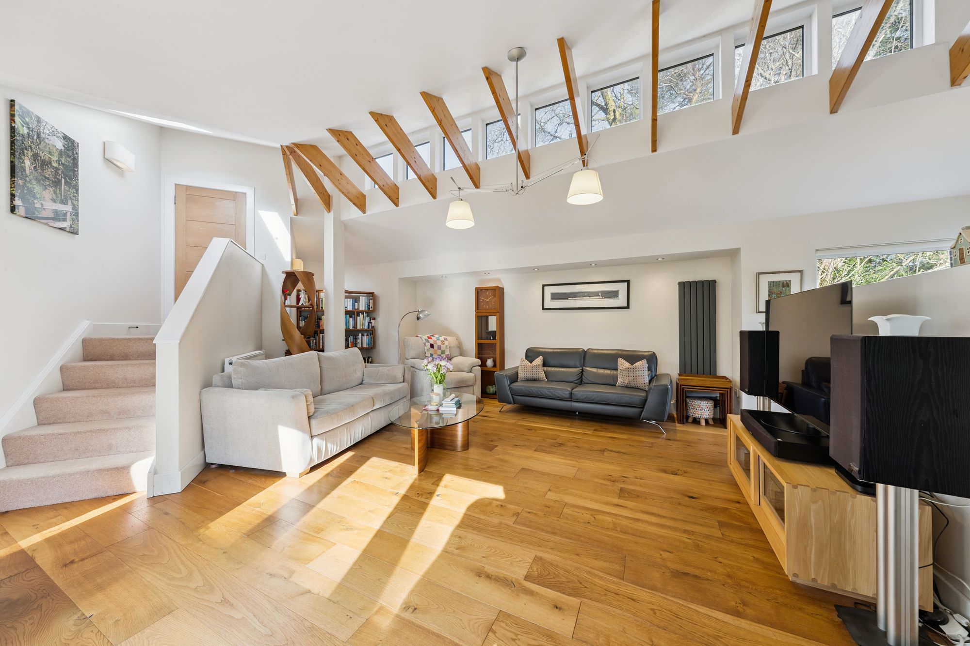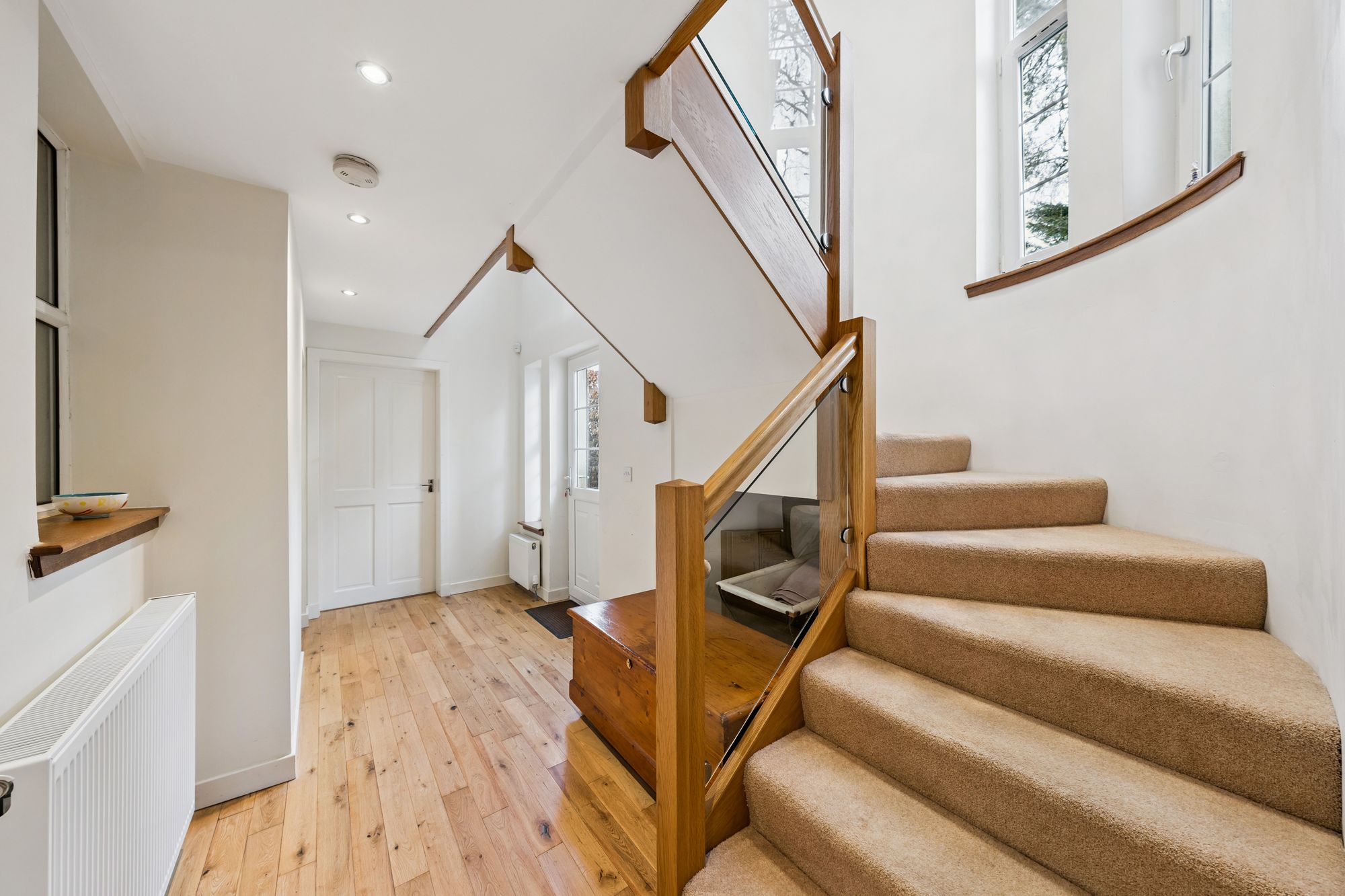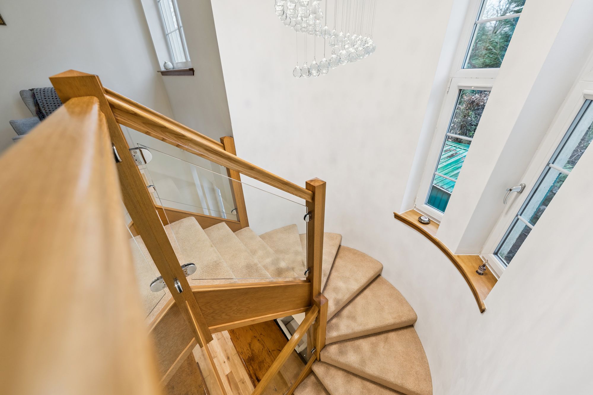 A distinctive curved staircase with glass balustrades elegantly connects the levels. The property further benefits from gas central heating and a mixture of triple and double glazing.