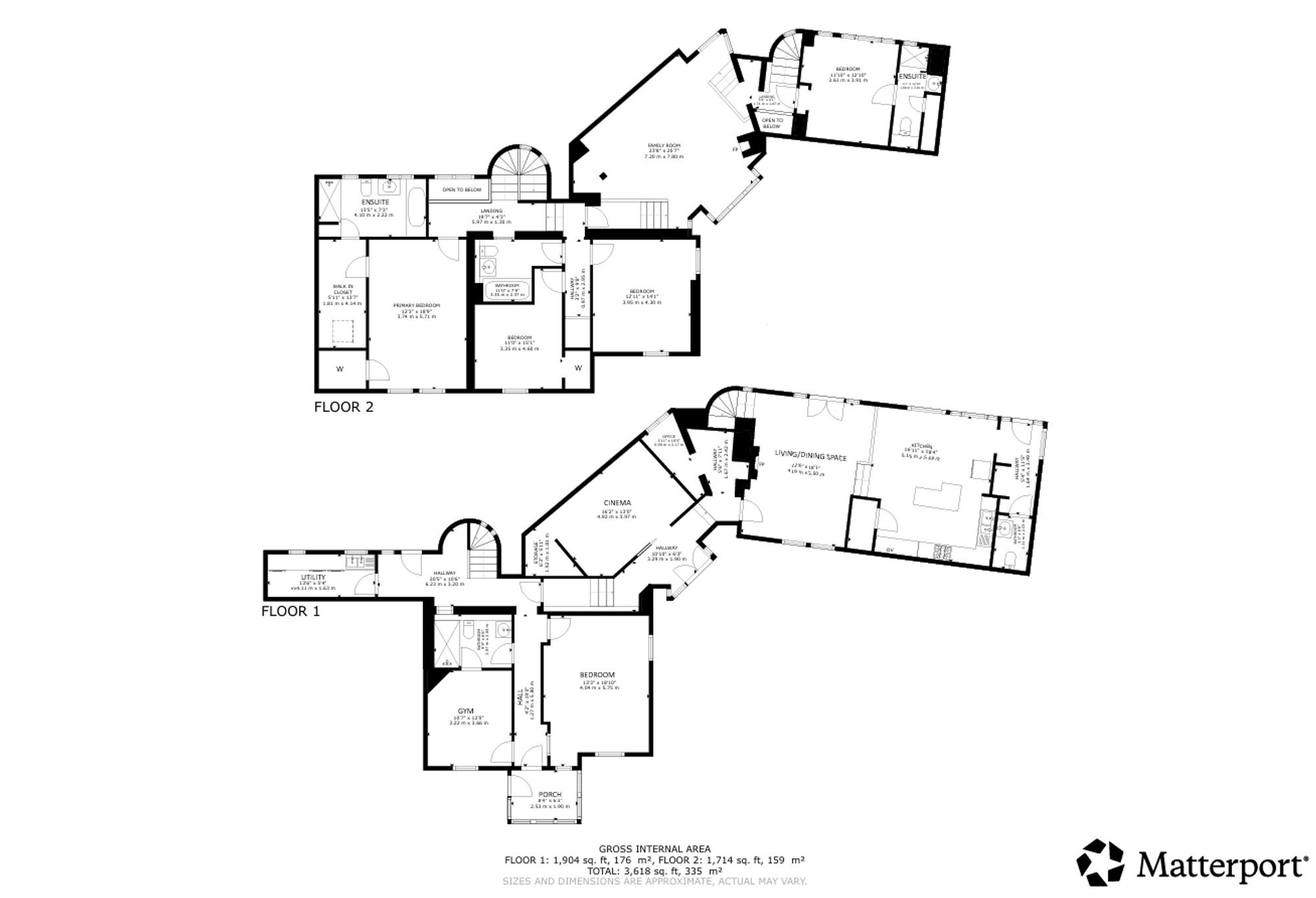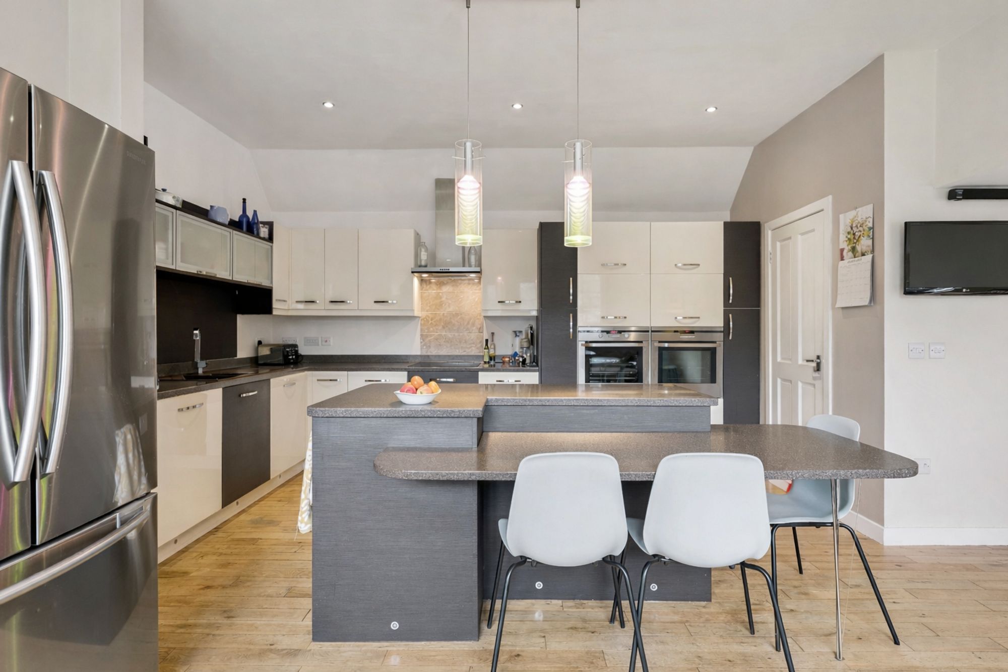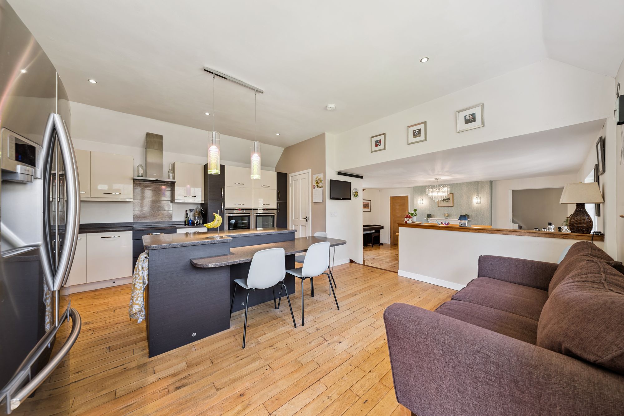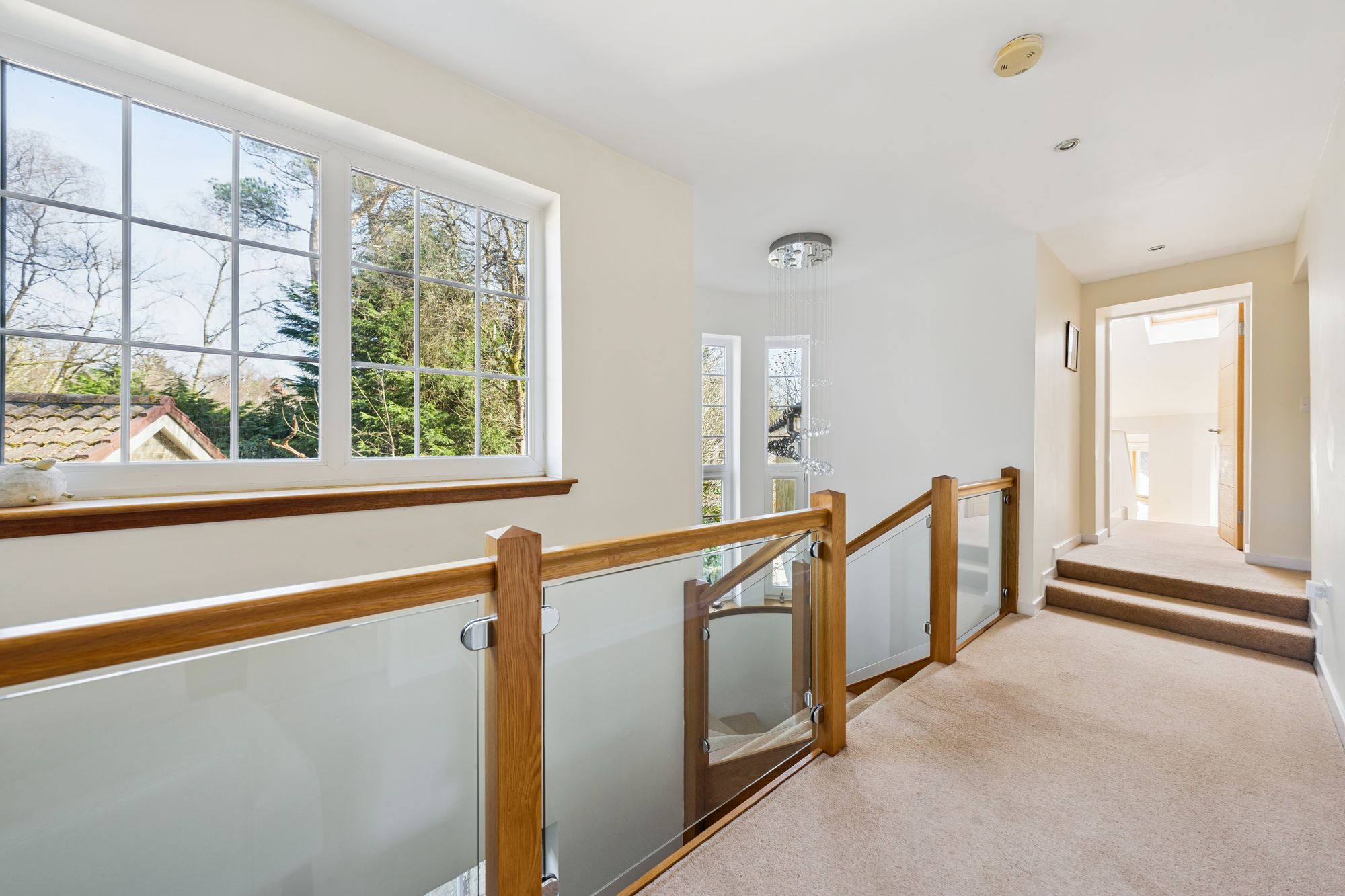 A distinctive curved staircase with glass balustrades elegantly connects the levels. The property further benefits from gas central heating and a mixture of triple and double glazing.