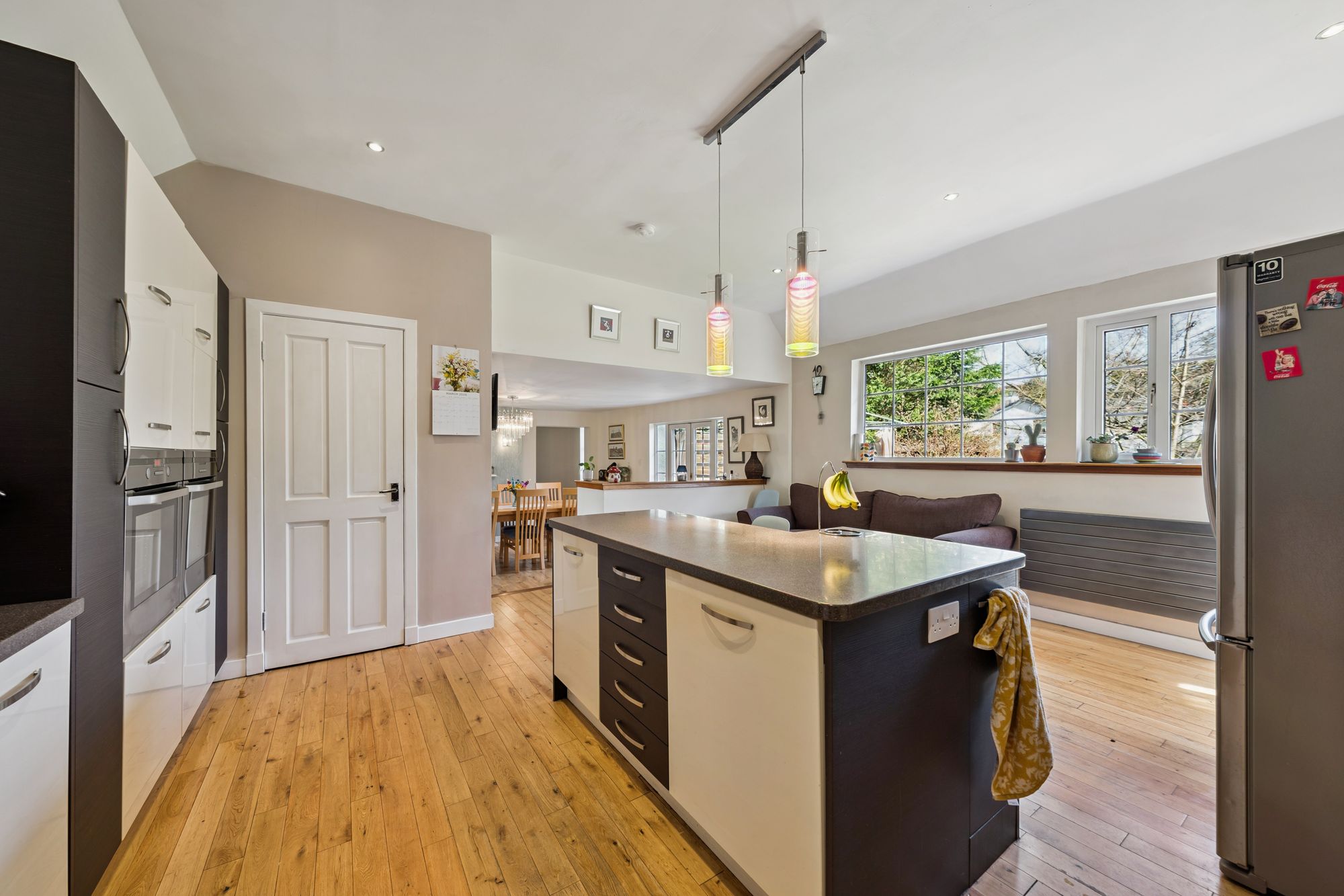 The heart of the home is undoubtedly the expansive open plan kitchen, dining and living area perfect for modern family living and entertaining. The kitchen is beautifully appointed with a range of wall and base units, a central island, and high quality integrated appliances including two ovens, an induction hob, extractor fan and dishwasher. French doors provide seamless access to a decked terrace overlooking the garden. There is also a small study / office area on the ground floor off the central hallway and an additional storage, a WC, and direct garden access.