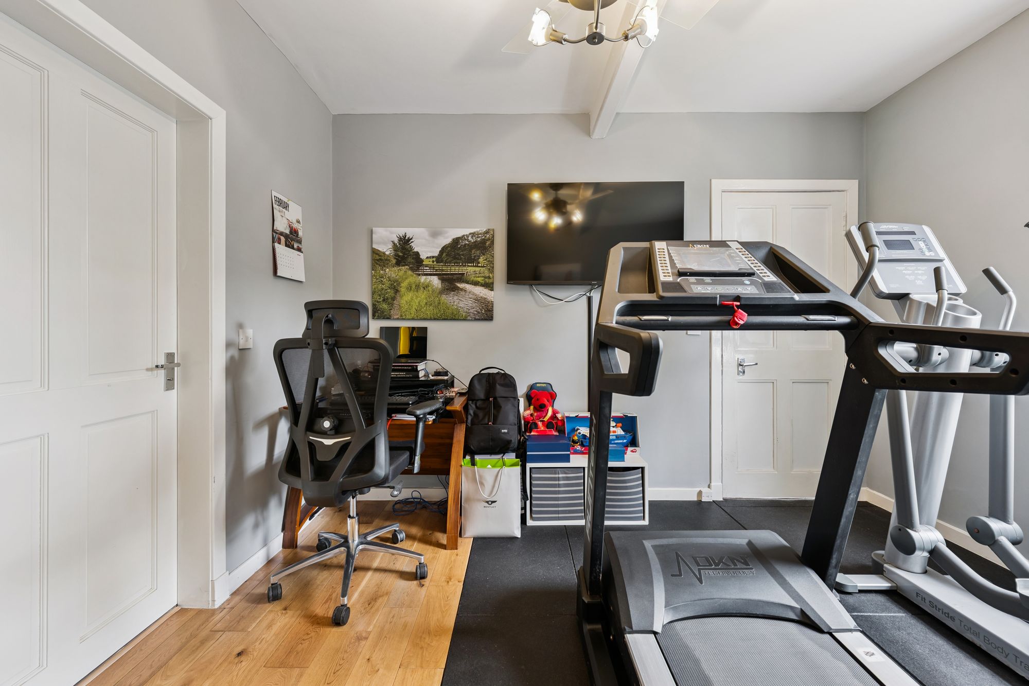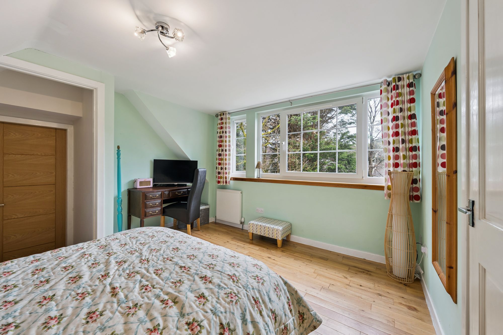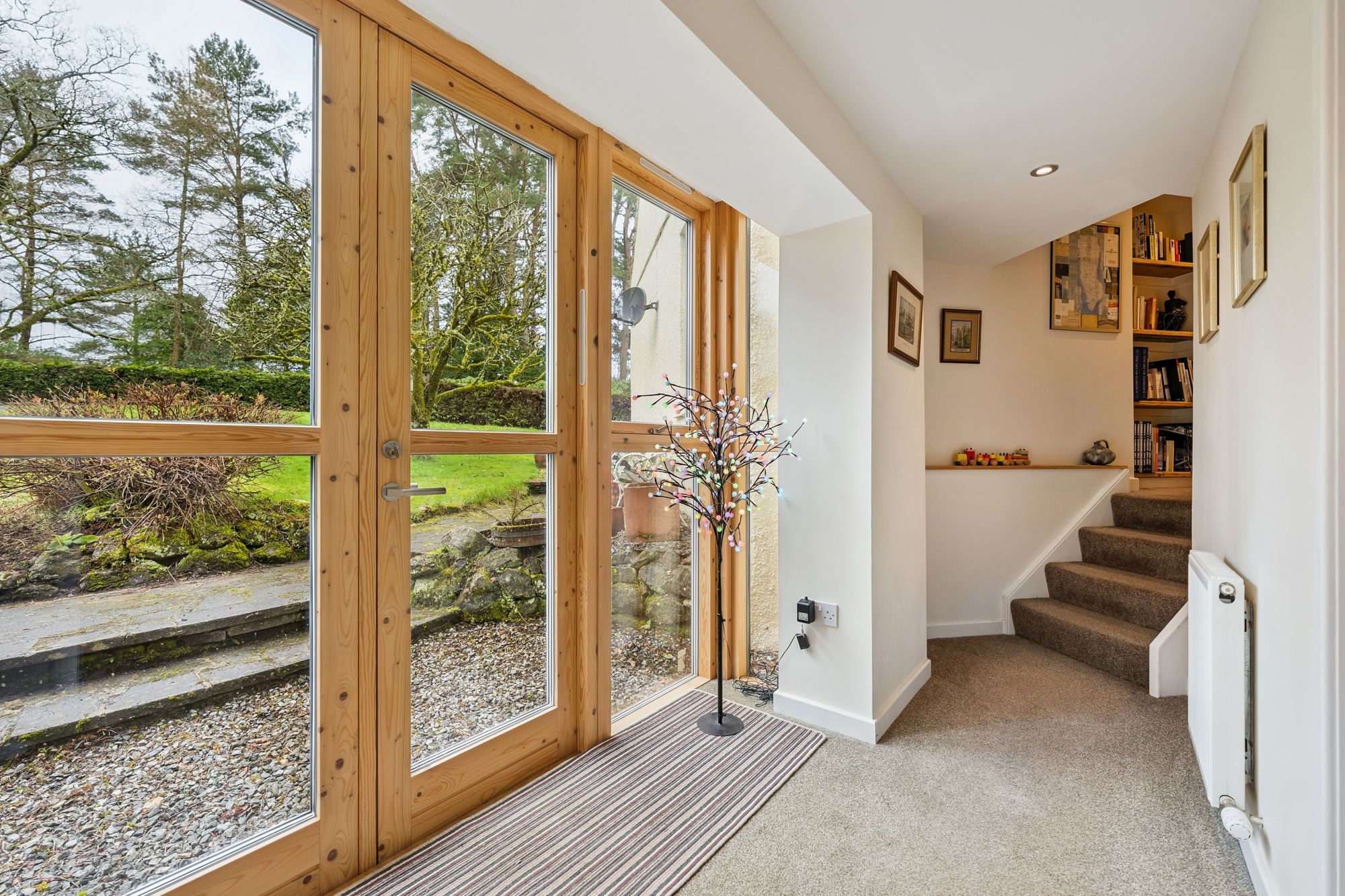 The accommodation has been extended and is both spacious and versatile, beginning with a bright and welcoming porch that opens into a reception hallway. Off the hallway lies a bedroom which is currently being utilised as a gym and study, alongside a stylish, fully tiled shower room complete with walk-in shower, WC and wash hand basin. A generously proportioned double bedroom with dual aspects to the front and side further complements this level.