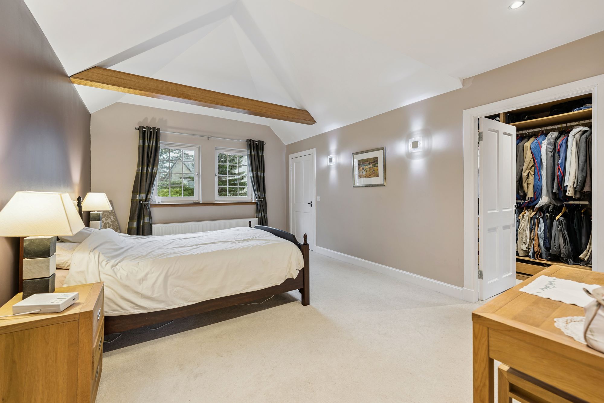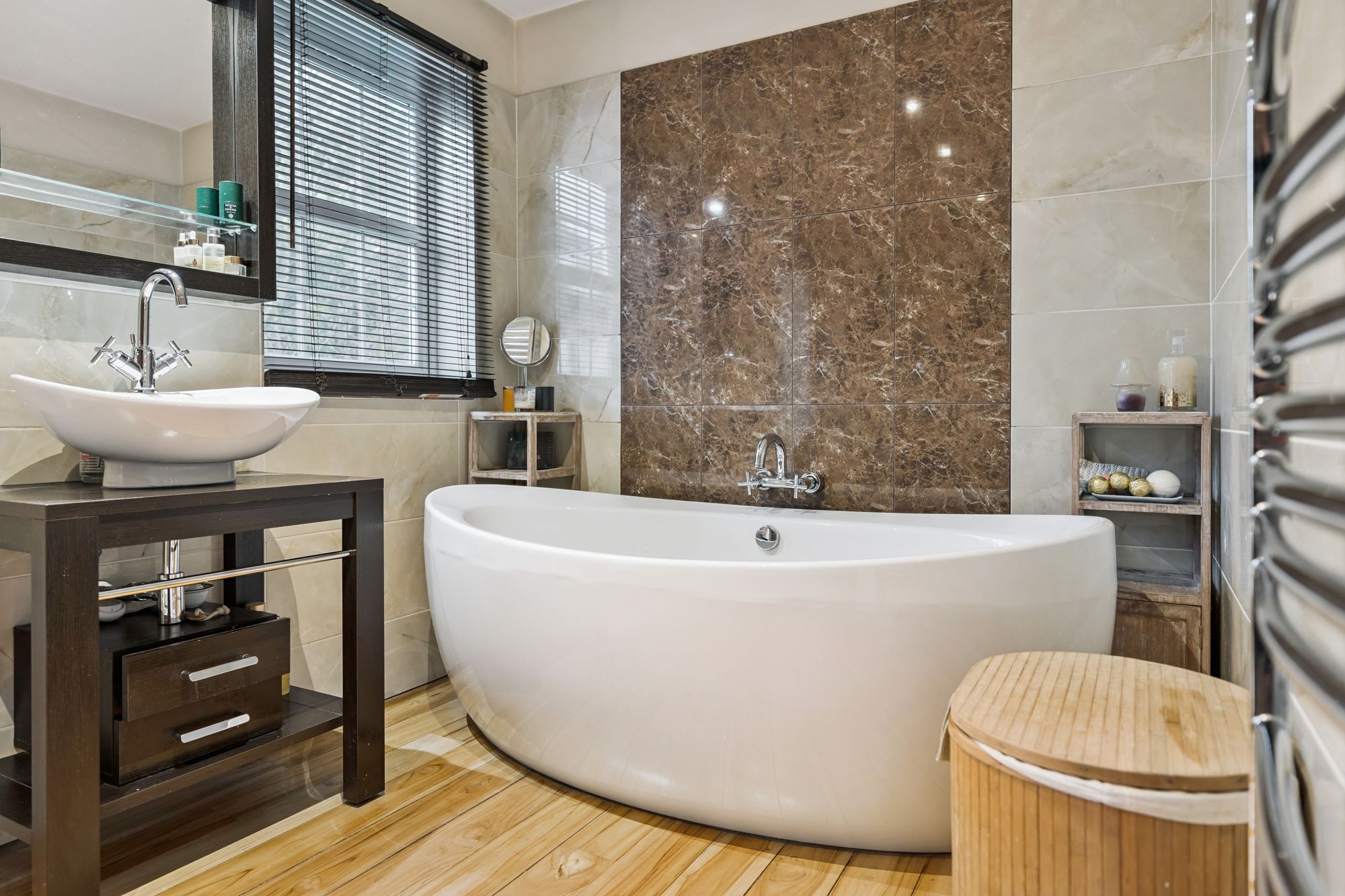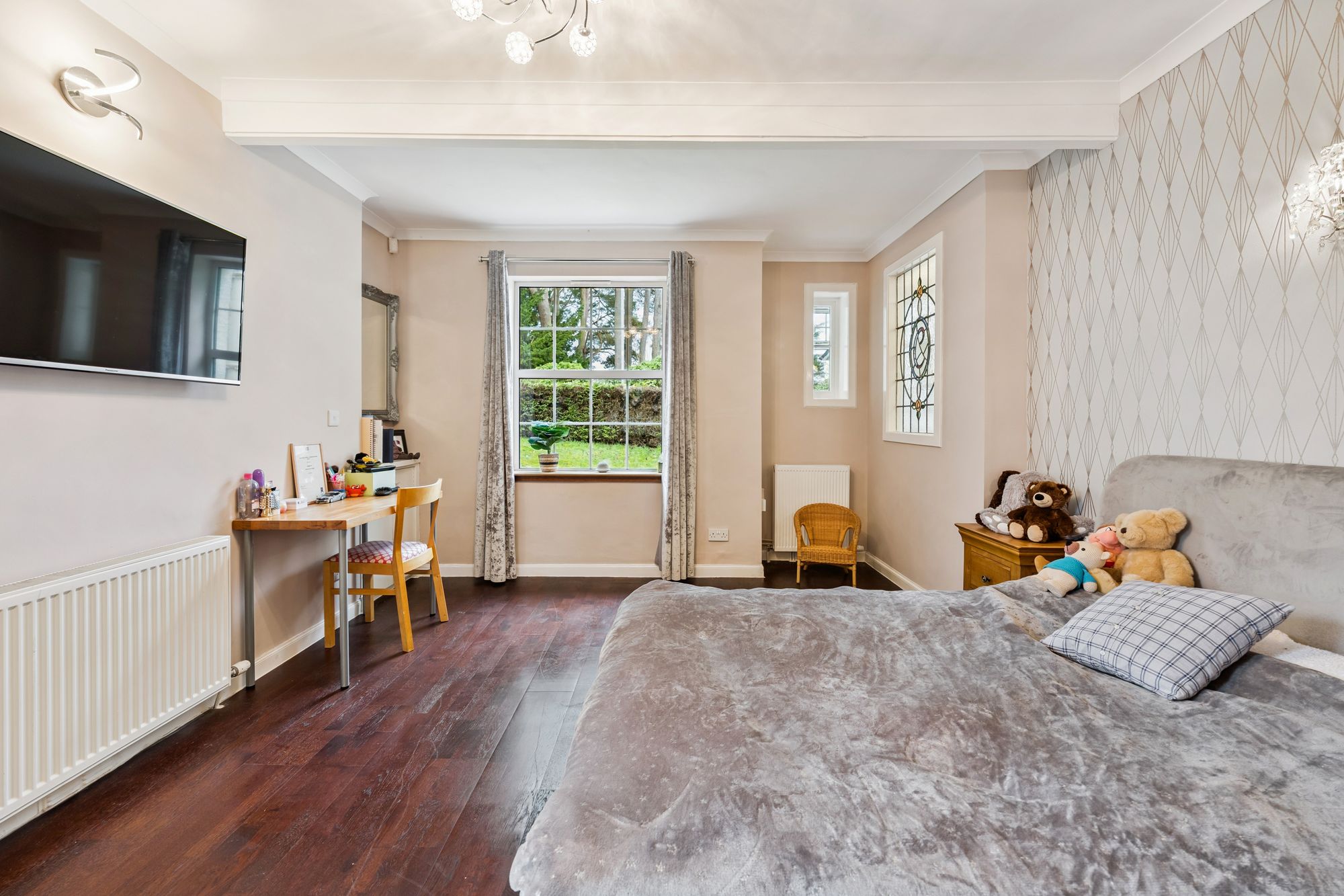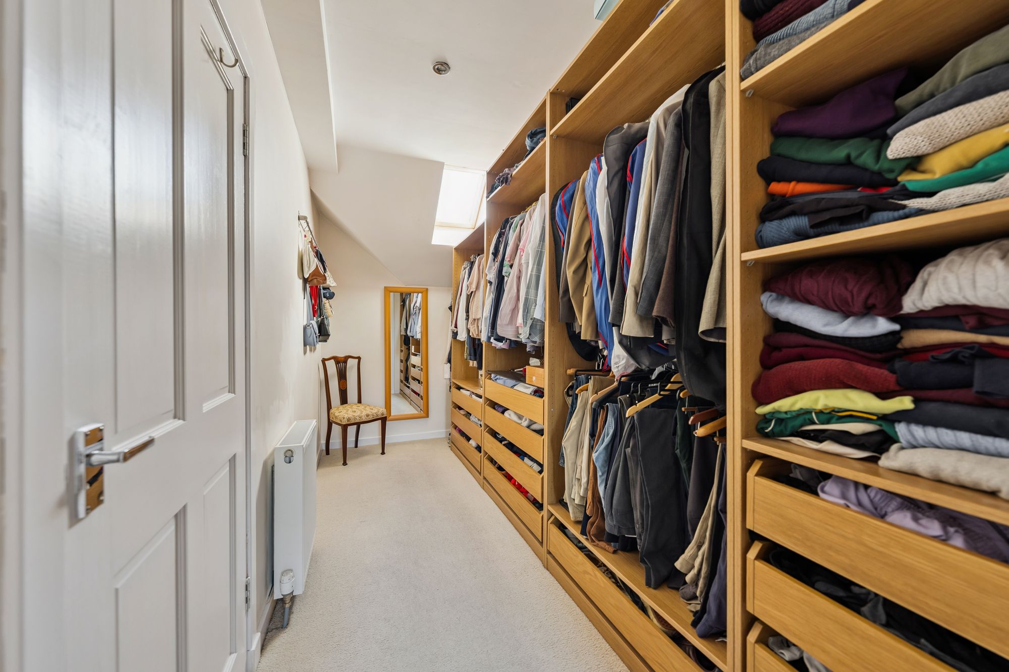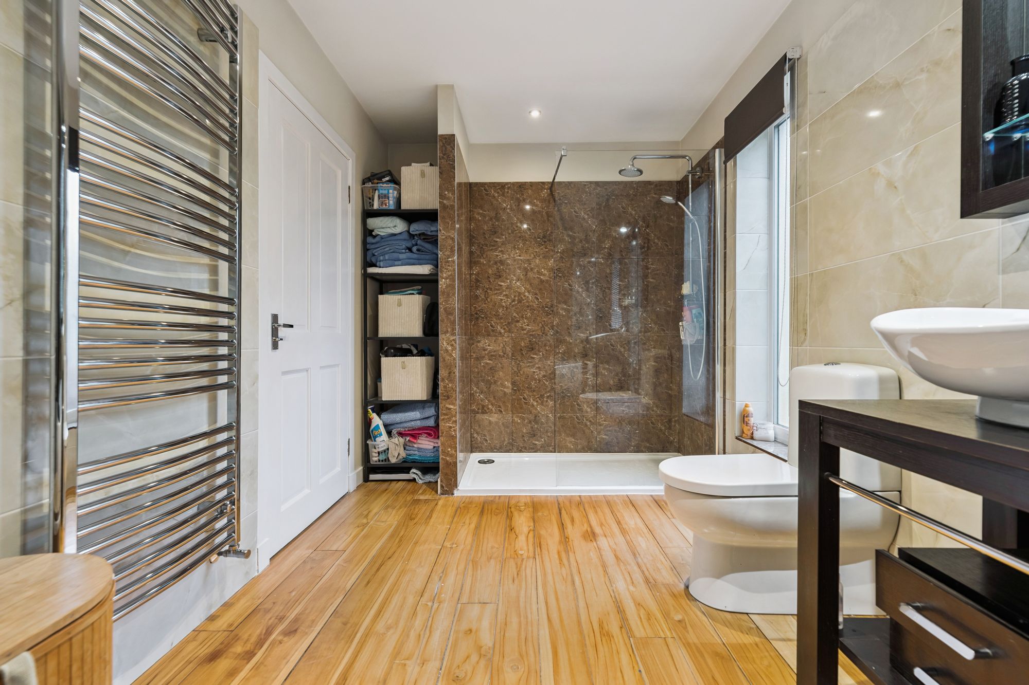 On the top floor, a landing flooded with natural light gives access to three generous bedrooms and a contemporary family bathroom. The principal suite benefits from a walk-in dressing area, a large en-suite bathroom featuring a walk-in shower, freestanding bath, wash hand basin and chrome towel rail, as well as excellent storage.