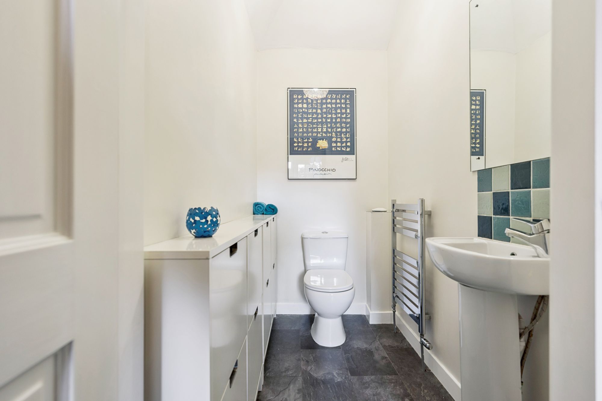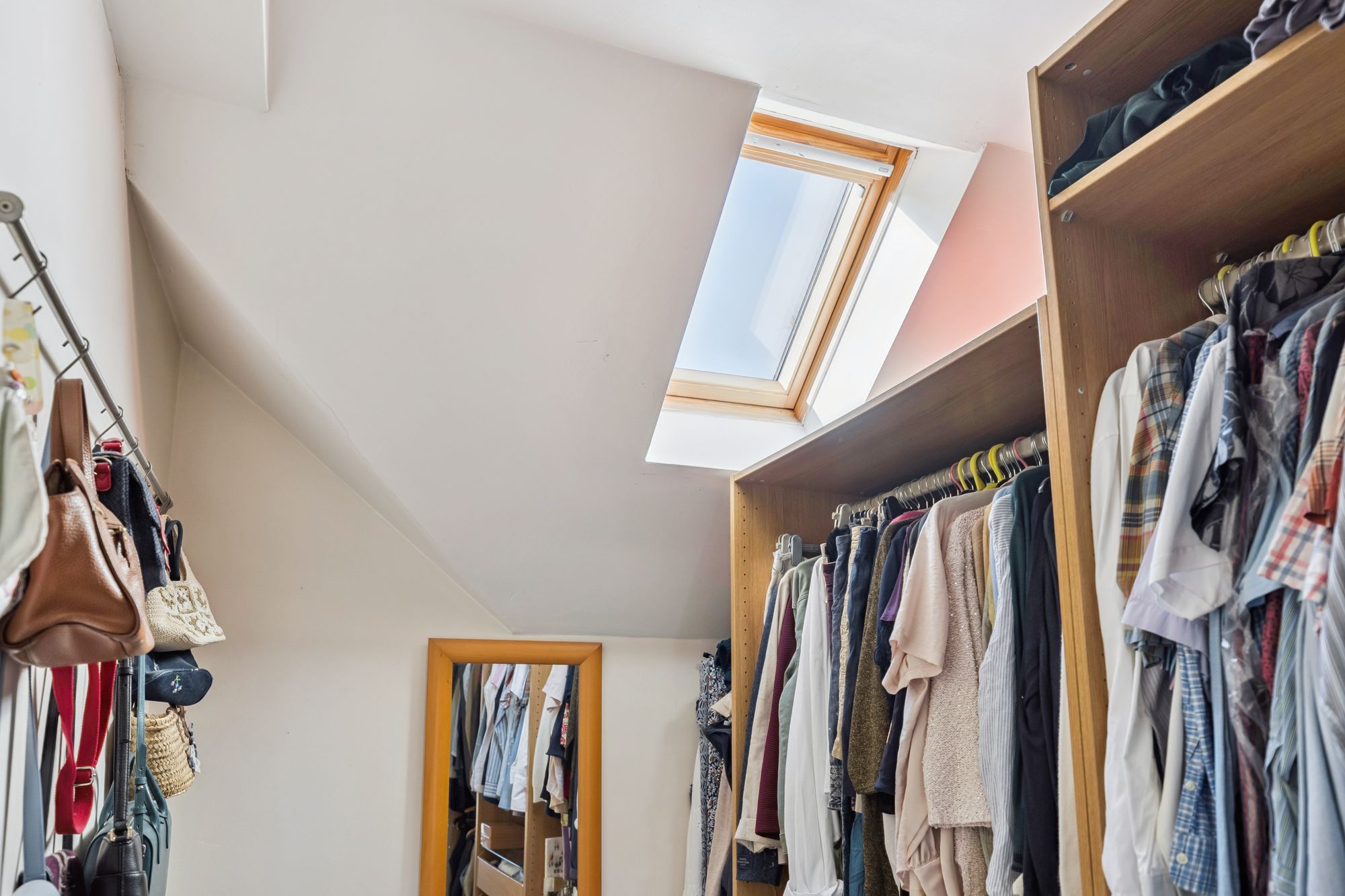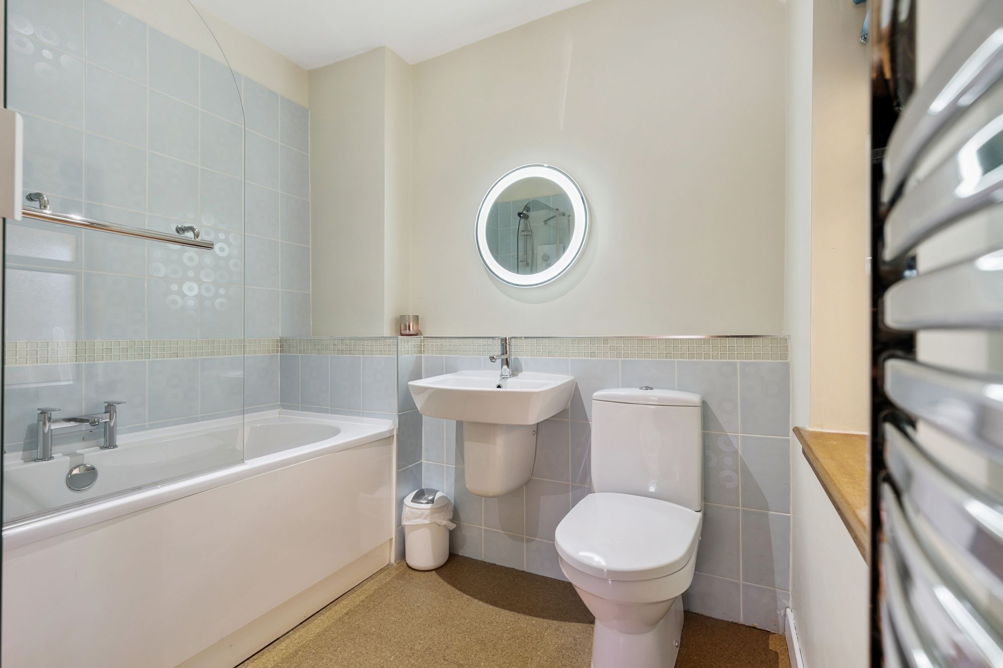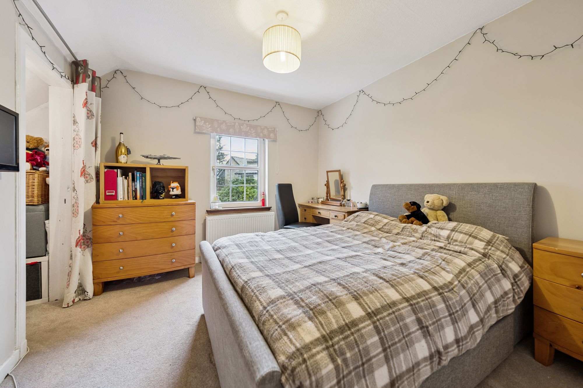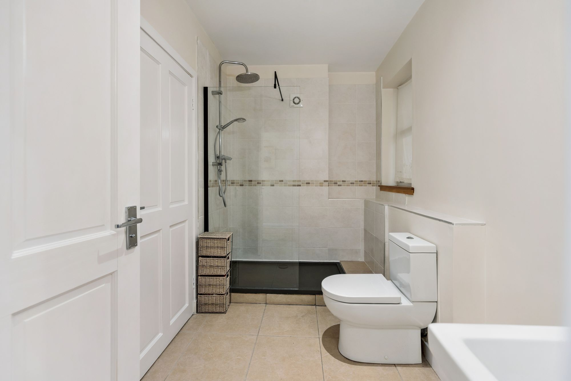 On the top floor, a landing flooded with natural light gives access to three generous bedrooms and a contemporary family bathroom. The principal suite benefits from a walk-in dressing area, a large en-suite bathroom featuring a walk-in shower, freestanding bath, wash hand basin and chrome towel rail, as well as excellent storage.