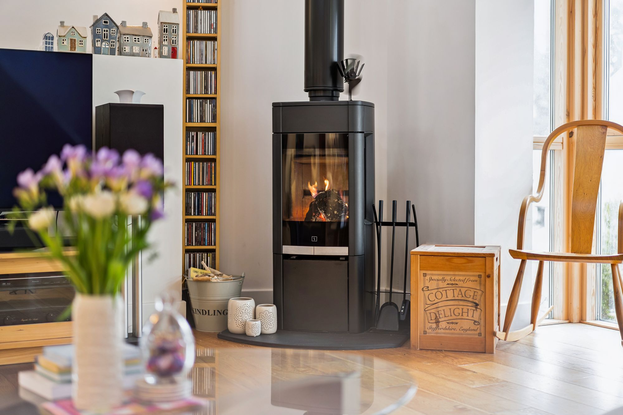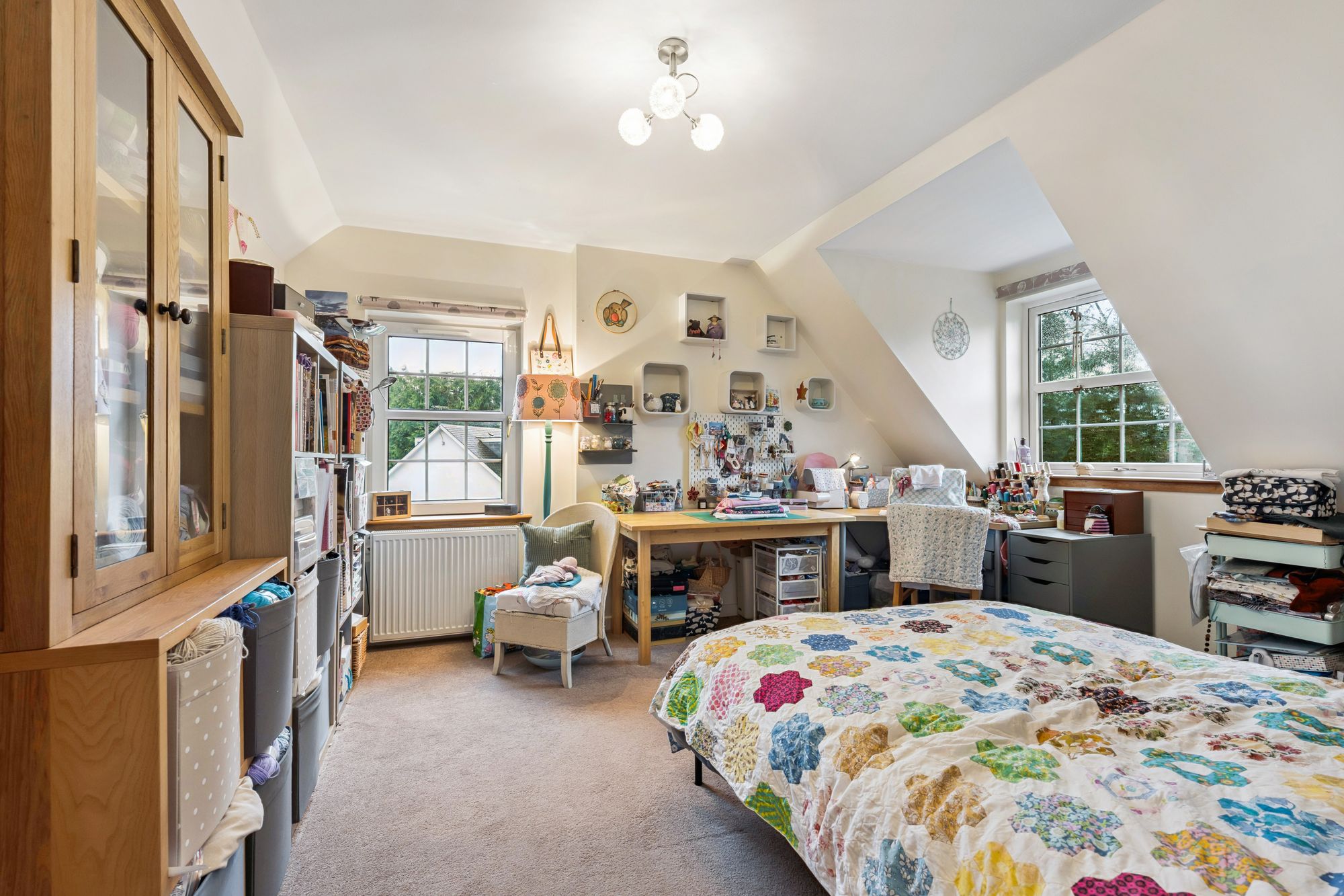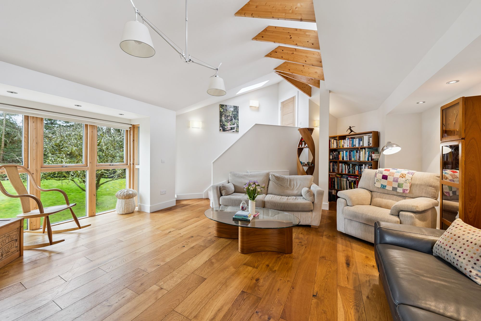 The upper levels of the property continue to impress. A split level landing leads to a spacious double bedroom with en-suite and eaves storage. A further elevated living space enjoys large windows with beautiful garden views and features a cosy log burner.