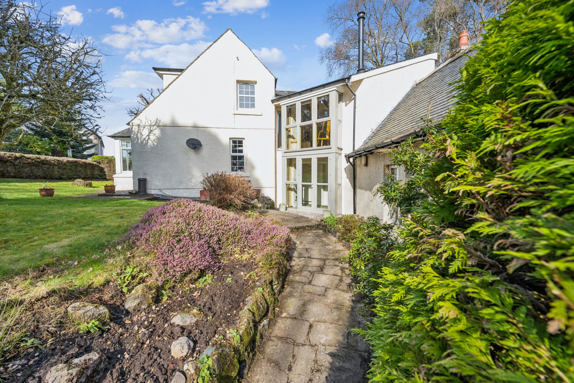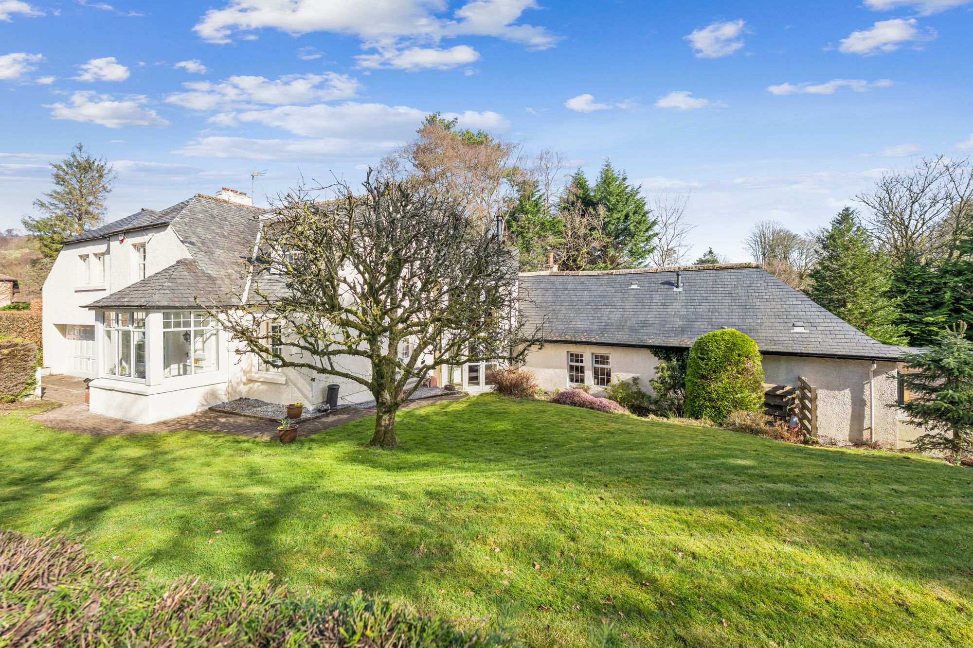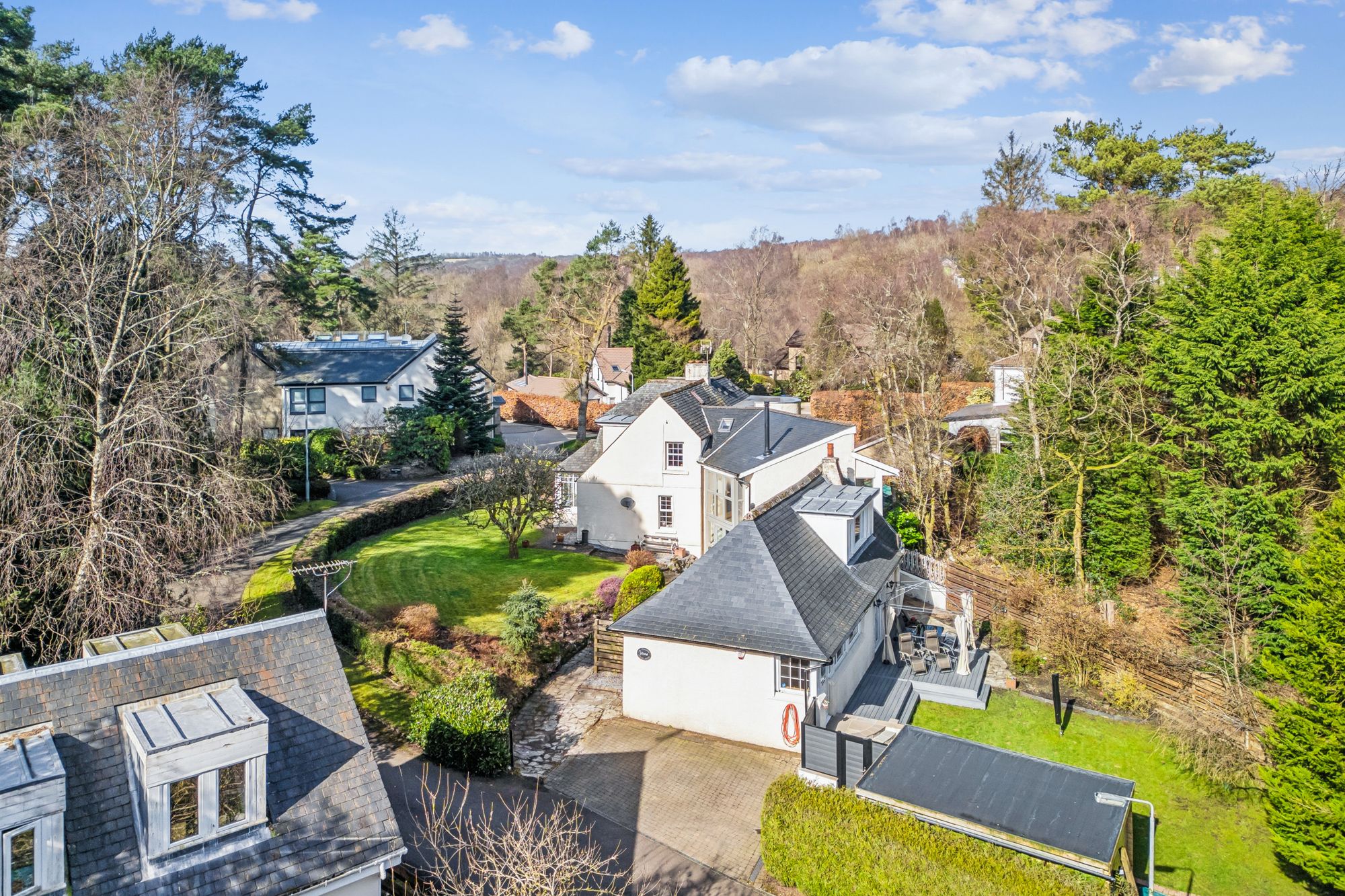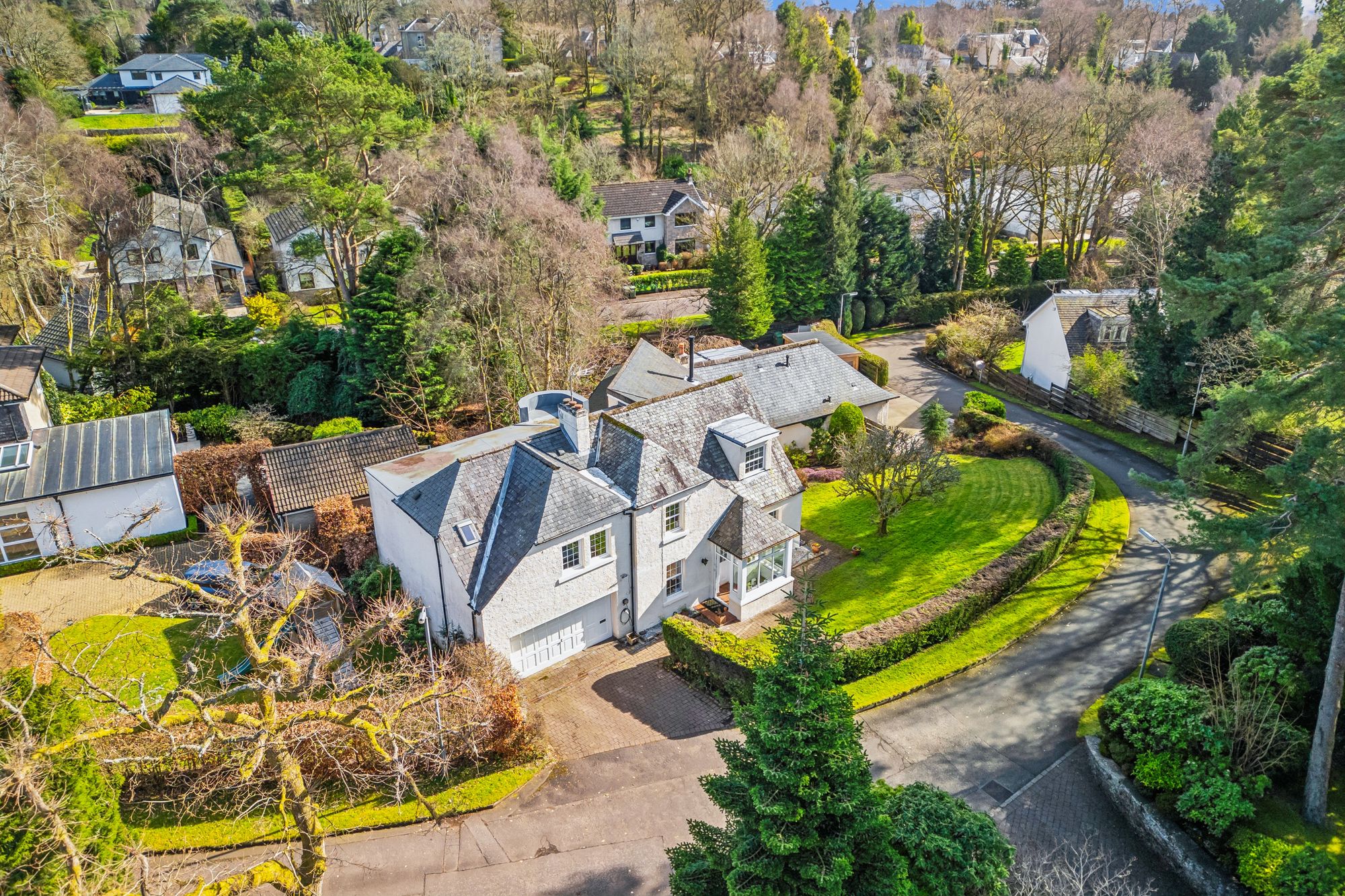 A truly stunning detached, six bedroom family home set within one of Milngavie’s most exclusive addresses, enjoying a private and enclosed plot surrounded by mature trees, offering both seclusion and tranquillity. This unique and characterful home is finished in a pleasant combination of painted render, with a natural slate hipped roof. The property has been cleverly developed, extended and improved over the years to provide superb family accommodation.
