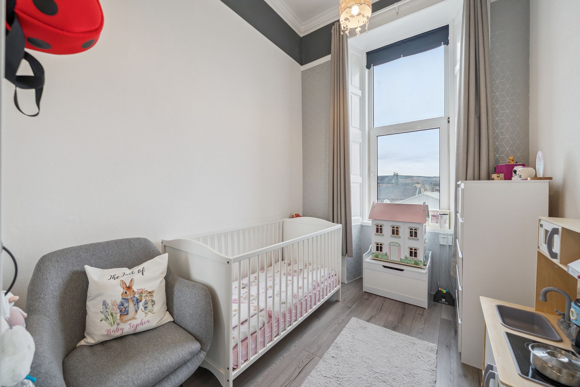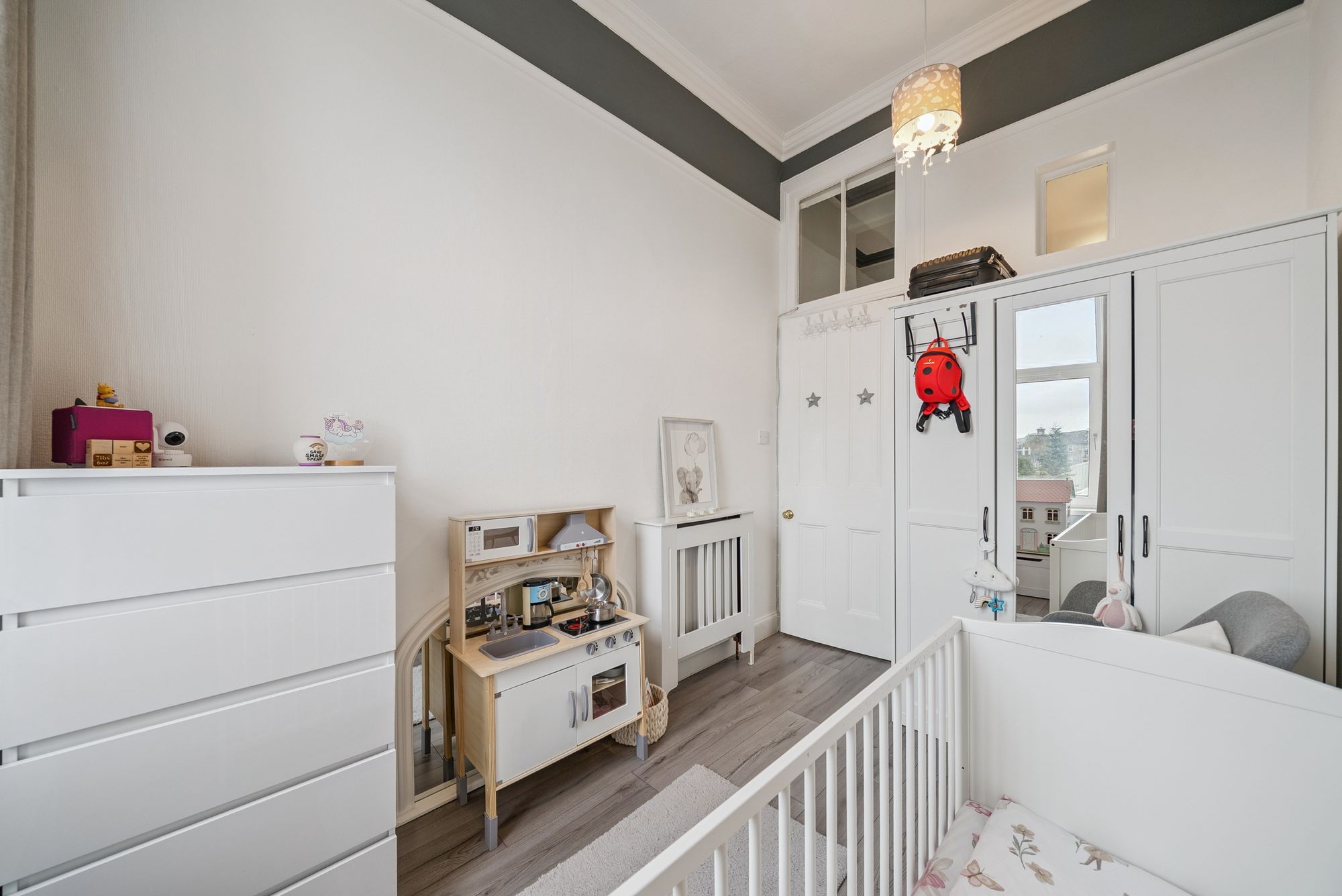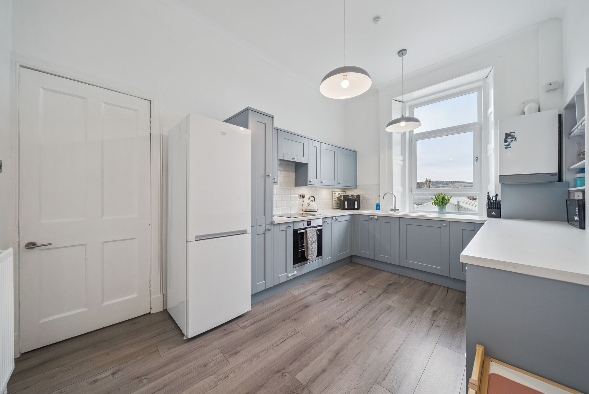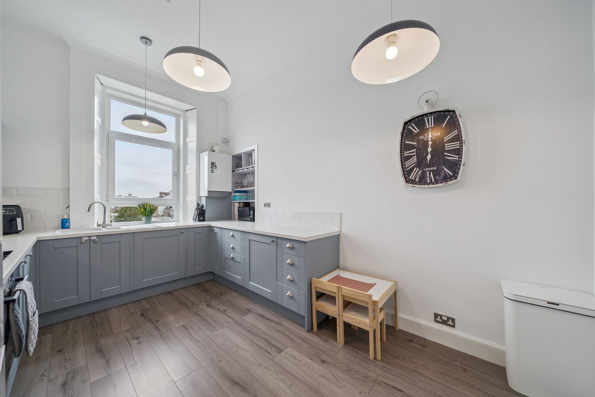 With refitted flooring and carpeting throughout, the flat boasts a beautifully refitted dining kitchen, a modern WC area, and a sleek shower room. The bay-windowed lounge offers breathtaking views over neighbouring rooftops towards the Clyde waters, while a welcoming entrance hallway sets the tone for the home. There are two bedrooms: the master is a generously sized double with ample space for freestanding furniture, while the second bedroom, currently used as a child’s room, is equally adaptable as a guest room, study, or home office. The dining kitchen is a vision of modern practicality, fitted with a wide range of floor and wall-mounted units offering excellent storage, along with inset appliances, such as an electric hob, oven, hood and a washing machine, with additional space for a freestanding fridge-freezer.