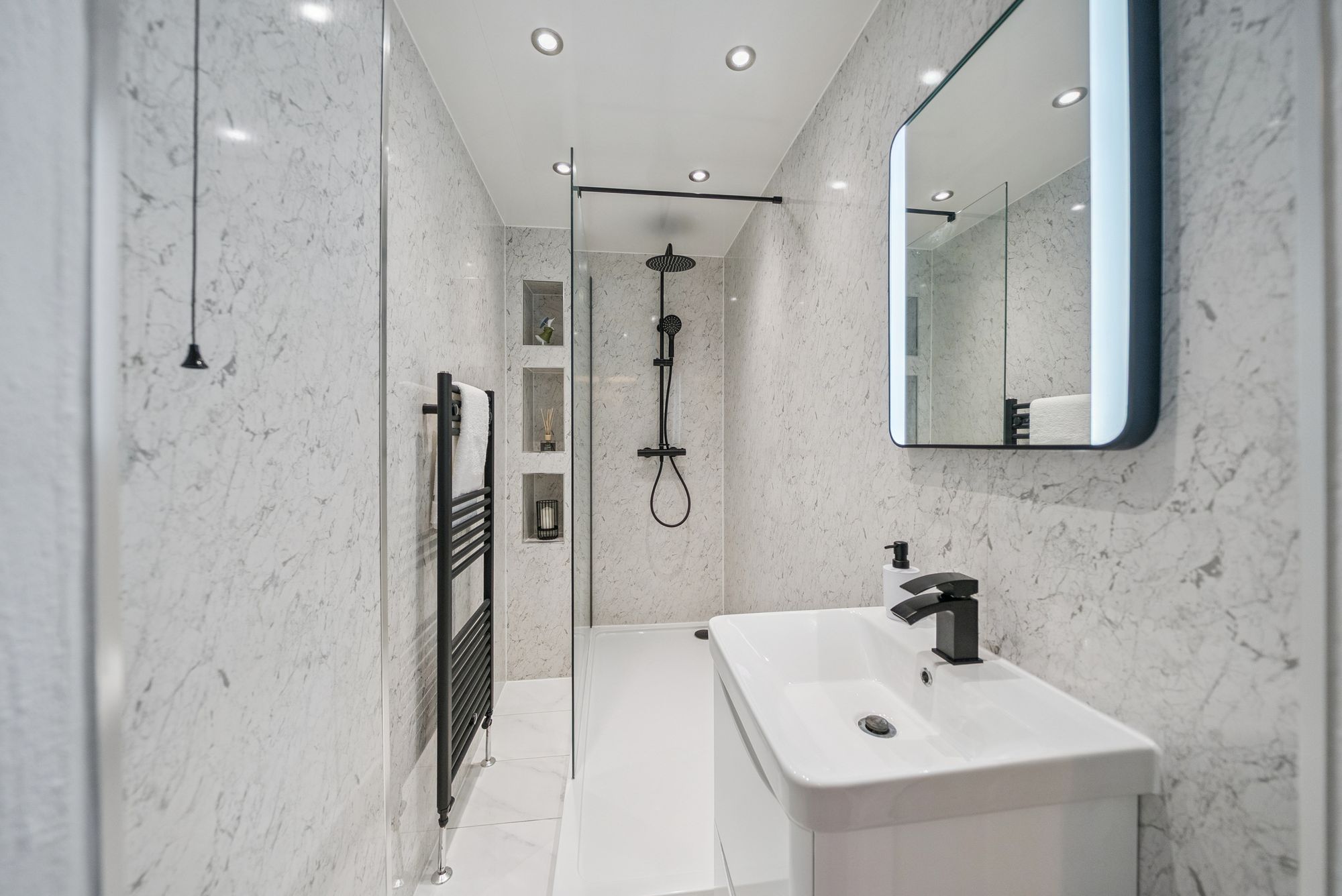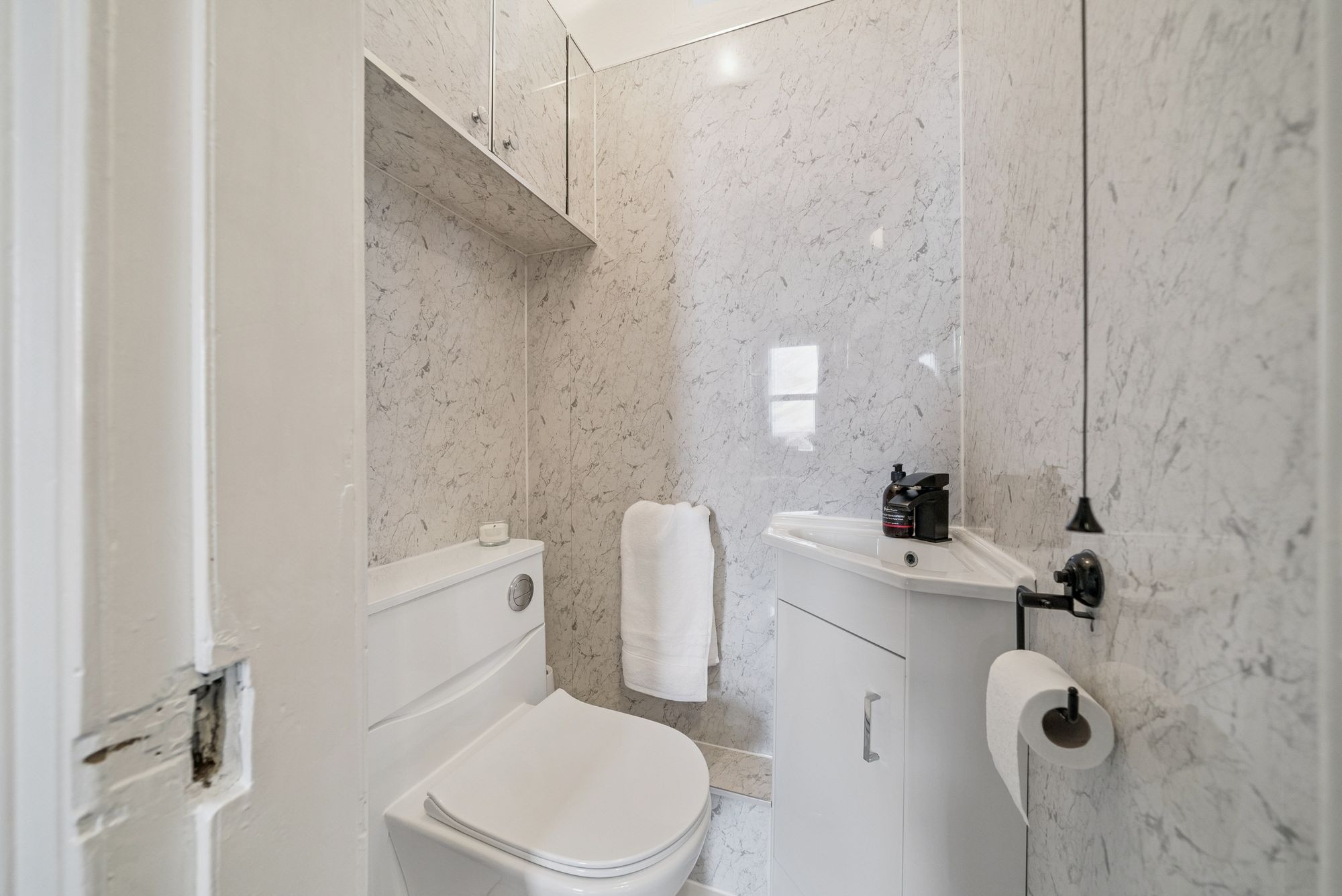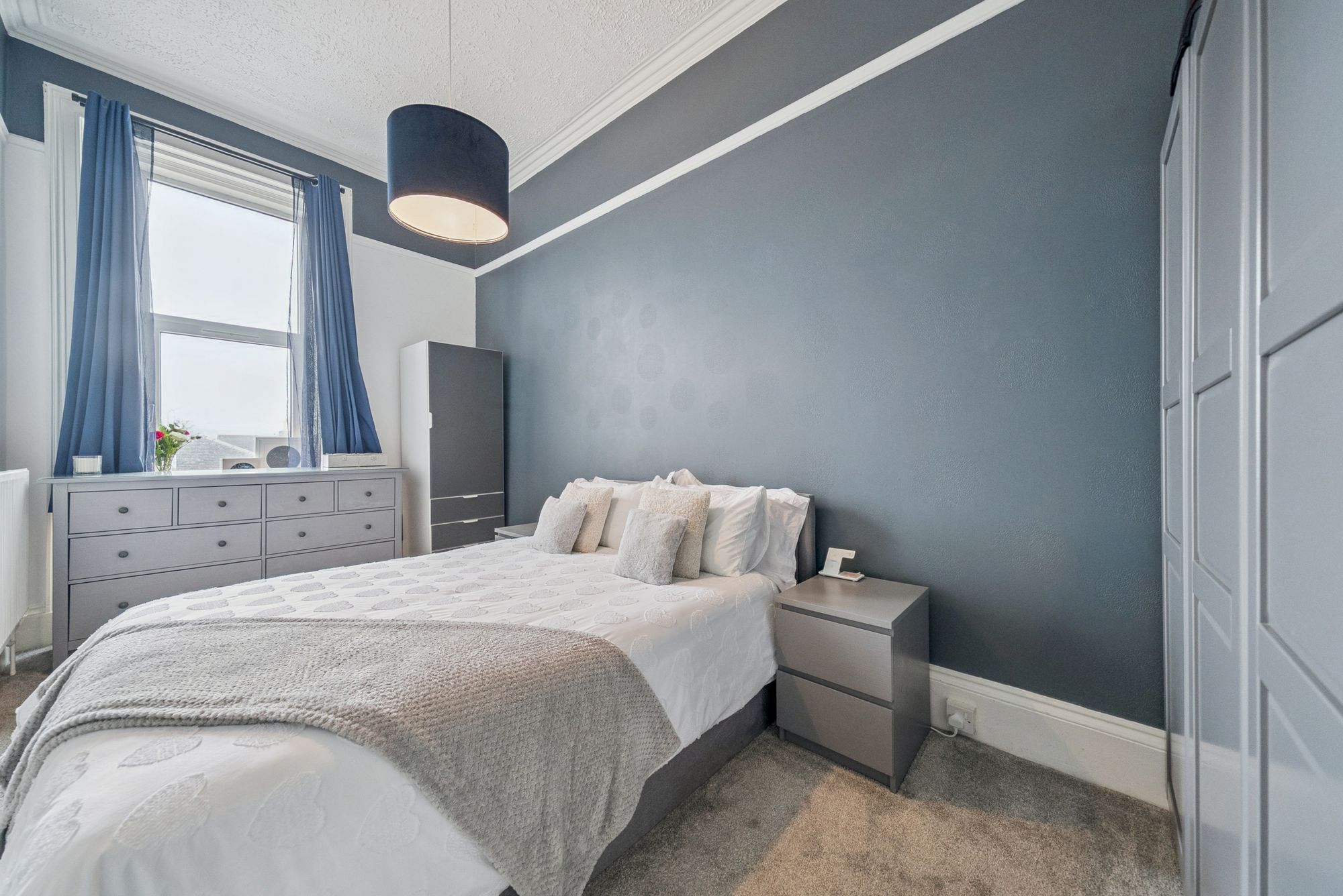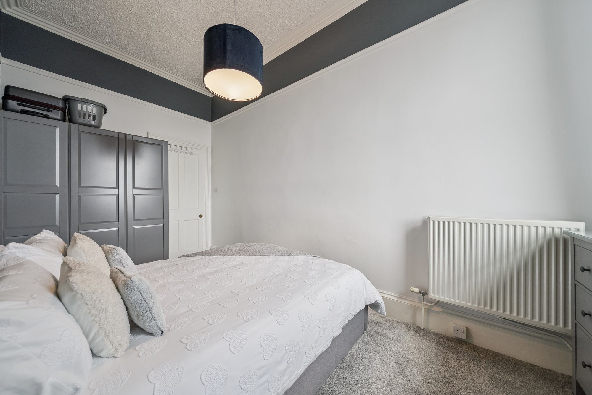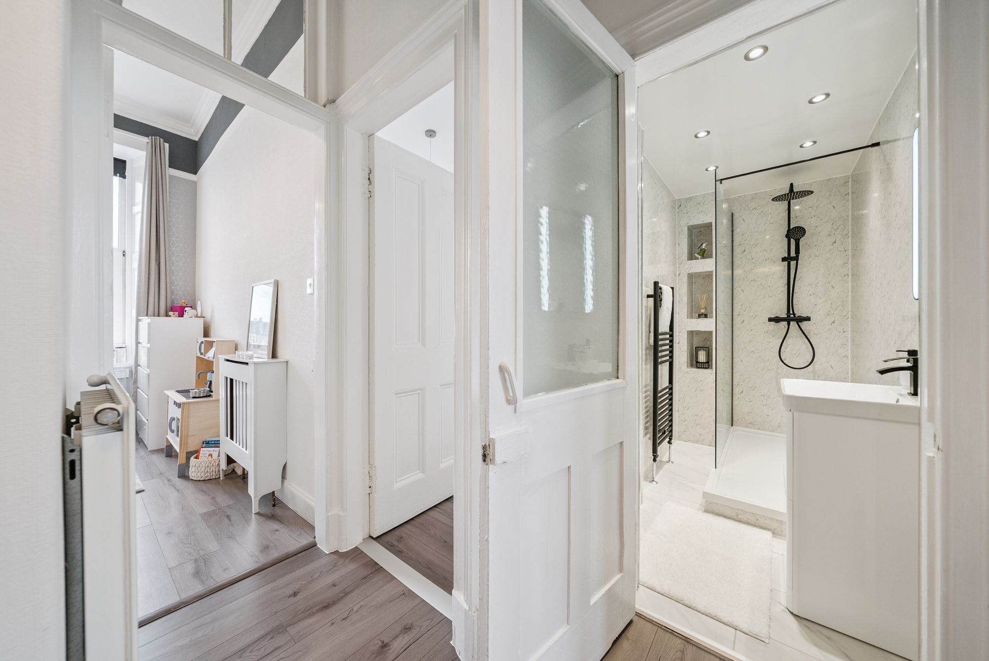 With refitted flooring and carpeting throughout, the flat boasts a beautifully refitted dining kitchen, a modern WC area, and a sleek shower room. The bay-windowed lounge offers breathtaking views over neighbouring rooftops towards the Clyde waters, while a welcoming entrance hallway sets the tone for the home. There are two bedrooms: the master is a generously sized double with ample space for freestanding furniture, while the second bedroom, currently used as a child’s room, is equally adaptable as a guest room, study, or home office. The dining kitchen is a vision of modern practicality, fitted with a wide range of floor and wall-mounted units offering excellent storage, along with inset appliances, such as an electric hob, oven, hood and a washing machine, with additional space for a freestanding fridge-freezer.