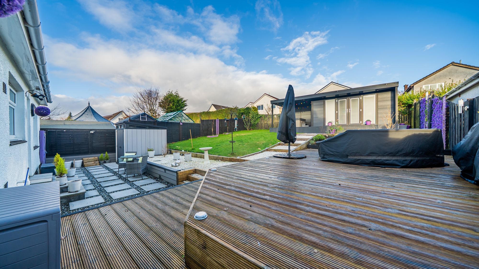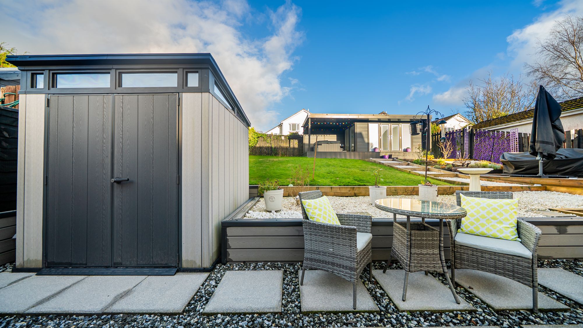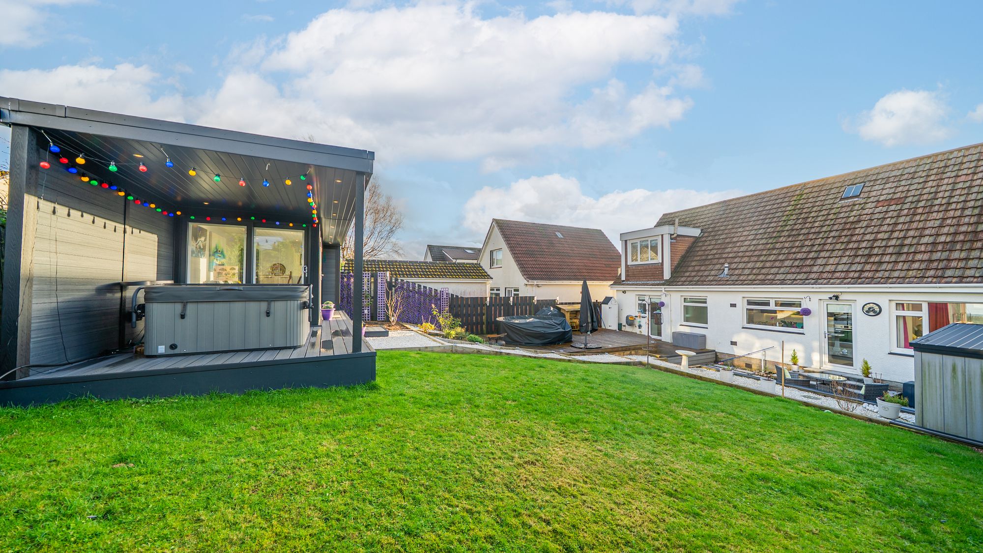Externally, the property occupies a truly impressive plot with thoughtfully designed outdoor spaces that cater perfectly to modern lifestyles. The front gardens are laid mainly to lawn and intersected by a neat surfaced pathway, while a mono-blocked driveway provides ample off-street parking and leads to a large integral single garage. The garage benefits from an automatic up-and-over door, power and lighting, and includes a useful workshop area. The rear garden is a standout feature, with fantastic views, arranged over attractive tiered levels and offering an excellent balance of lawn, gravel and paved areas. A modern garden room, with roofed extension, provides an outstanding entertaining space and houses a hot tub, creating a private outdoor retreat ideal for socialising and relaxation. It is fully powered and could also be used as a home office, gym or creative space, along with further garden storage.