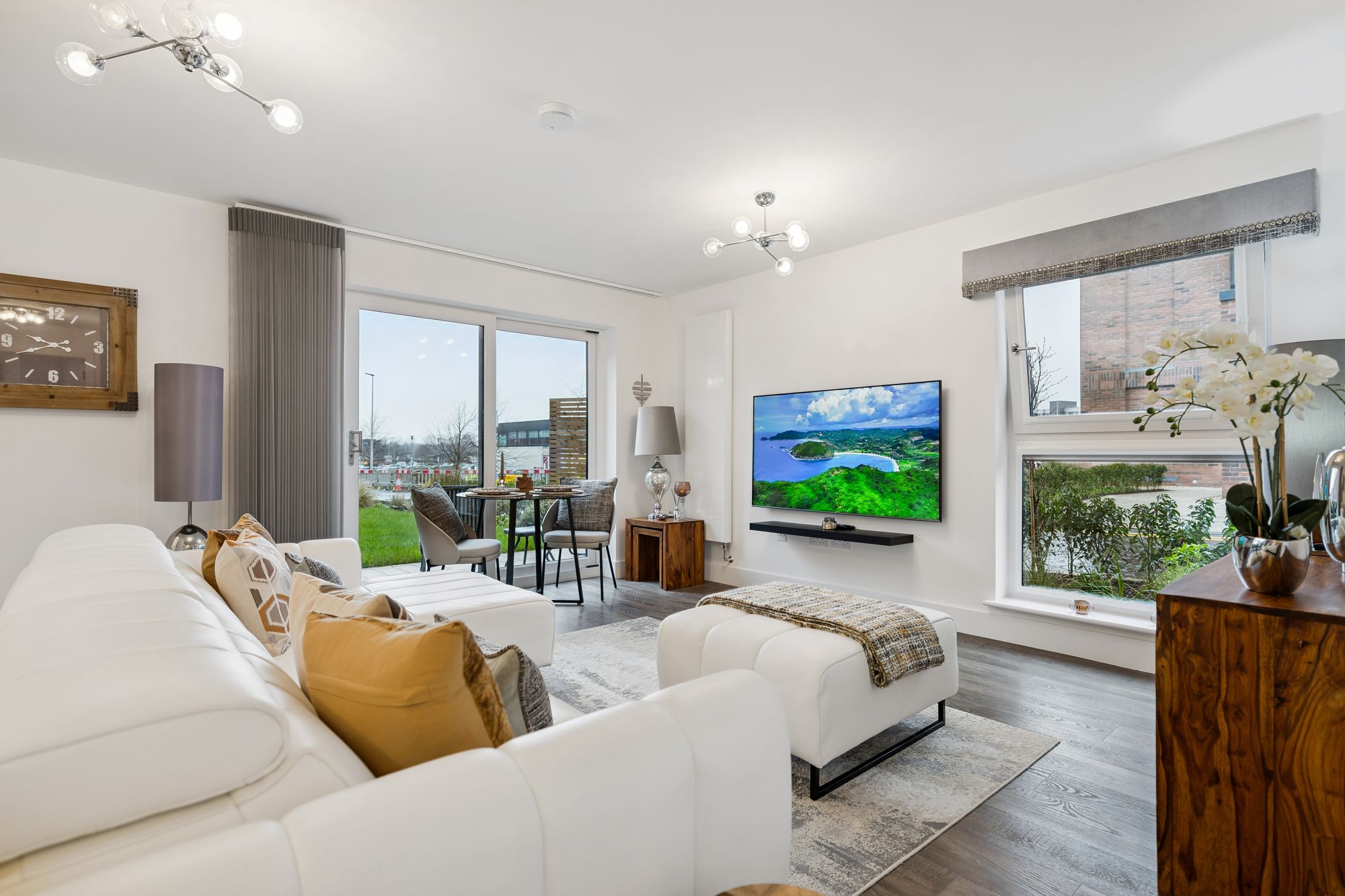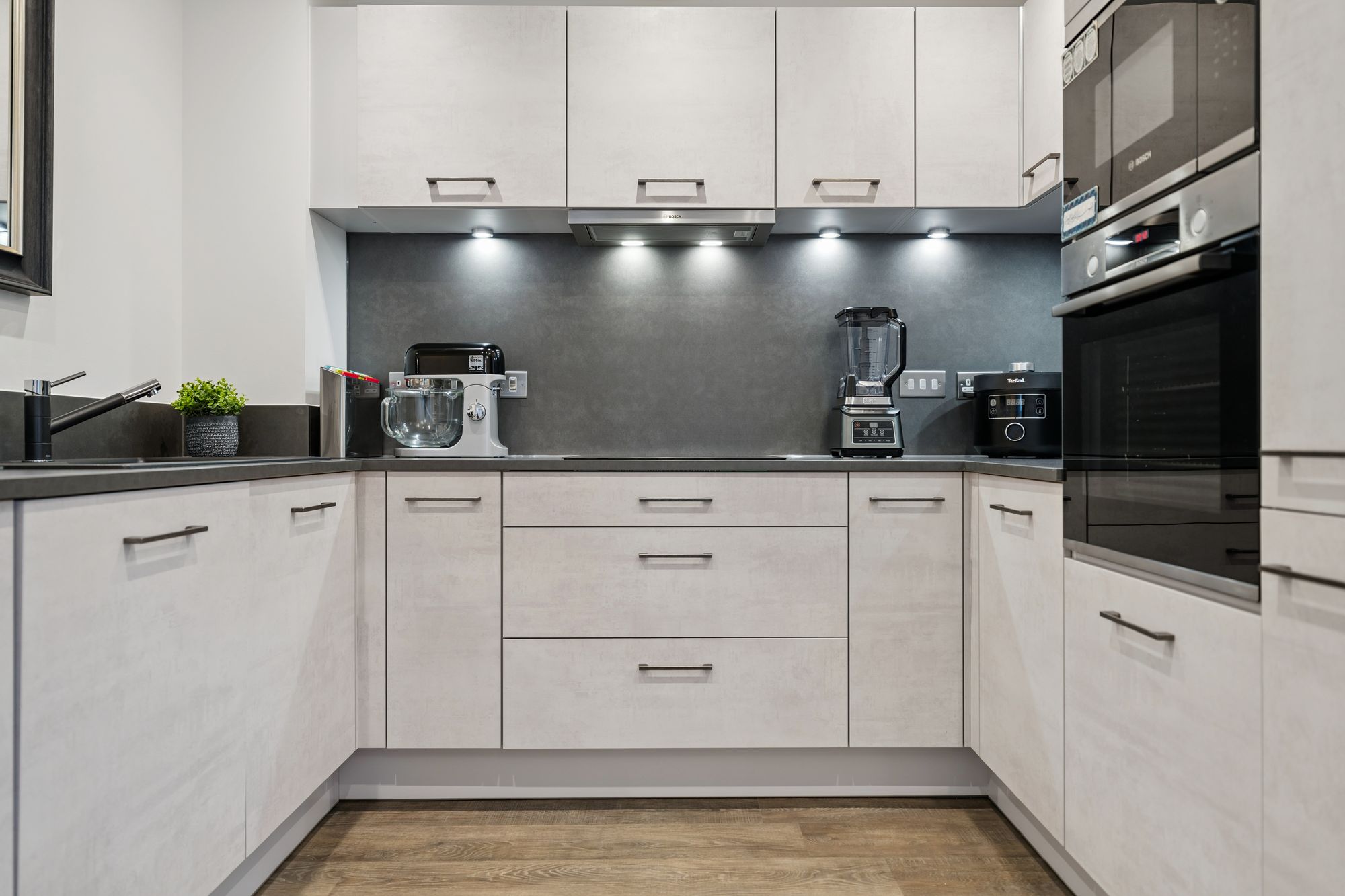 The accommodation comprises entrance hall with large storage cupboard off, bright and spacious open-plan living area, thoughtfully designed for modern living. The generous lounge, kitchen and dining space is flooded with natural light from large dual-aspect windows, while patio doors open directly onto the private garden terrace, creating an excellent indoor-outdoor flow. The sleek contemporary kitchen is fitted with quality wall and floor mounted units and a range of integrated appliances. A large storage cupboard, which houses the washing machine and laundry facilities, further enhances the practicality of this well-planned space.