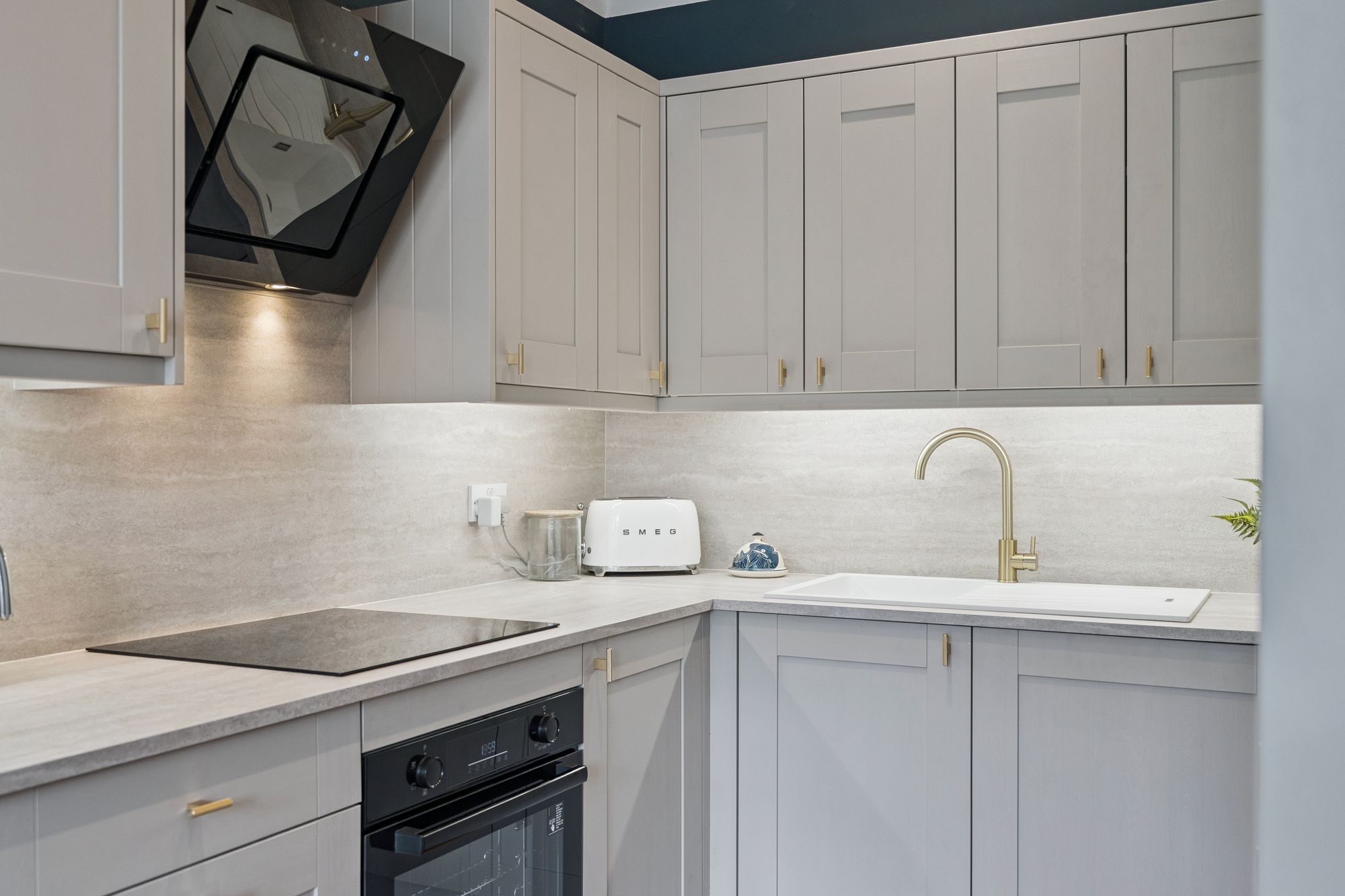 The property is presented in truly ‘as new’ condition, having been completely refurbished internally. The accommodation comprises: a tiled communal entrance, a welcoming reception hall, and a spacious open-plan living/dining/kitchen area featuring a beautiful period fireplace, large bay window, and a newly fitted kitchen. The apartment also offers a generous double bedroom with a charming window seat beneath a double window. The internal accommodation is completed by a stylish galley-style shower room, newly fitted with a full-size shower cubicle and contemporary brushed brass accents.