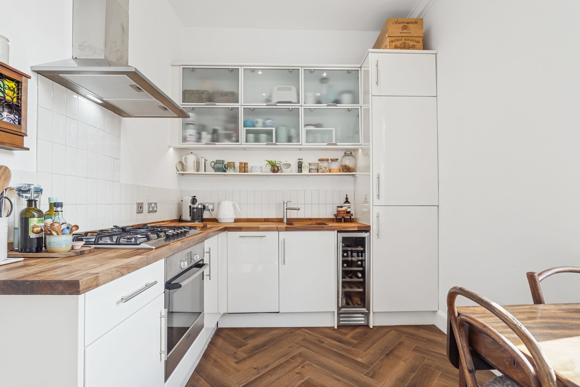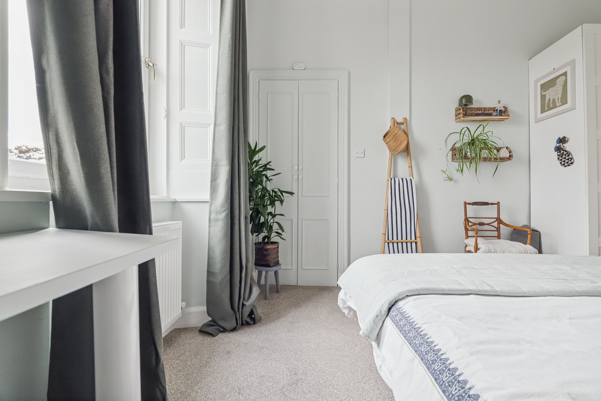 The principal bedroom is a spacious double, beautifully finished with period details and bespoke built-in wardrobes. The second bedroom is also a well-proportioned double, complete with integrated storage. A versatile box room offers excellent flexibility - ideal as a home office, dressing room, or snug.