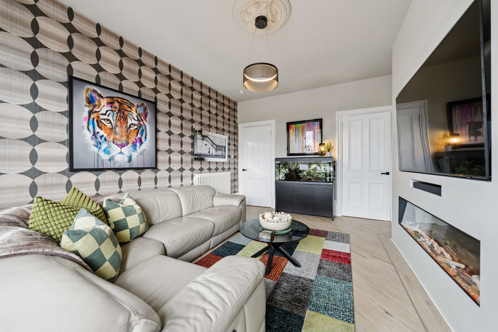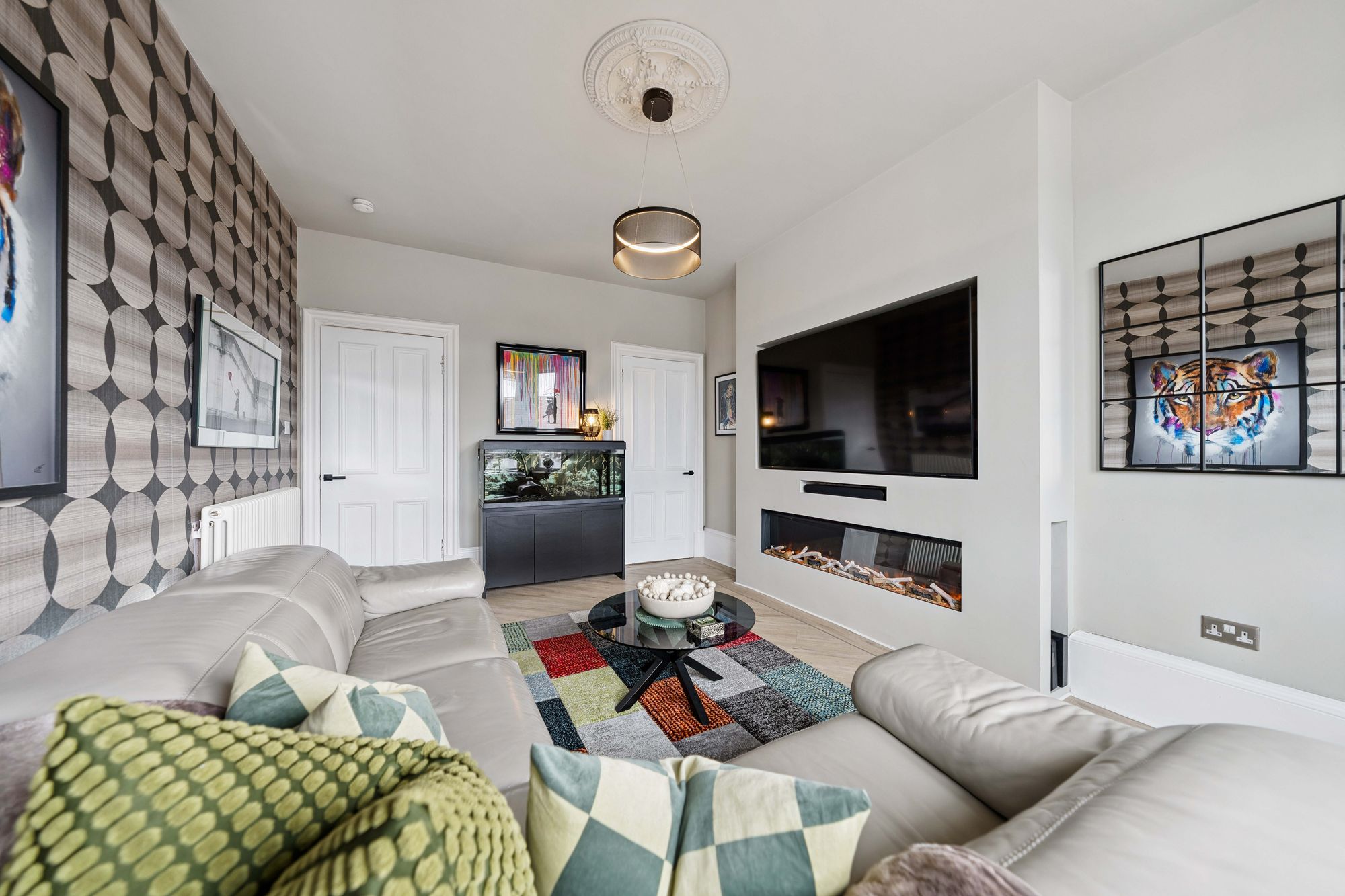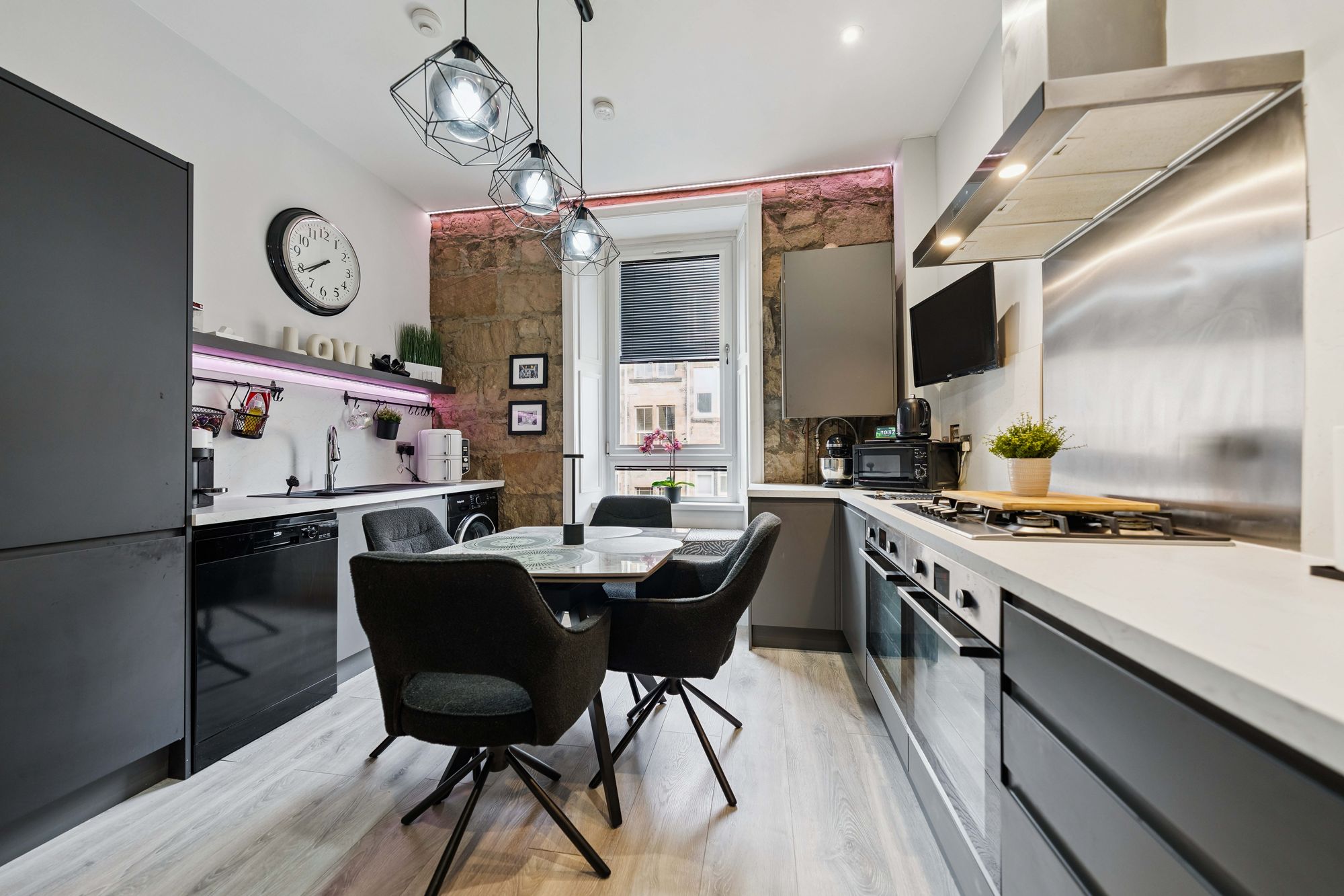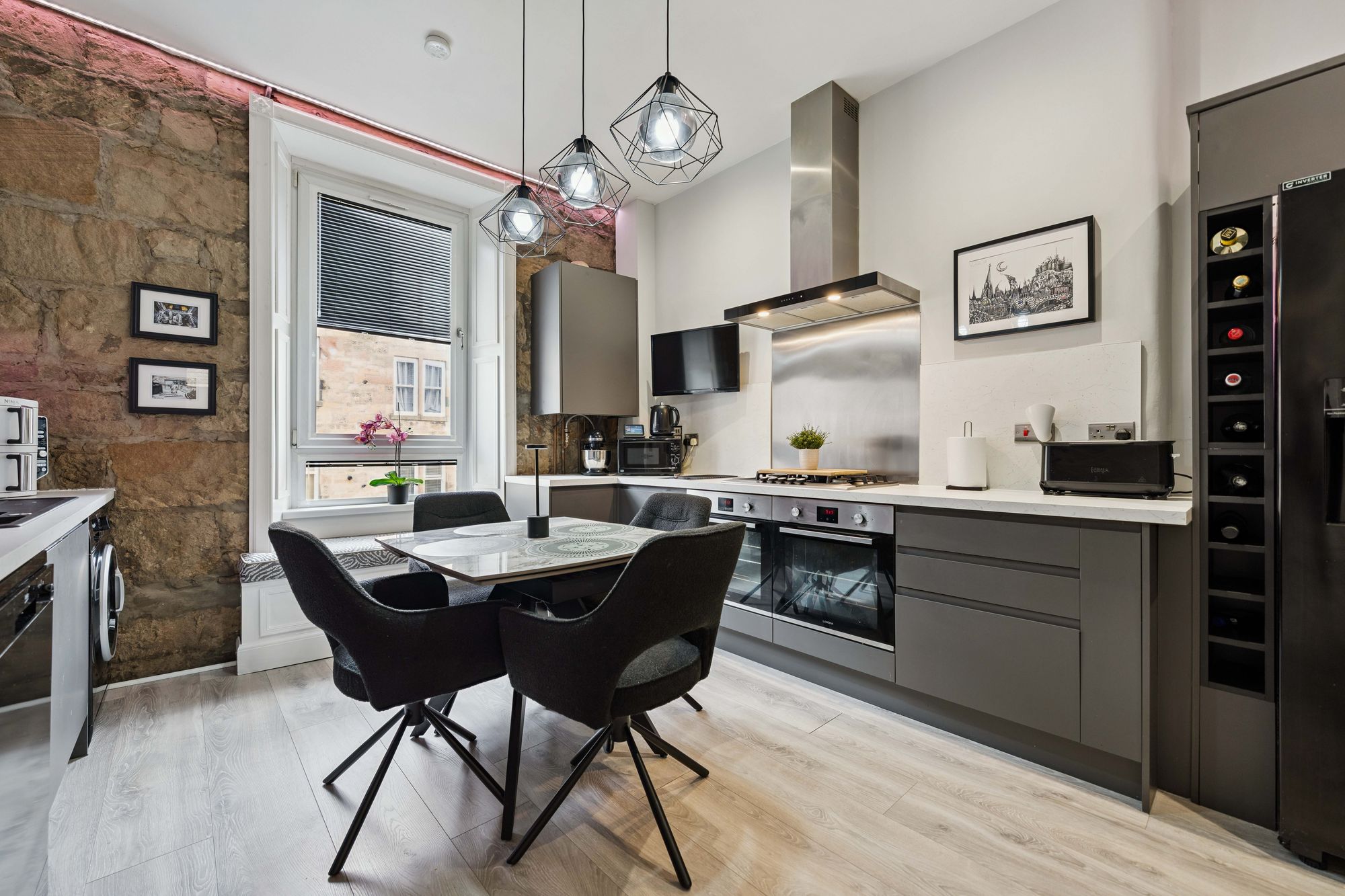 At the heart of the home lies a truly impressive dining kitchen, designed with both style and functionality in mind. A striking exposed stone wall adds character, while a range of sleek base and wall-mounted units, integrated appliances, premium underfloor heating, delivering seamless warmth and elevated comfort and ample space for dining make this a standout feature of the property.