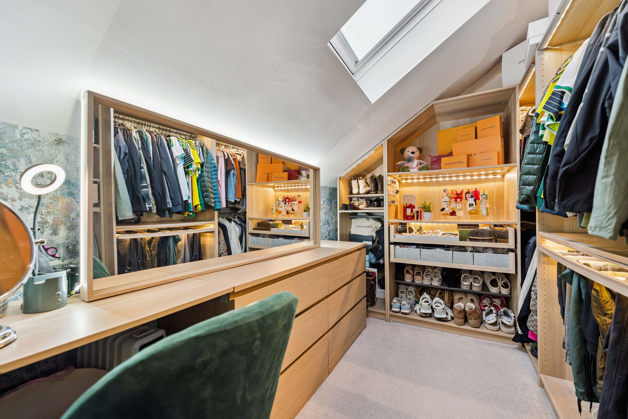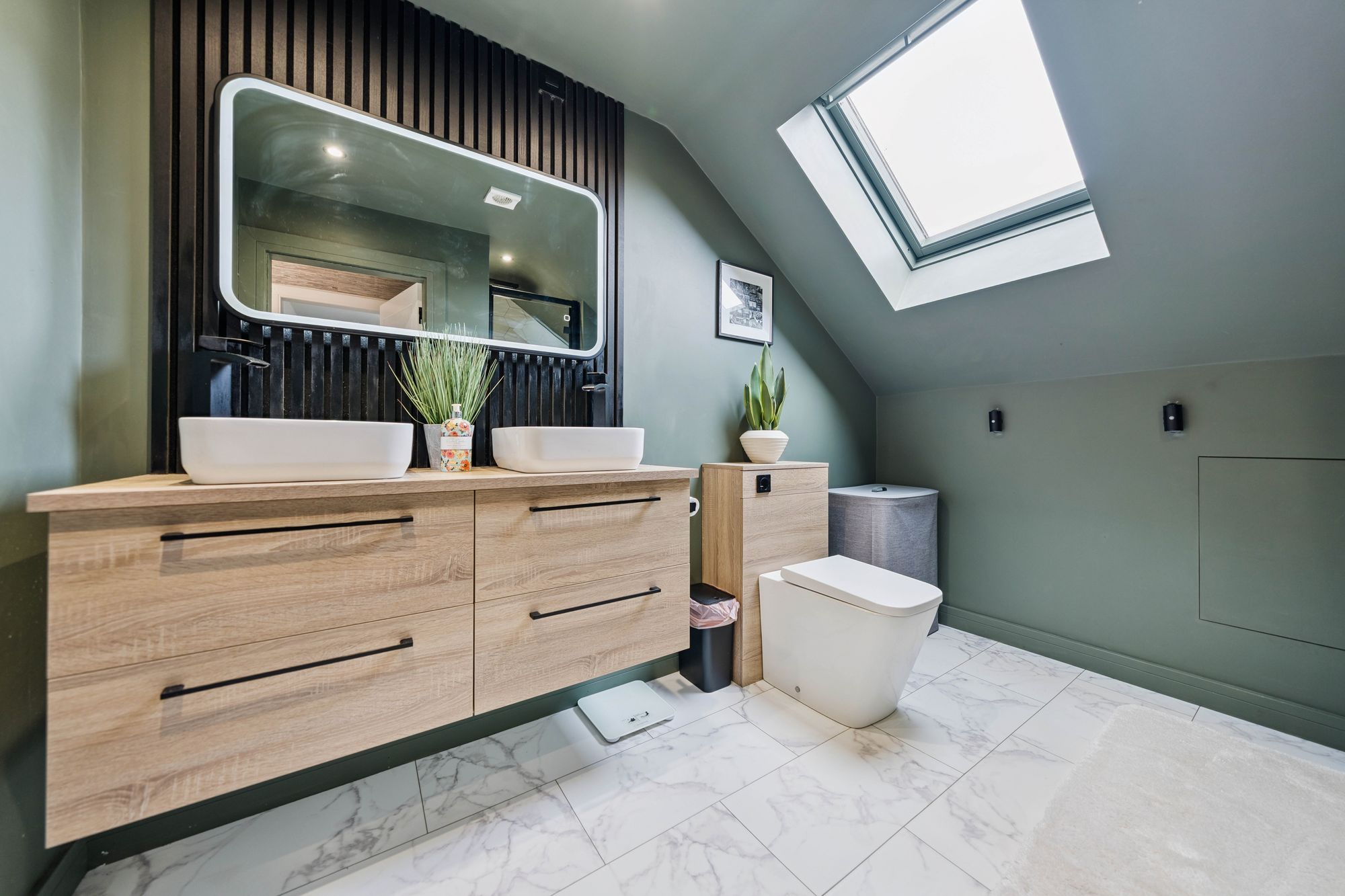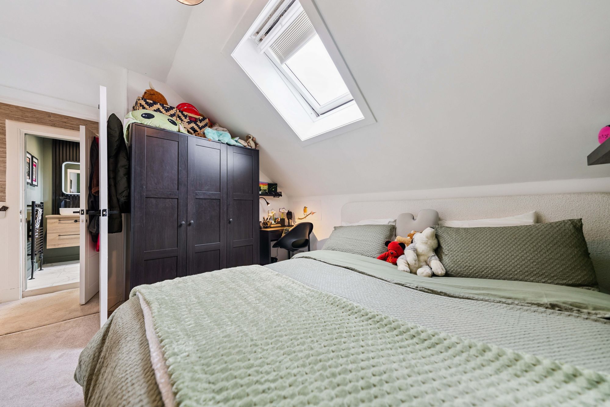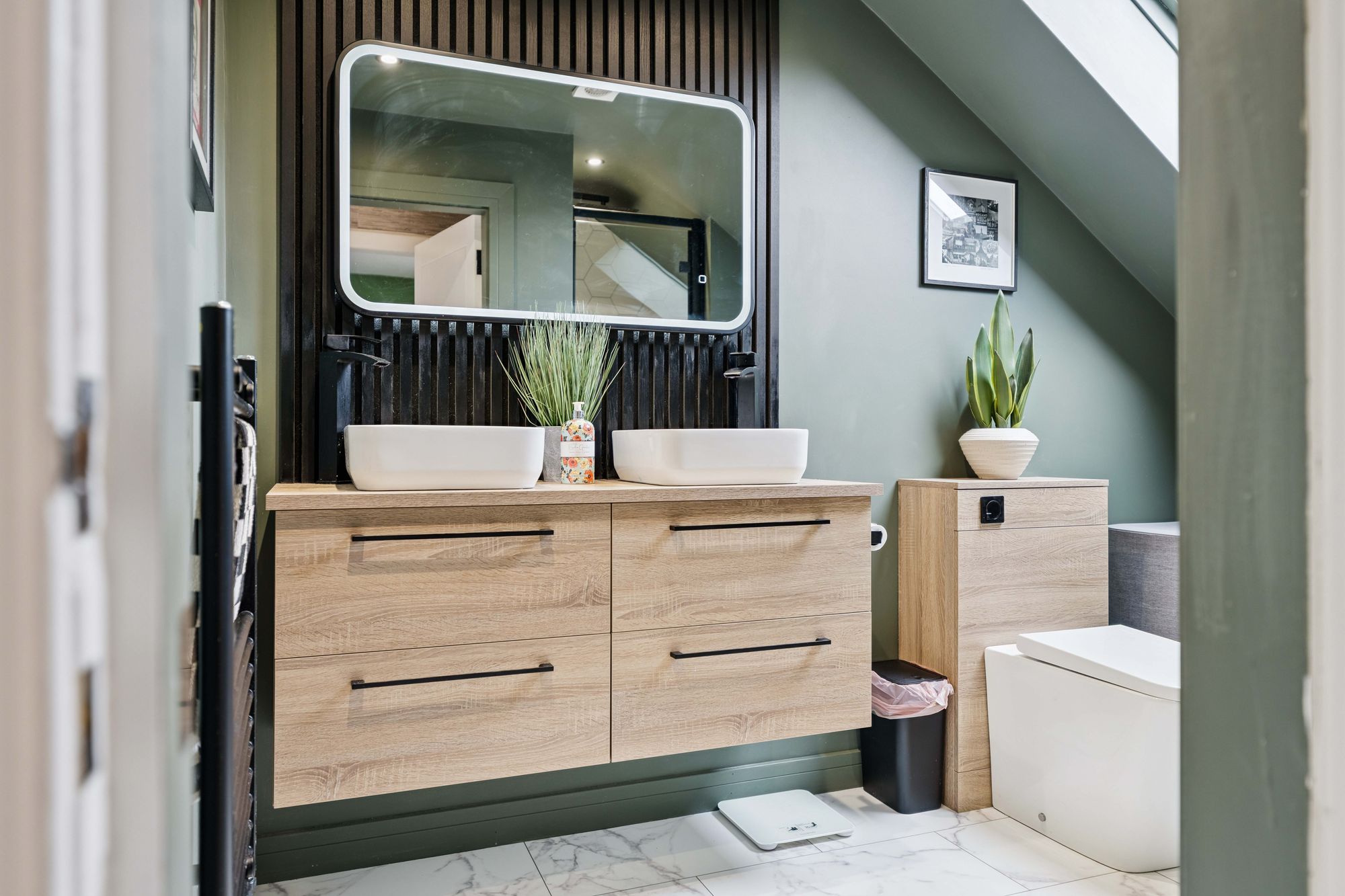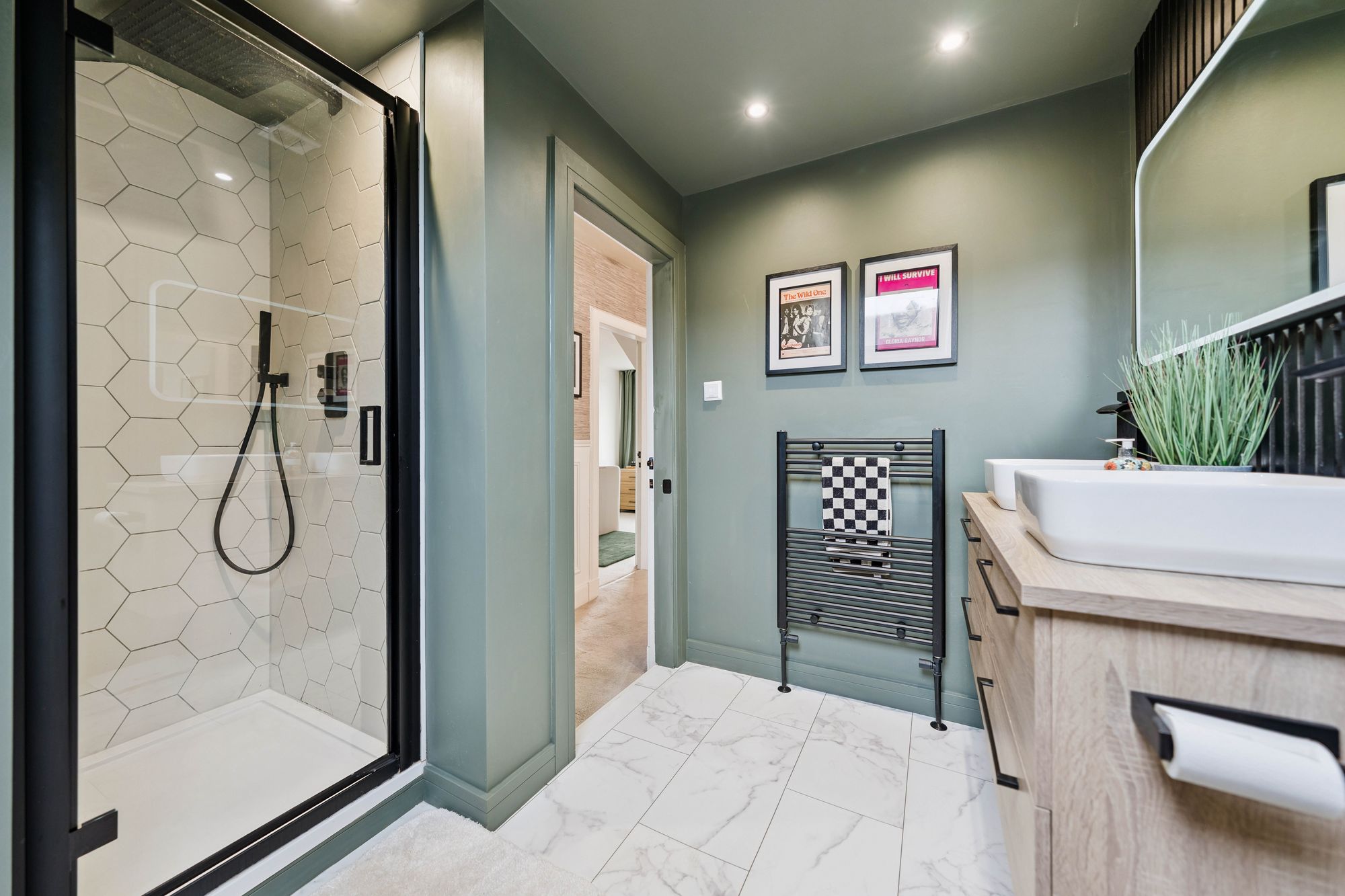 A staircase leads to the upper level, where the sense of space continues. Here, two excellent double bedrooms provide superb flexibility, with one boasting a particularly impressive walk-in wardrobe, perfectly suited to modern living. This level is served by a stylish bathroom featuring underfloor heating, a large walk-in shower enclosure, WC, and twin basins, creating a luxurious and practical space.