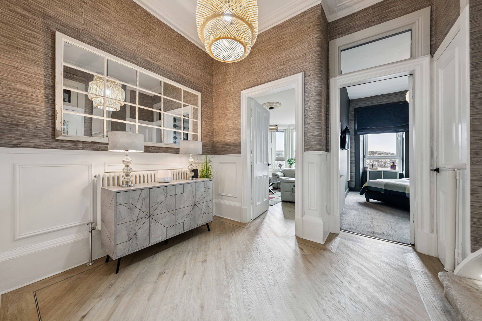 The lower level further comprises a beautifully appointed main bathroom with a contemporary three-piece suite, including a bath, and a generously proportioned principal bedroom to the front.