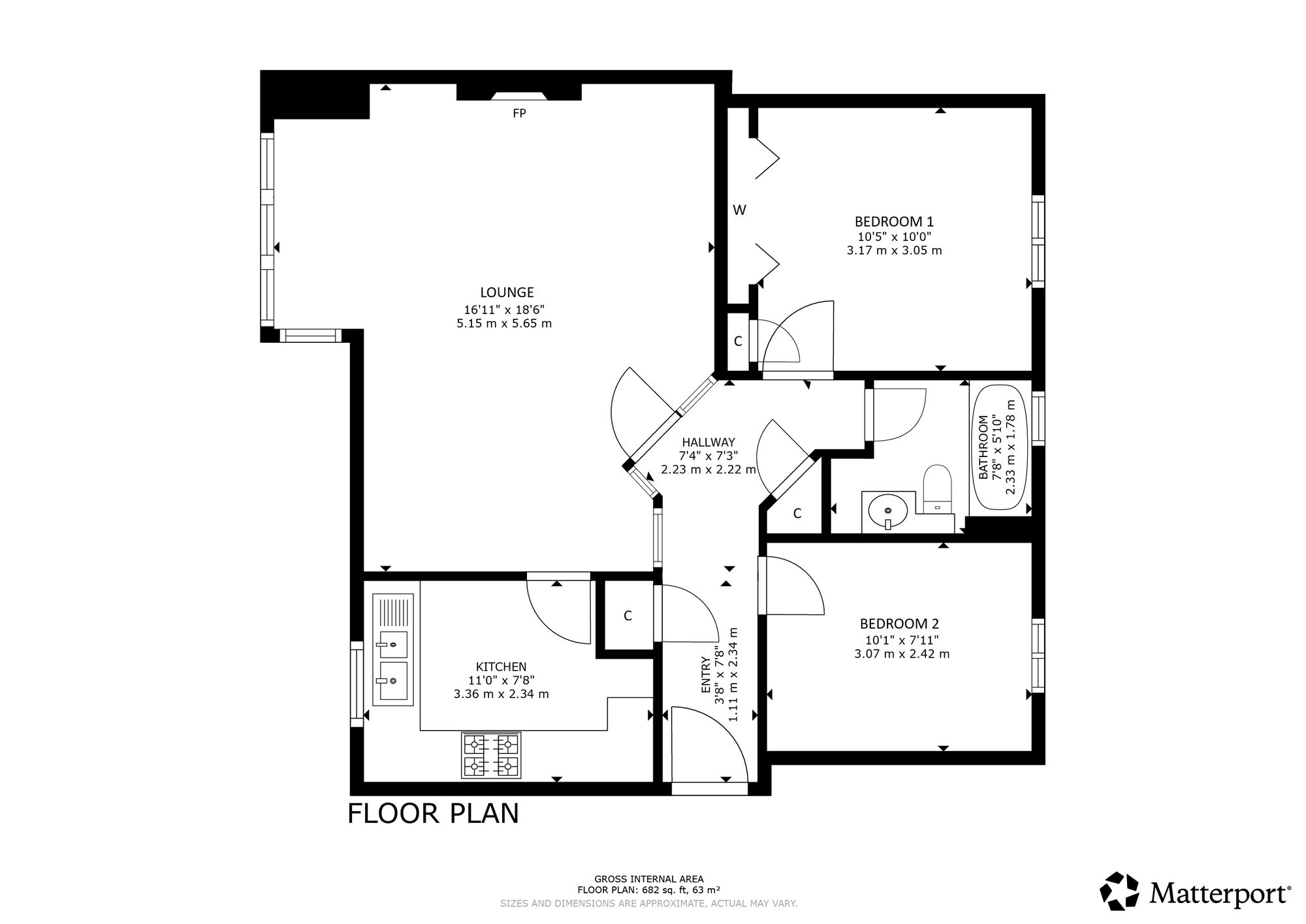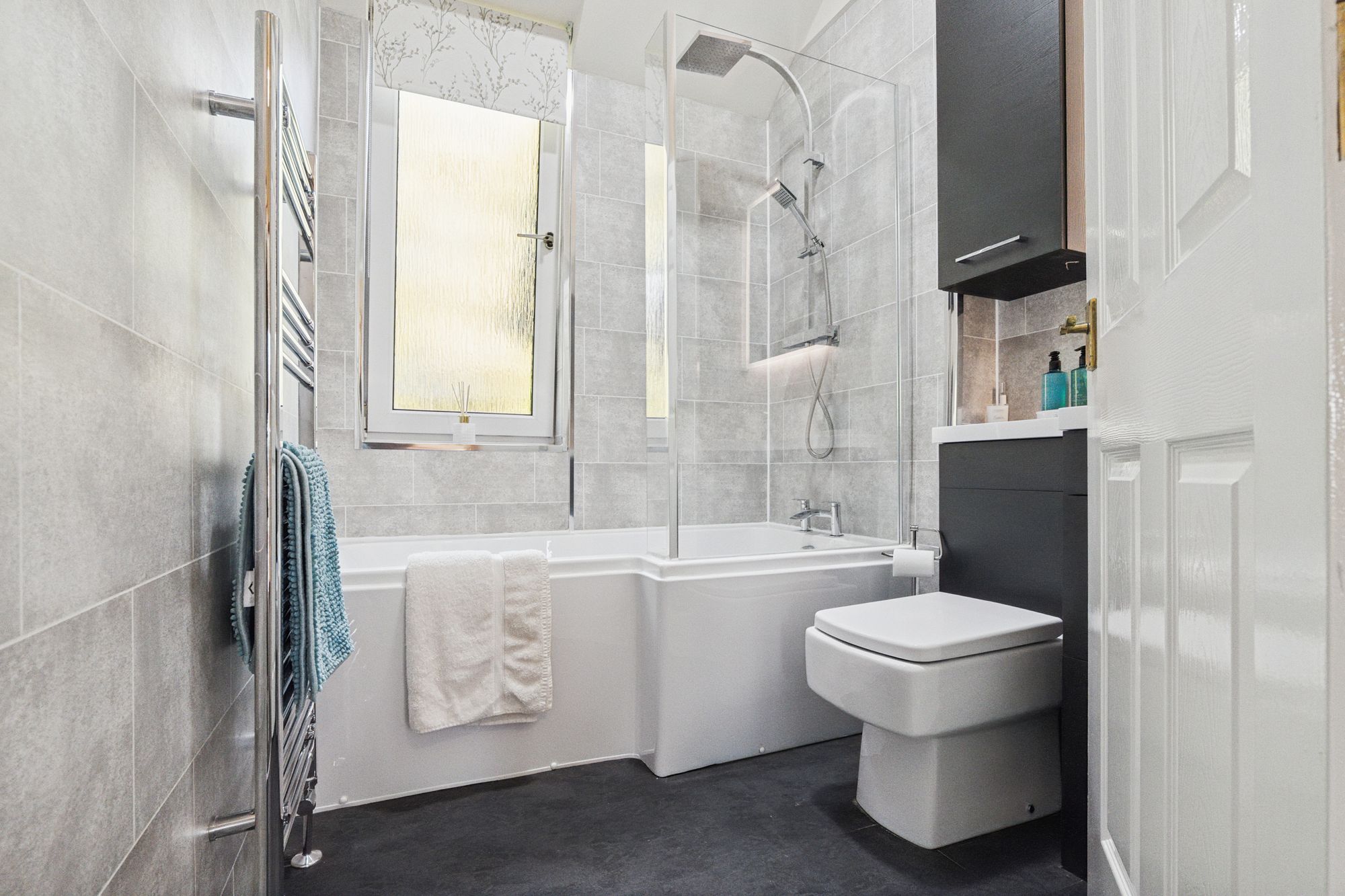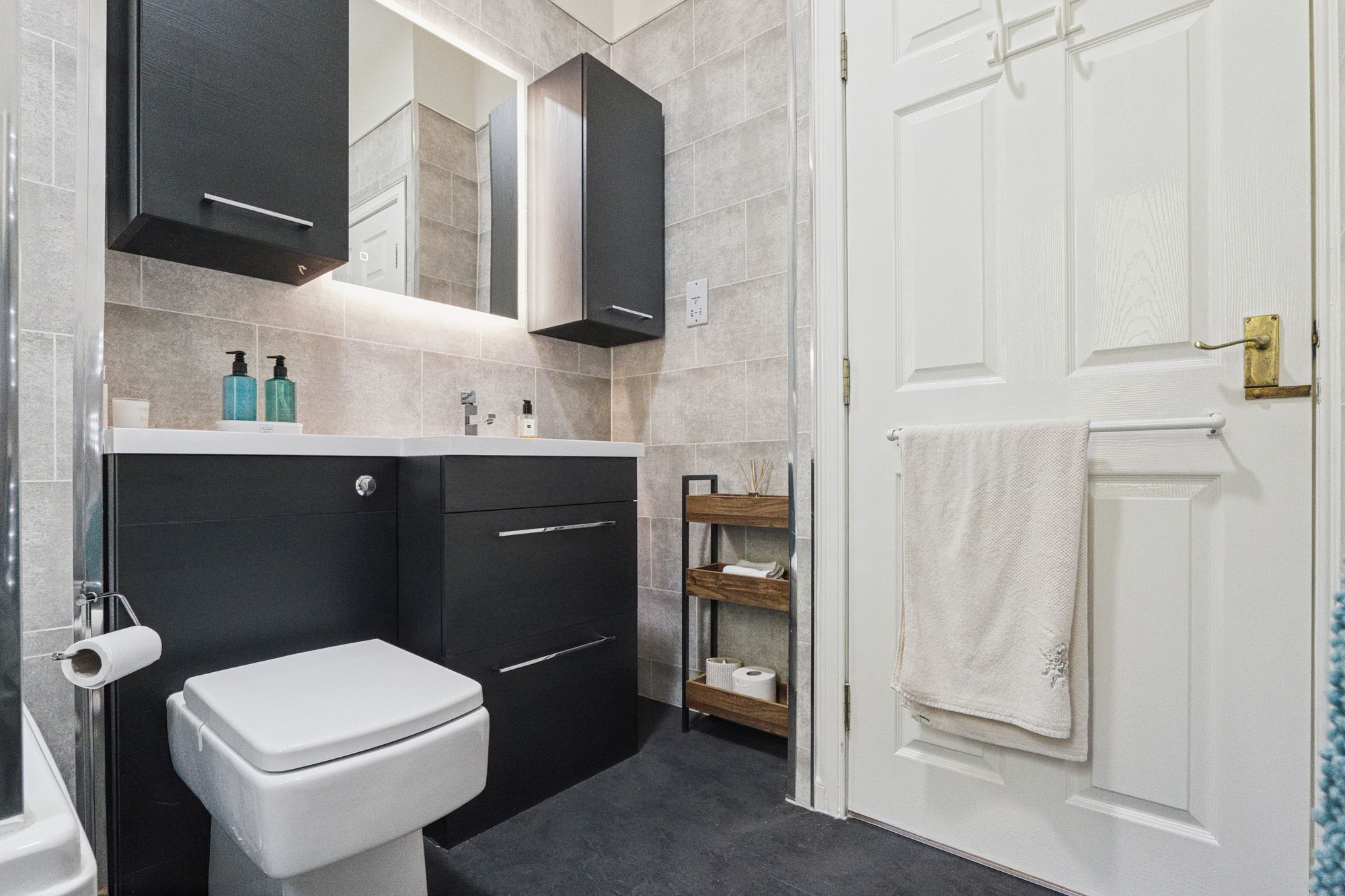 Internally, the apartment consists of a large entrance hall with double doors leading you to a bright open lounge. The lounge benefits from a full height double glazed window offering open aspects to the front and a charming fireplace with timber mantelpiece and a gas coal-effect fire at its focal point. The kitchen is modern and spacious, fitted with a range of wall and floor mounted units, offering ample storage. There is a large picture window, allowing plenty of natural light to flood the room and offering beautiful views across Helensburgh. Moving to the modern master bedroom, the space includes a built in wardrobe and additional cupboard, perfect for storage. There are two additional cupboards in the hallway, providing useful storage also. The second bedroom is also contemporary in design and spacious enough to fit a double bed, but could also be used as office space. Finally, the bathroom is finished to a very high standard and includes, bath with shower overhead, wash hand basin and wc. The windows throughout the property are double glazed and there is full central heating.