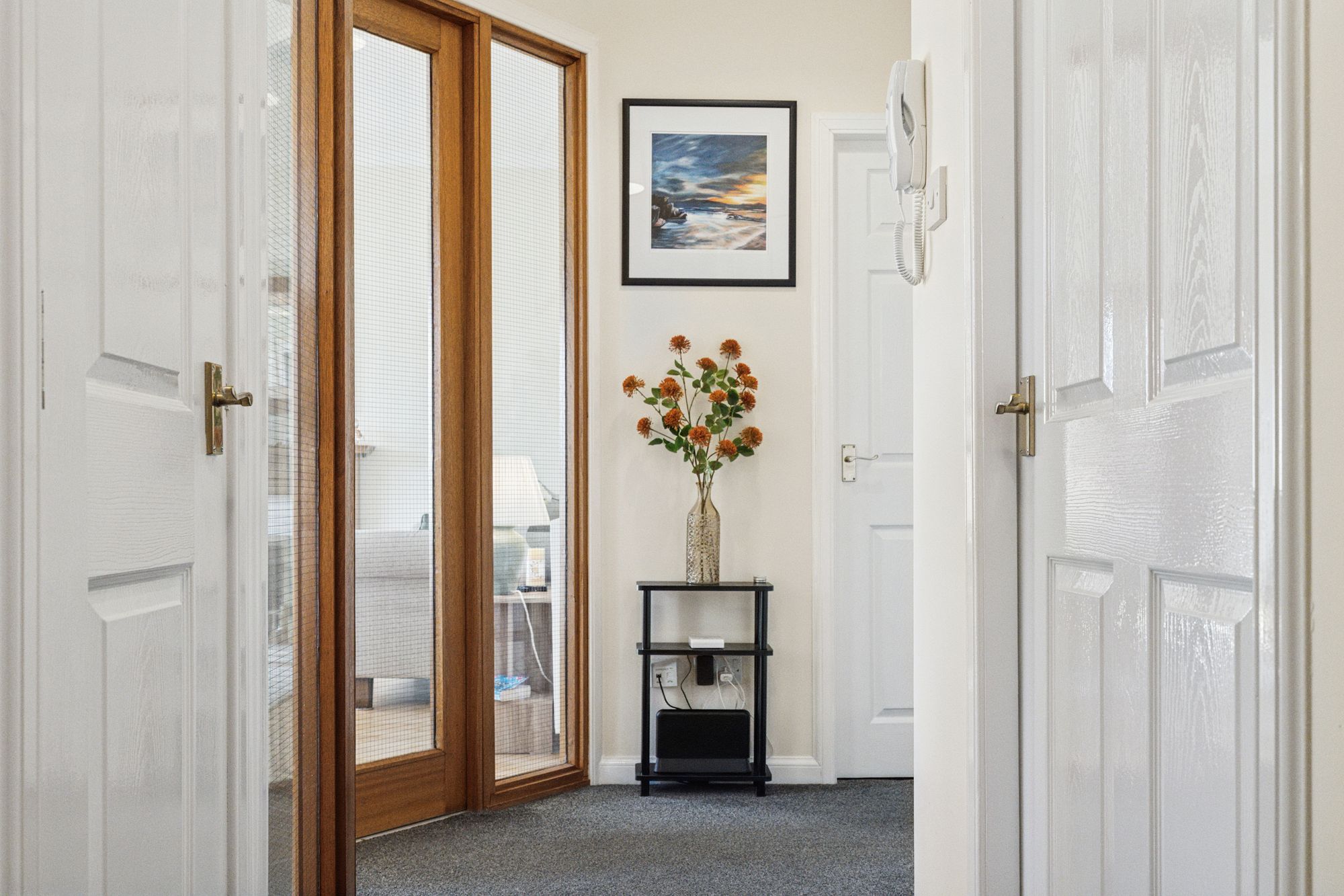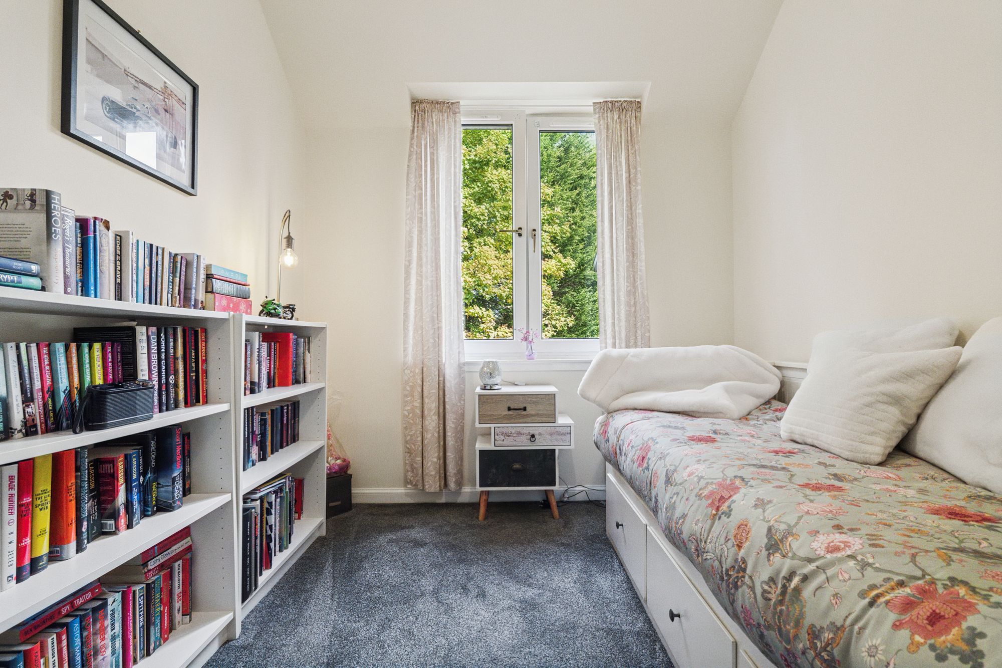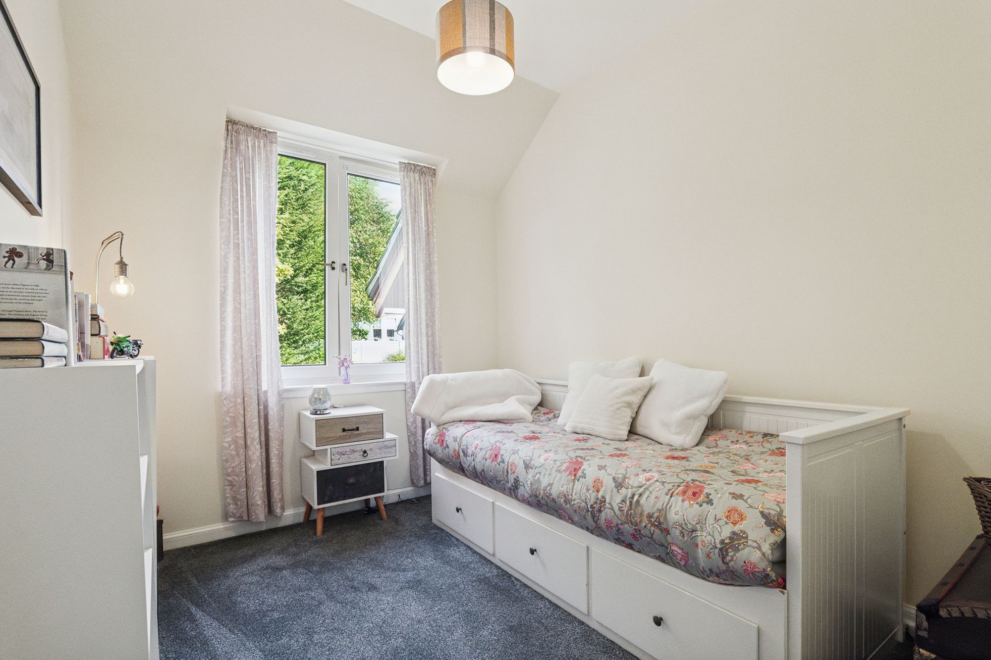 Externally, the property benefits from a tandem sized garage and is located to the rear of a neighbouring block, and accessed via a metal up-and-over door. The building itself sits low to the road at the front, with paved pathways, a brick retaining wall, and a small bordered garden area. A sloping surfaced drive leads to the rear parking area and garage access. There are communal garden grounds on either side of the development, with a notable feature being a timber bridge and decking area over a small burn next to the leftmost block, creating an attractive and peaceful setting. Access to the property is gained via a communal close with secure door entry system.