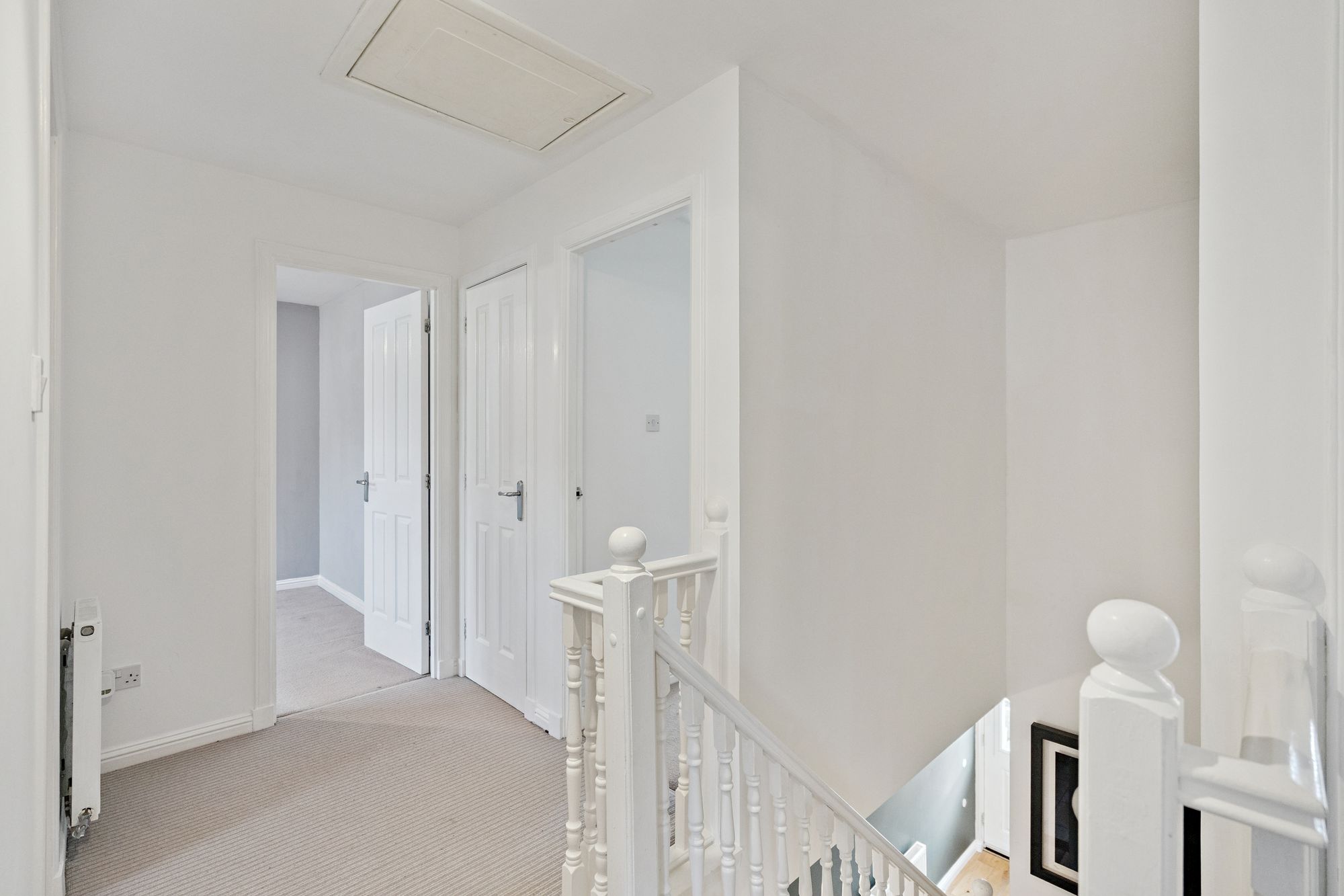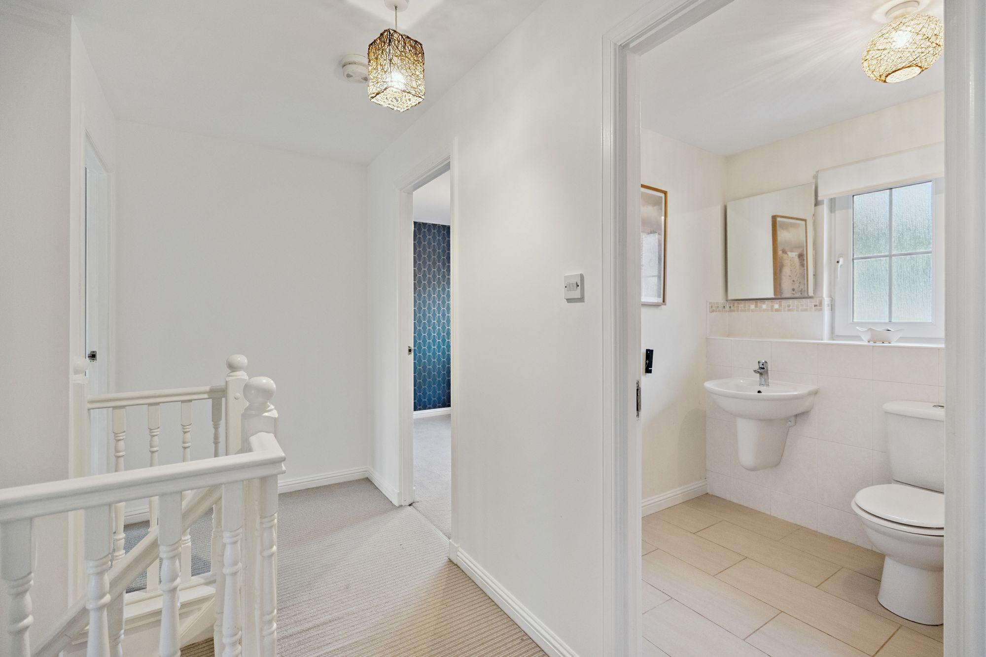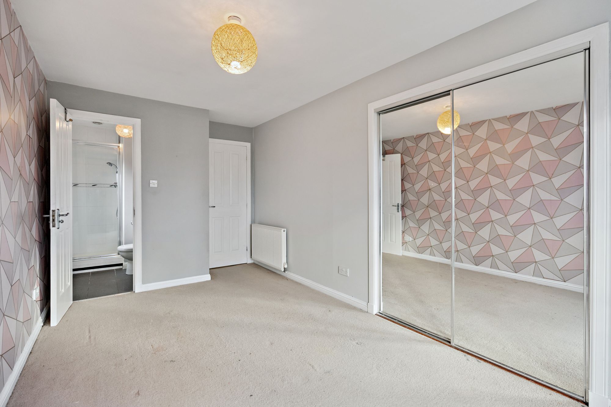 Upstairs, the property continues to impress with well-proportioned accommodation. There are four bedrooms in total, including three generous doubles and one single, all benefitting from fitted wardrobes. The principal bedroom enjoys its own ensuite shower room, while the guest bedroom also features ensuite facilities, providing comfort and privacy for visitors or older children. The remaining bedrooms are served by a contemporary family bathroom accessed from the upper hall.