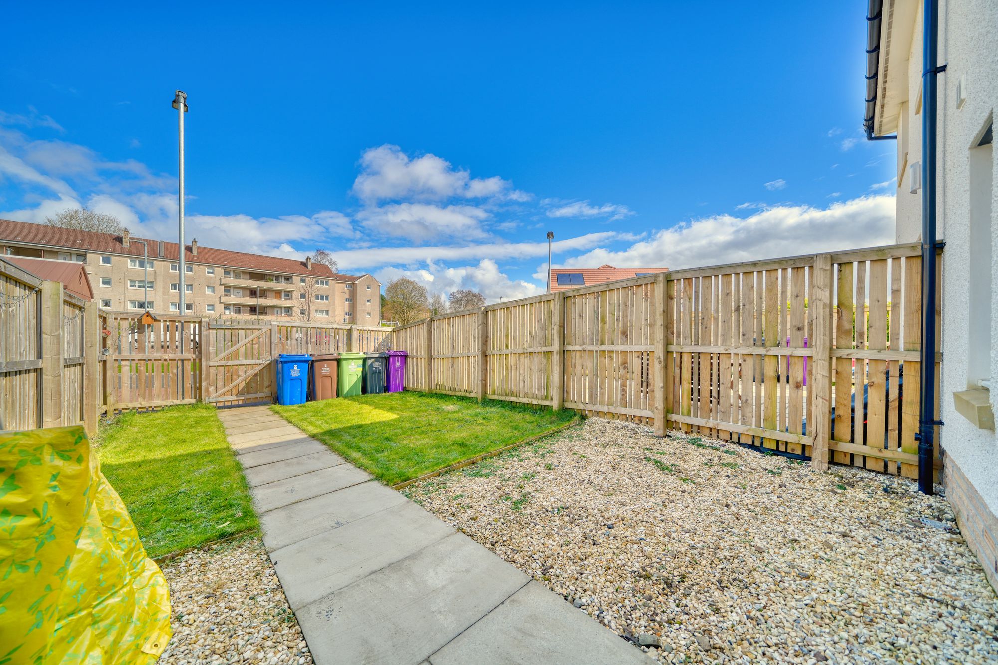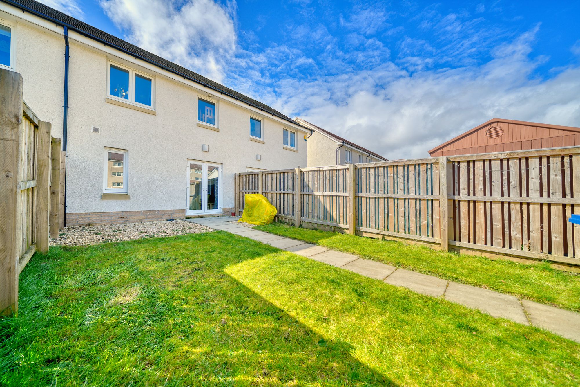 Externally, the property enjoys a fully enclosed and level rear garden, attractively arranged with areas of lawn and stone chippings. This private, low‑maintenance outdoor space is ideal for children, pets, entertaining and everyday relaxation.