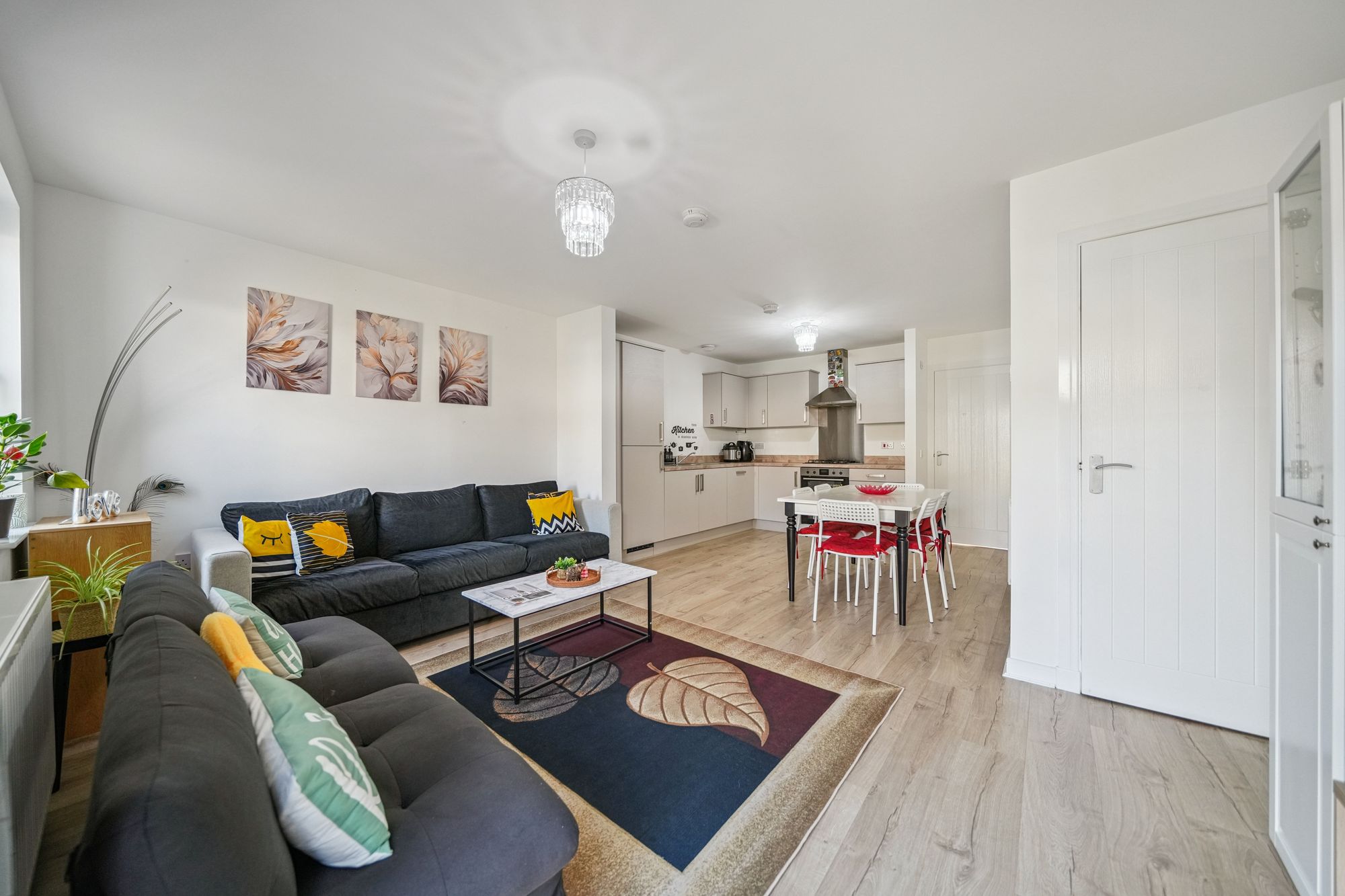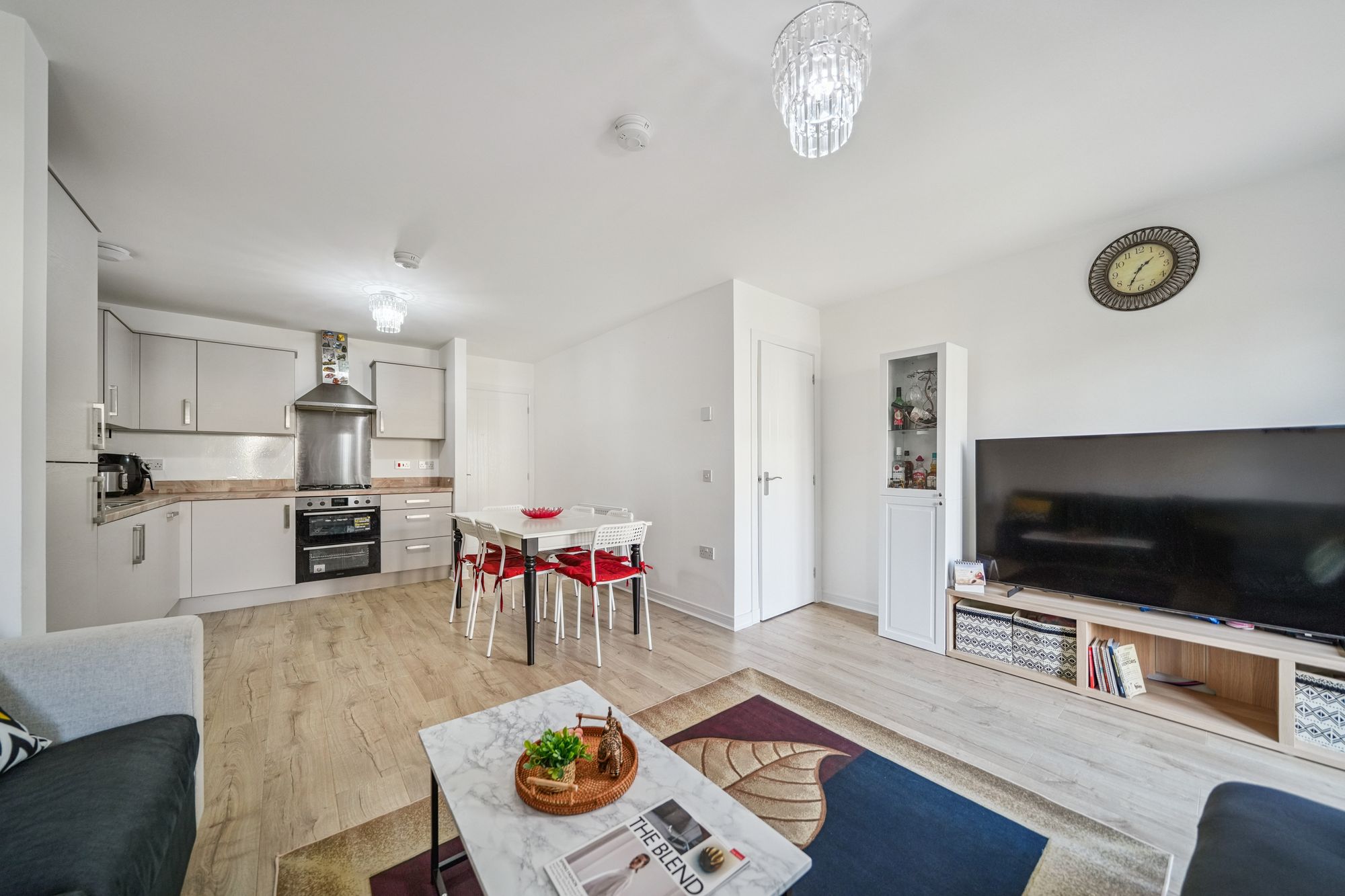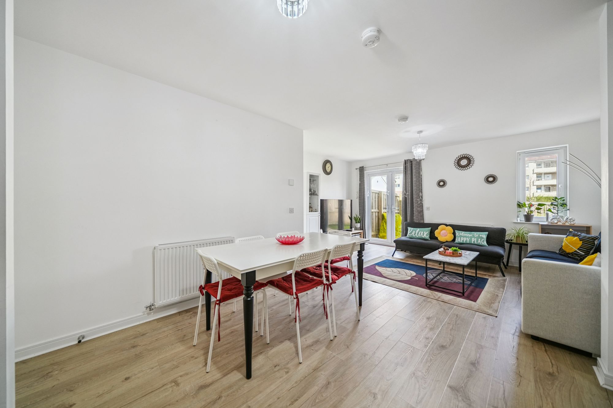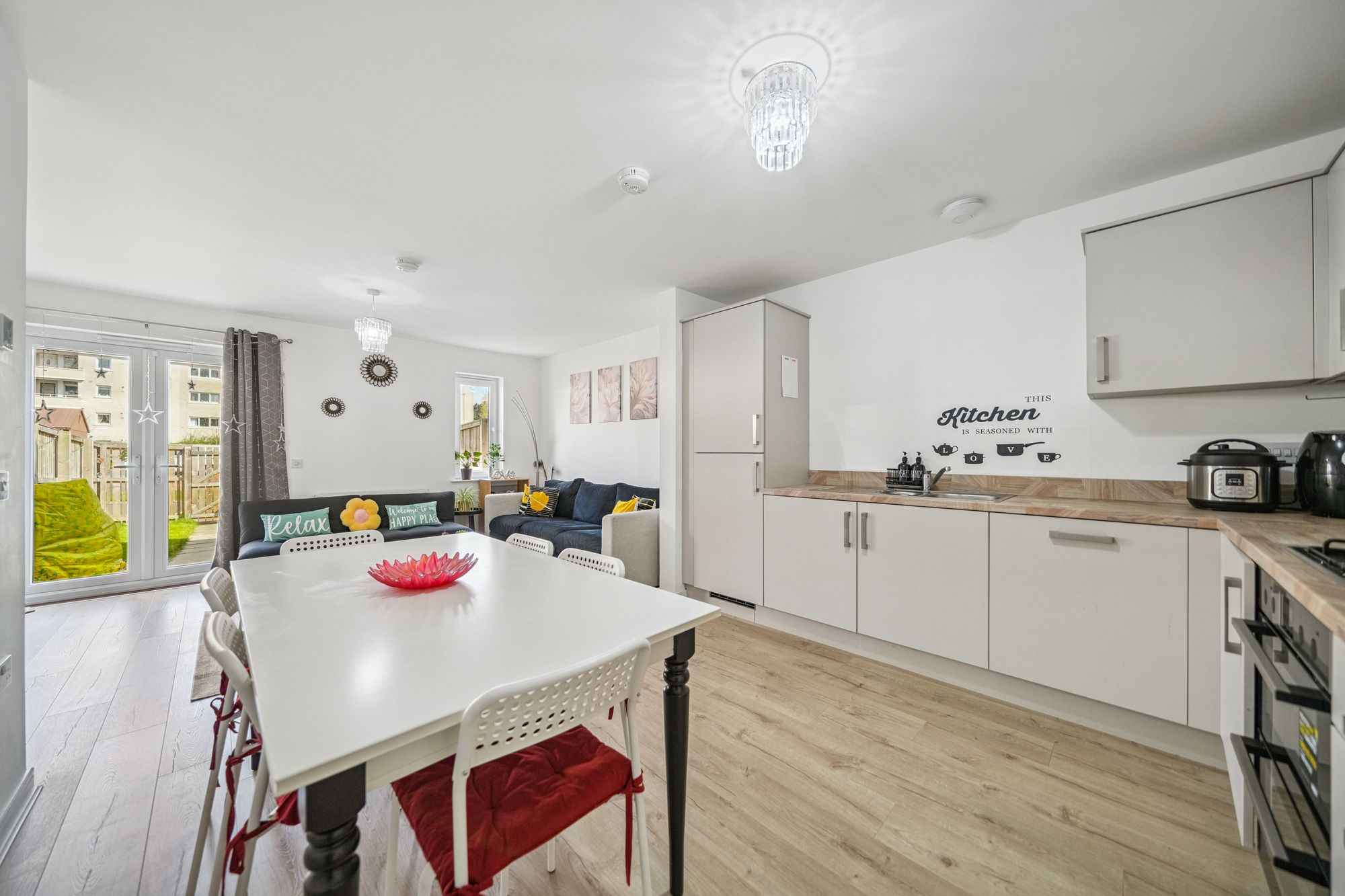 Immediately impressive upon entry, the home showcases a bright, contemporary interior finished in tasteful neutral tones throughout. The ground floor has been thoughtfully designed to create an exceptional open‑plan kitchen, dining and living space, forming a true modern family hub. The stylish kitchen is comprehensively fitted with generous worktop and storage provision and flows seamlessly into the dining and sitting areas, making it ideally suited to both everyday living and entertaining. Abundant natural light is provided by a window and elegant French door formation, which opens directly onto the rear garden and enhances the sense of space. A generously sized storage cupboard set off the hallway offers excellent practicality, while a refined cloakroom with modern two‑piece suite completes the ground floor accommodation.