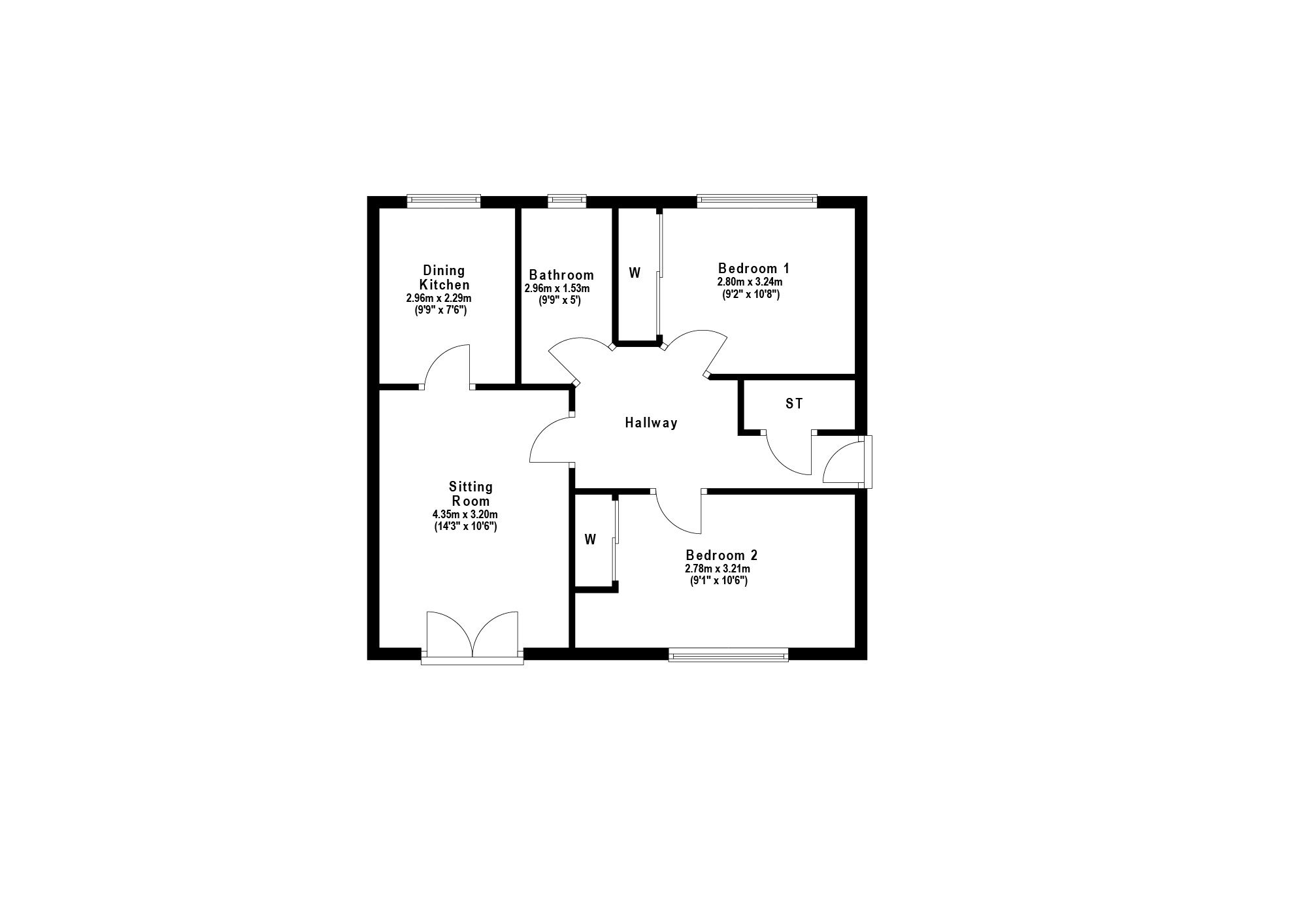 Bedroom Two 9'1” x 10’6” (to robes) 2.77m x 3.20m