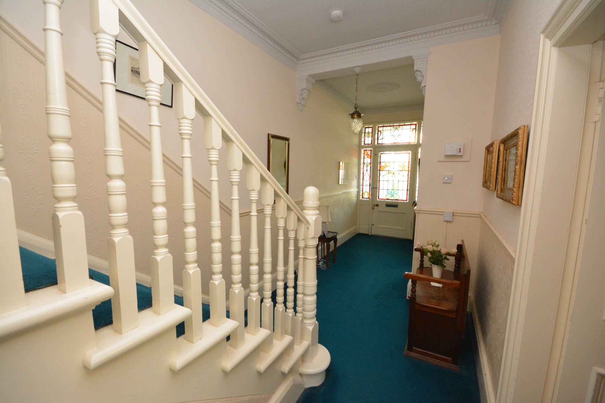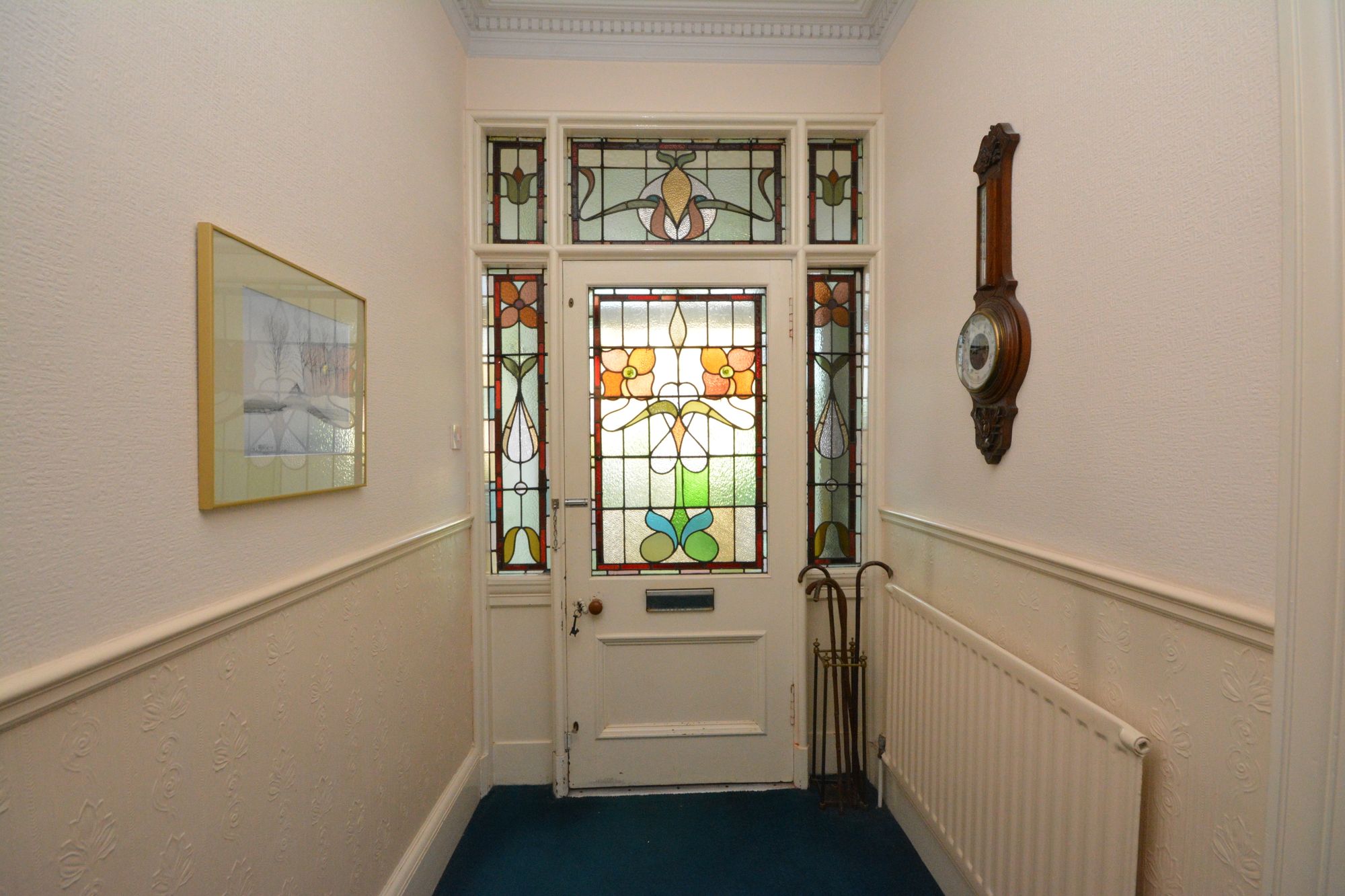A residence of considerable period character this property displays a wealth of intact period features including plaster work cornice, original wood work including pine panel doors and architraves. Access is through an entrance vestibule with original stained glass door and side lights which leads thereon to the impressive reception hallway with original stair case and balustrade. The elegant sitting room has a bay window and fireplace. Further public rooms include a flexible dining room and living/family room with large walk in storage cupboard off. The lower accommodation is completed by a bright kitchen, large utility room, downstairs WC and rear entrance hallway.