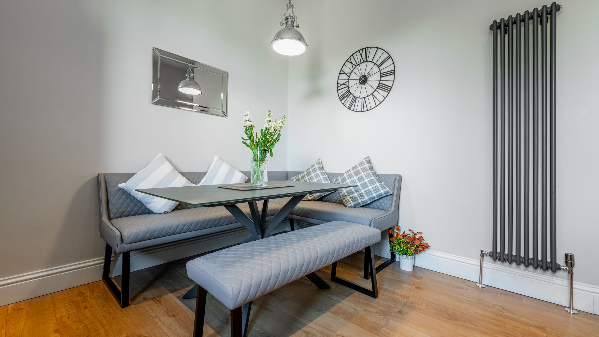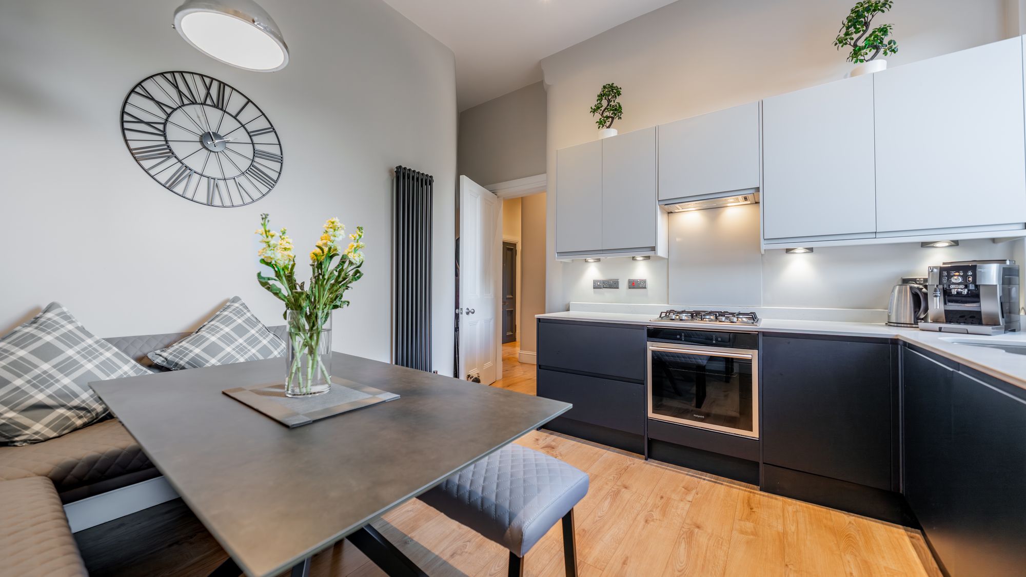 Internally, the apartment is extremely spacious and finished to an impressive standard, offering well-proportioned and attractive living spaces throughout. Upon entry, a welcoming hallway leads to a bright and comfortable lounge, perfect for relaxing or entertaining. The large double bedroom contains built-in fitted wardrobes and offers ample space for furniture. A standout feature of the home is the spectacular dining kitchen, fitted with a range of modern floor and wall-mounted units and integrated appliances, providing a stylish and practical space for cooking and socialising. Completing the accommodation is a beautifully appointed main bathroom featuring a separate walk-in shower and high-quality finishes. Additional features include a generously sized storage cupboard, gas central heating and double-glazed windows throughout.