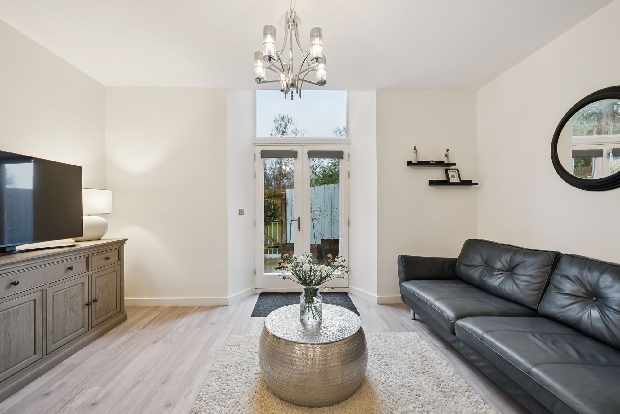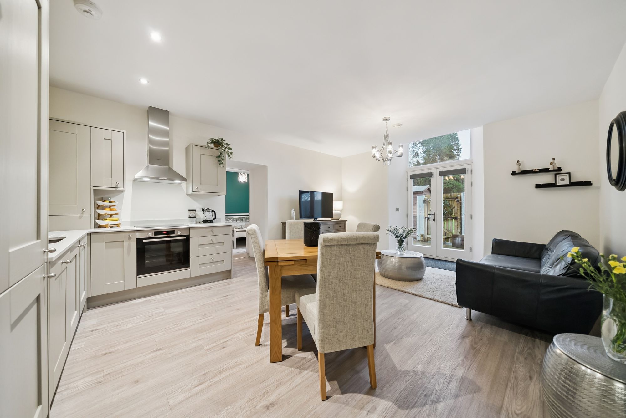 The apartment is generously proportioned and thoughtfully designed. A welcoming reception hall with attractive wooden flooring leads through to a bright and spacious open-plan lounge and contemporary kitchen. This inviting space enjoys a warm, homely atmosphere, with the kitchen finished to a high standard and featuring integrated appliances, ample storage, and space for dining. The lounge area is flooded with natural light via double doors opening directly onto the garden, creating a seamless indoor-outdoor flow ideal for both everyday living and entertaining.
