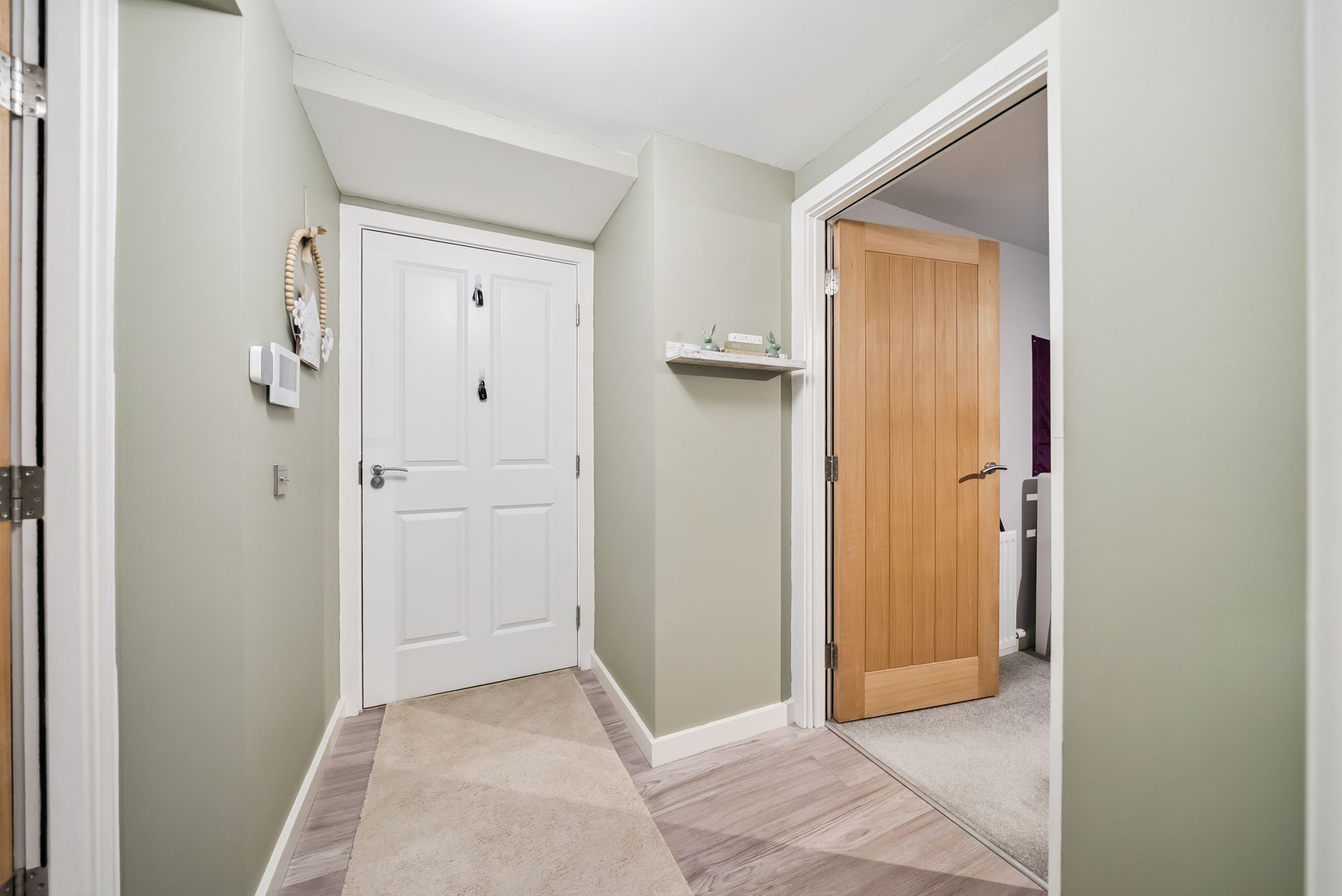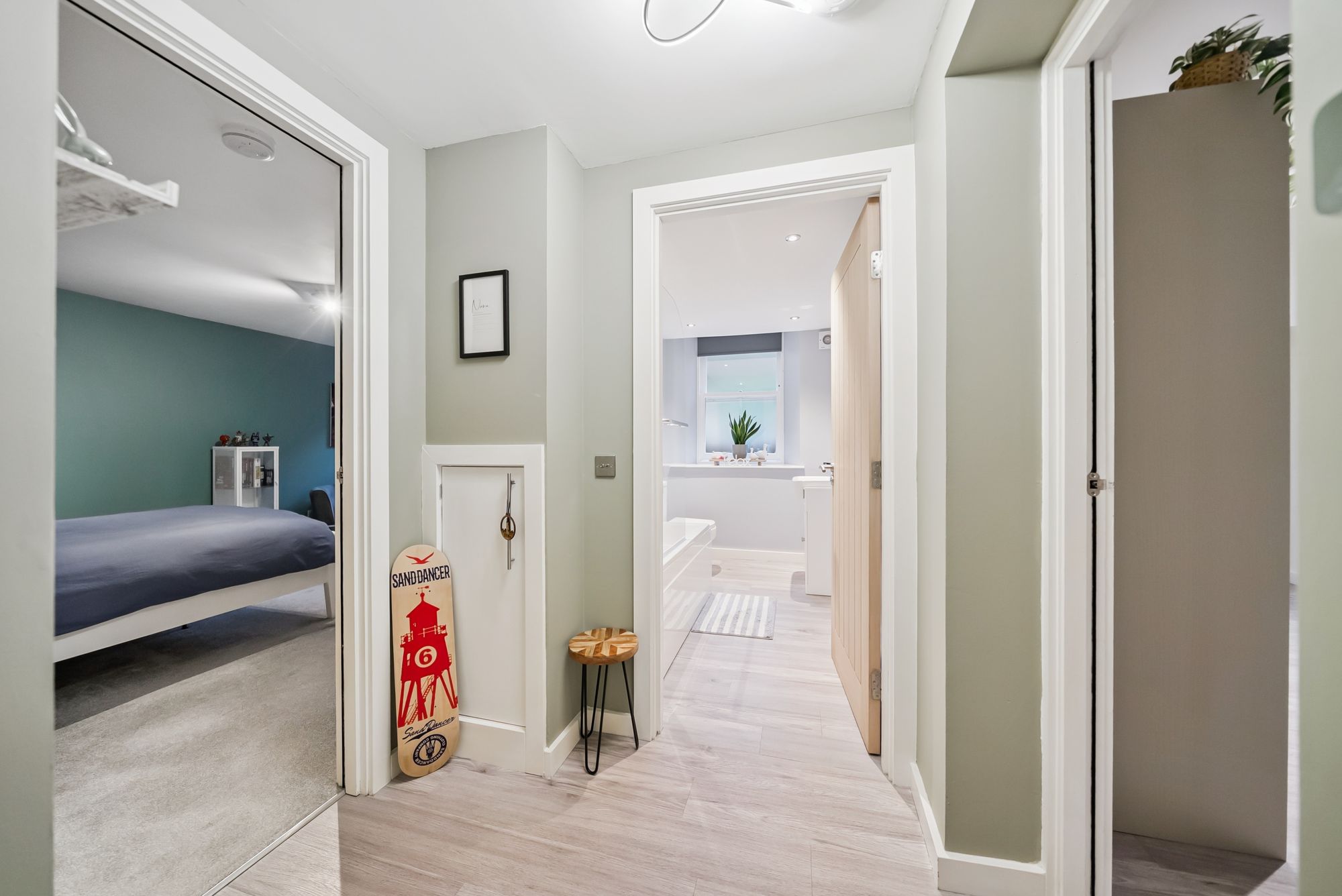 The master bedroom is bright and spacious, benefitting from built-in wardrobes and pleasant garden views, letting in an abundance of natural light. A second double bedroom, also with built-in storage, is tastefully decorated and enjoys similar outlooks. Completing the apartment is a stylish and modern bathroom, finished to a high standard and featuring a bath with overhead shower, wc, and wash hand basin. Quality finishes such as oak internal doors and flowing wooden flooring throughout enhance the sense of cohesion and quality.
