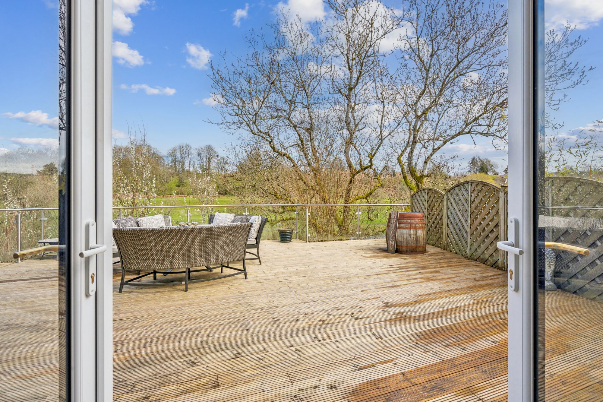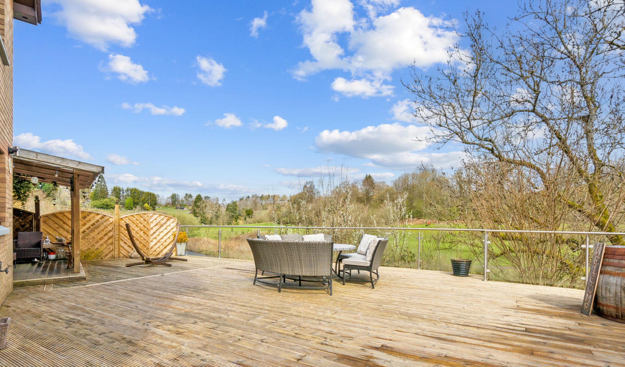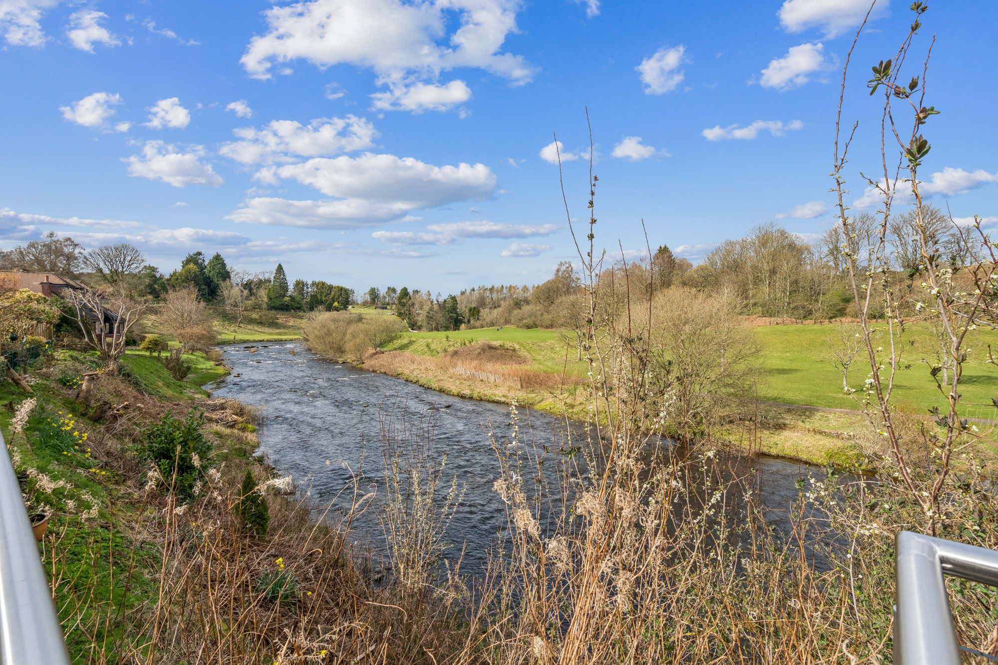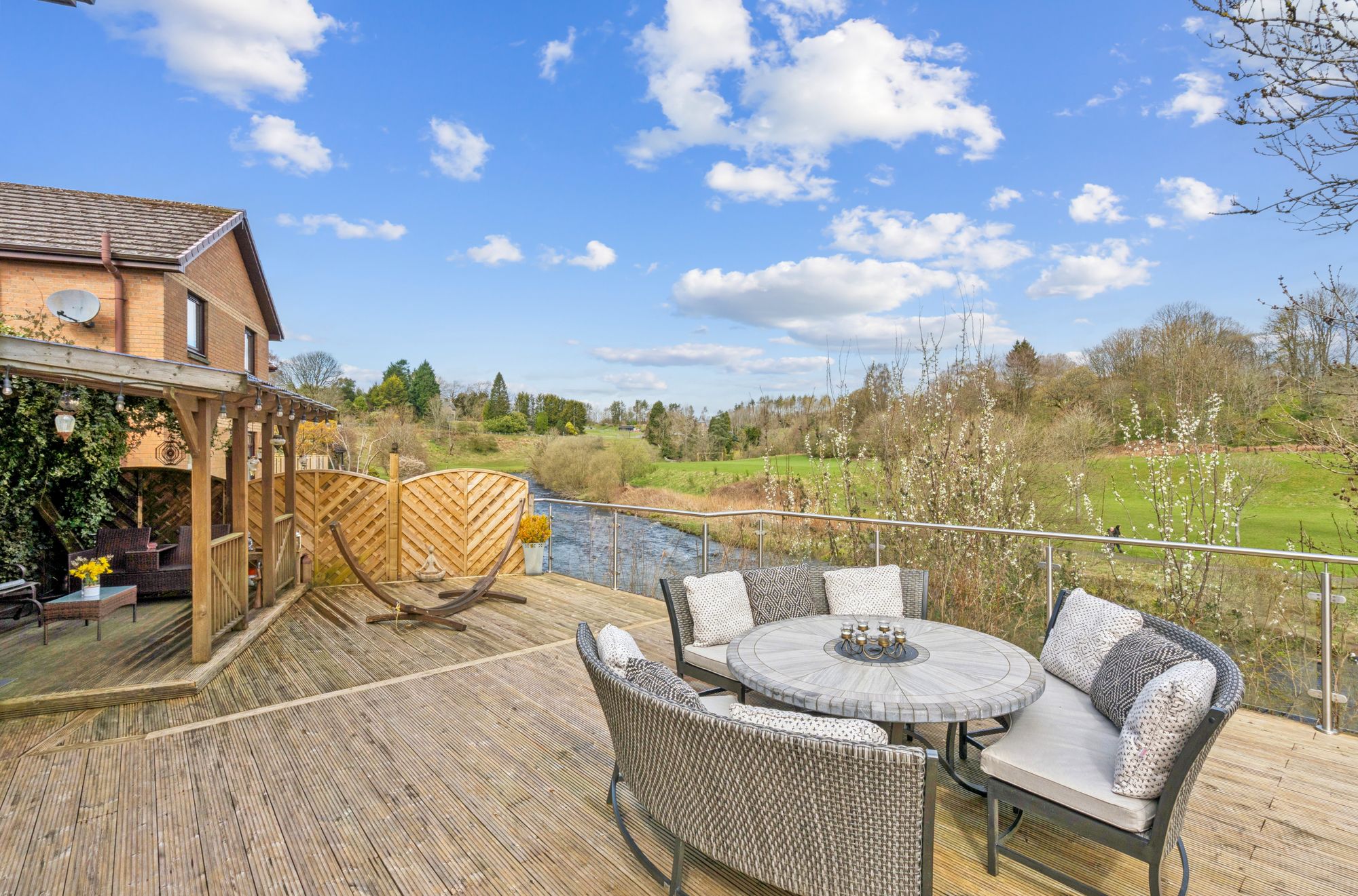 Externally, the property is set within private garden grounds bounded by timber fencing. A substantial timber deck to the rear provides an excellent space for outdoor dining and relaxation, perfectly positioned to take in the beautiful open views across the River Allan and towards Laighhills Park. To the front, a driveway offers off-street parking and leads to a garage.