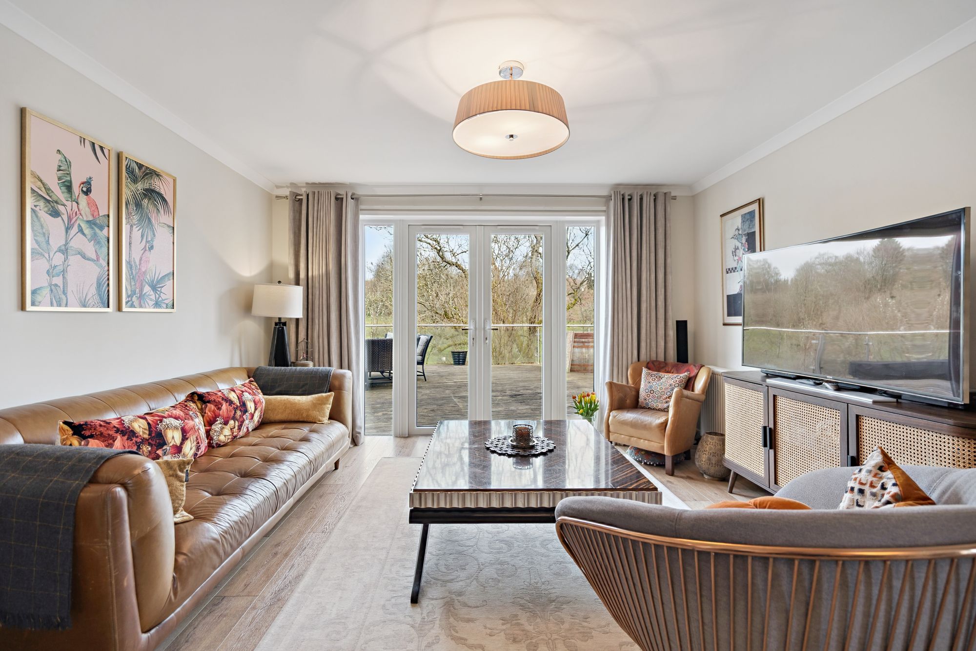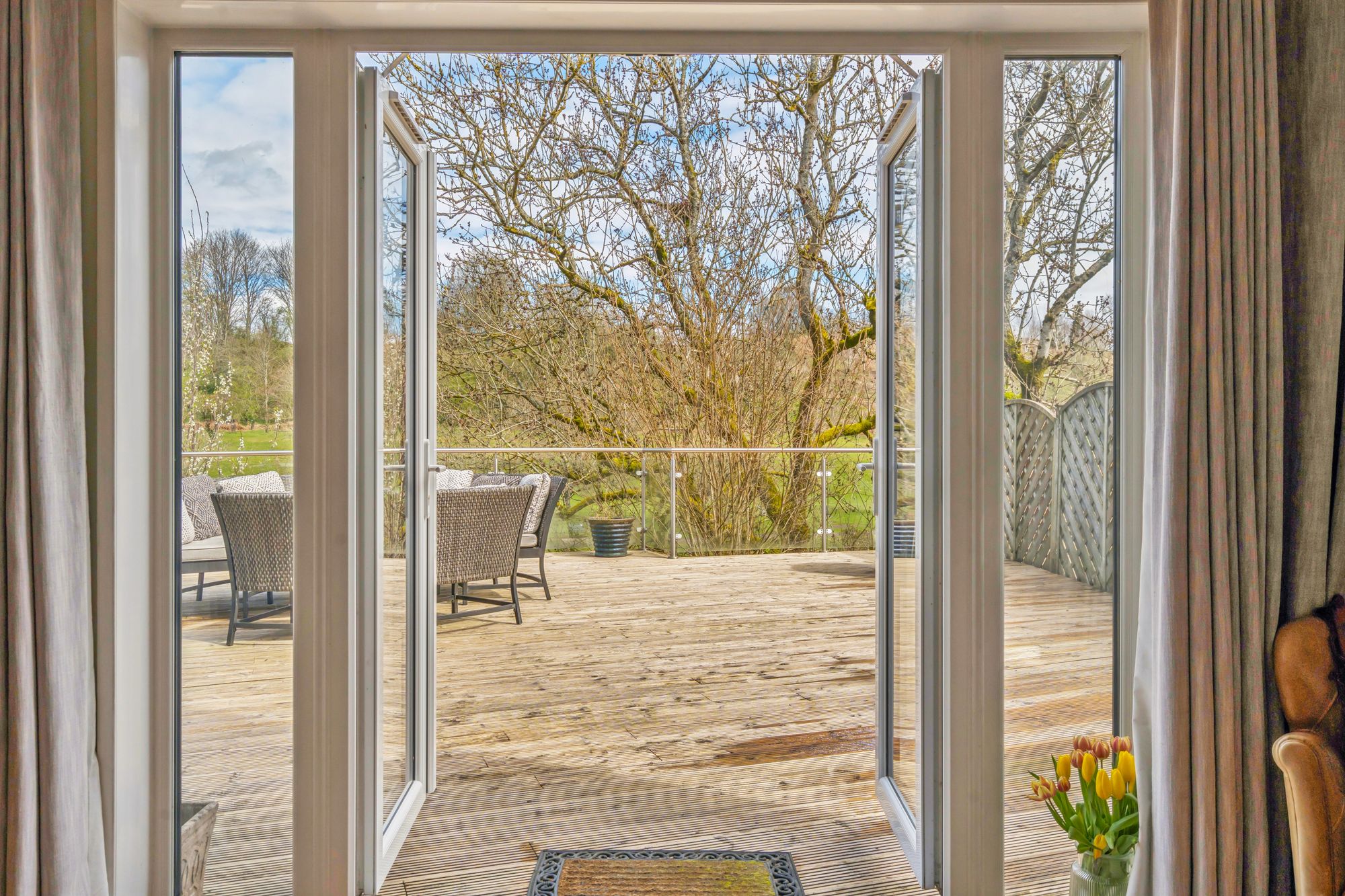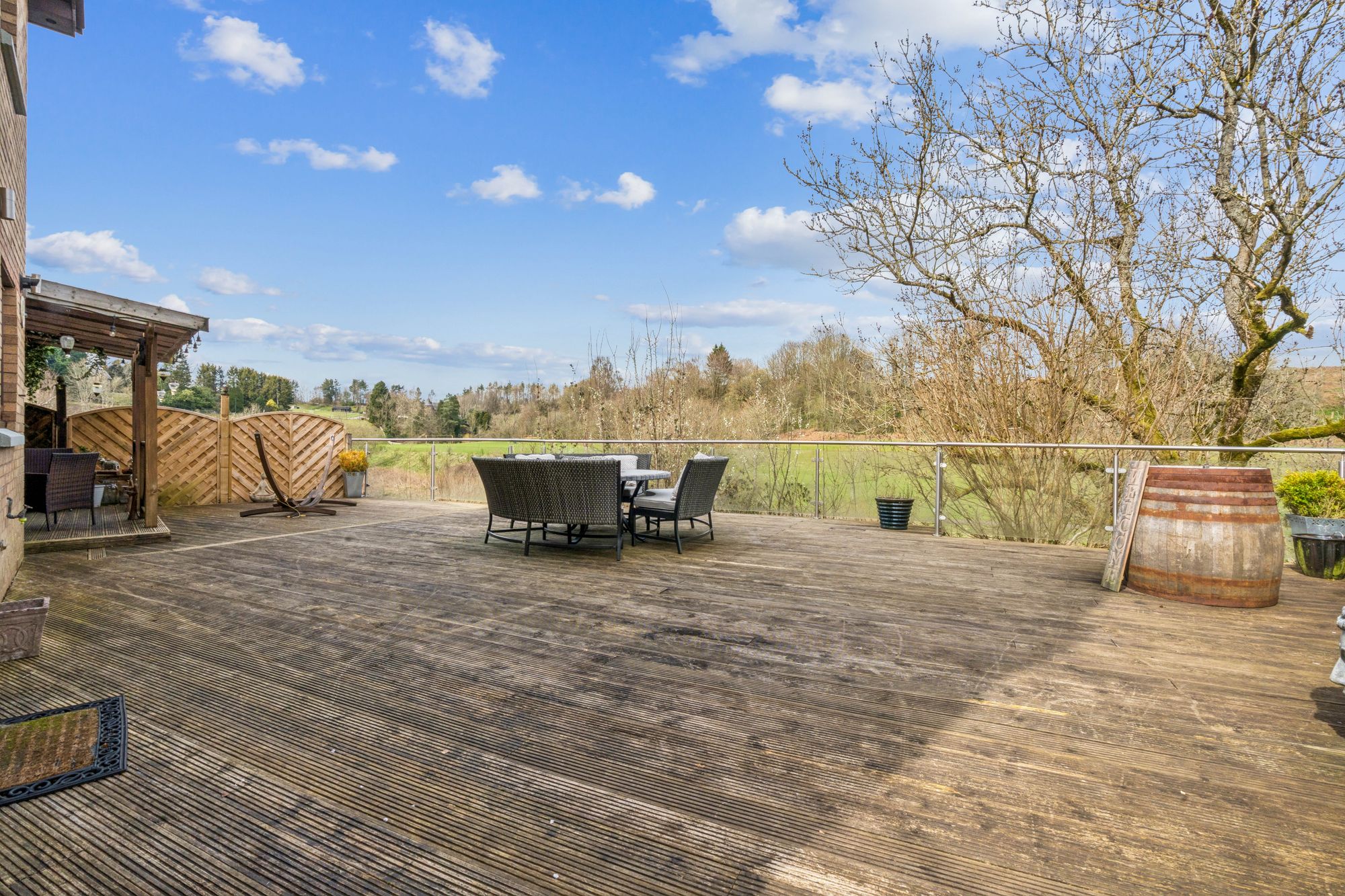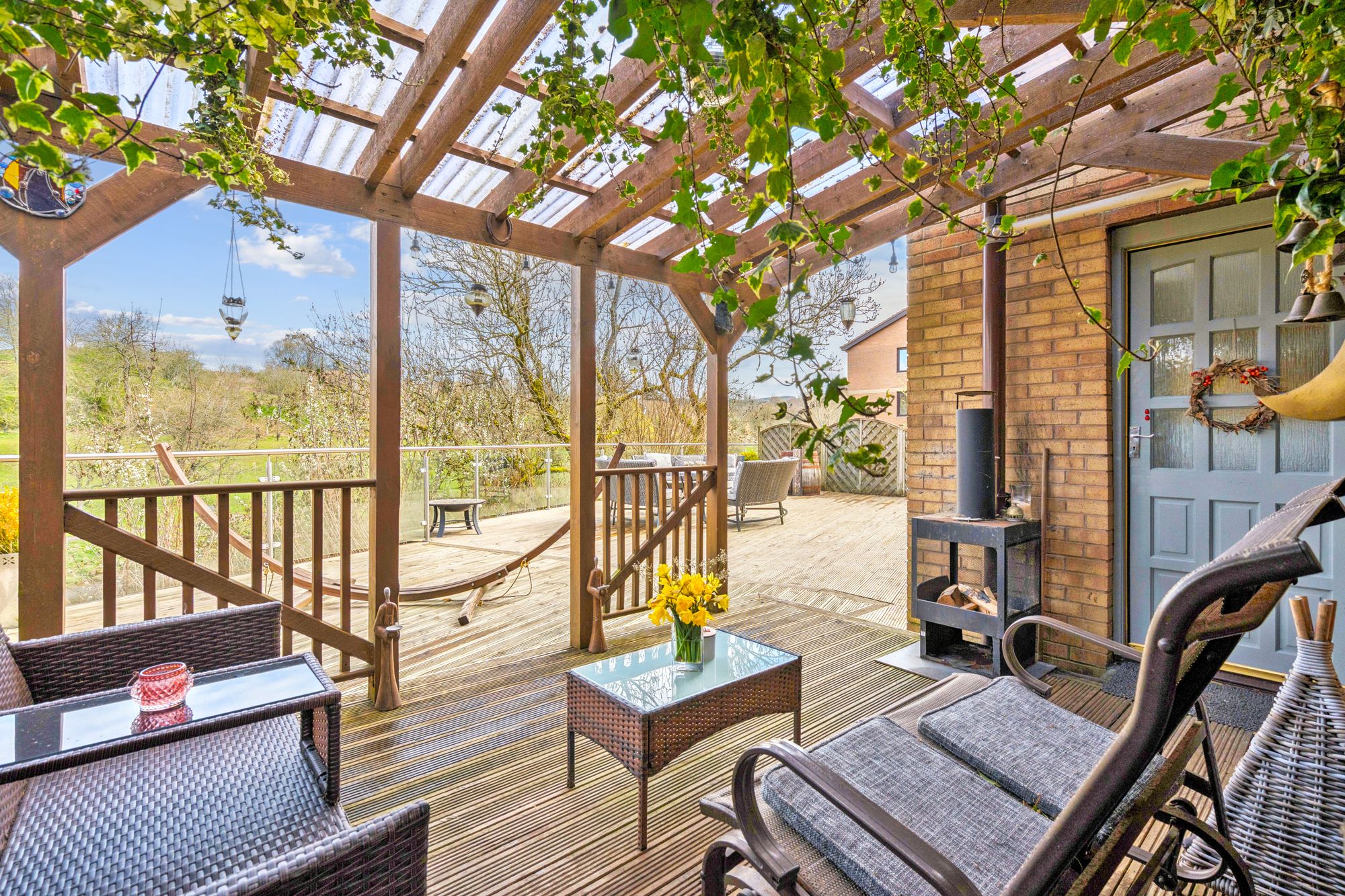 Externally, the property is set within private garden grounds bounded by timber fencing. A substantial timber deck to the rear provides an excellent space for outdoor dining and relaxation, perfectly positioned to take in the beautiful open views across the River Allan and towards Laighhills Park. To the front, a driveway offers off-street parking and leads to a garage.