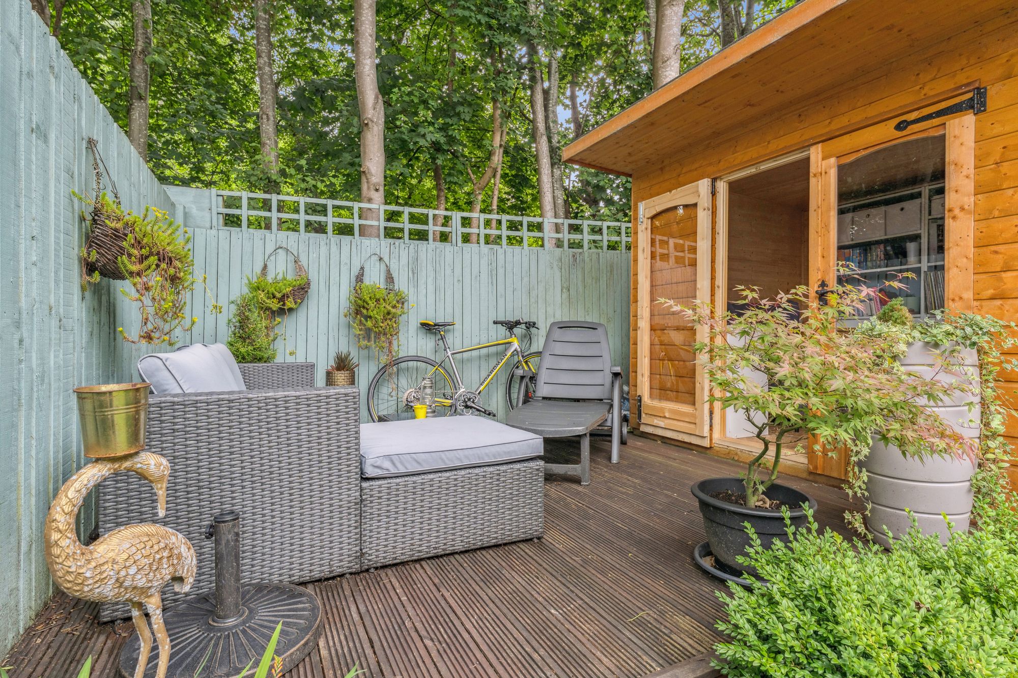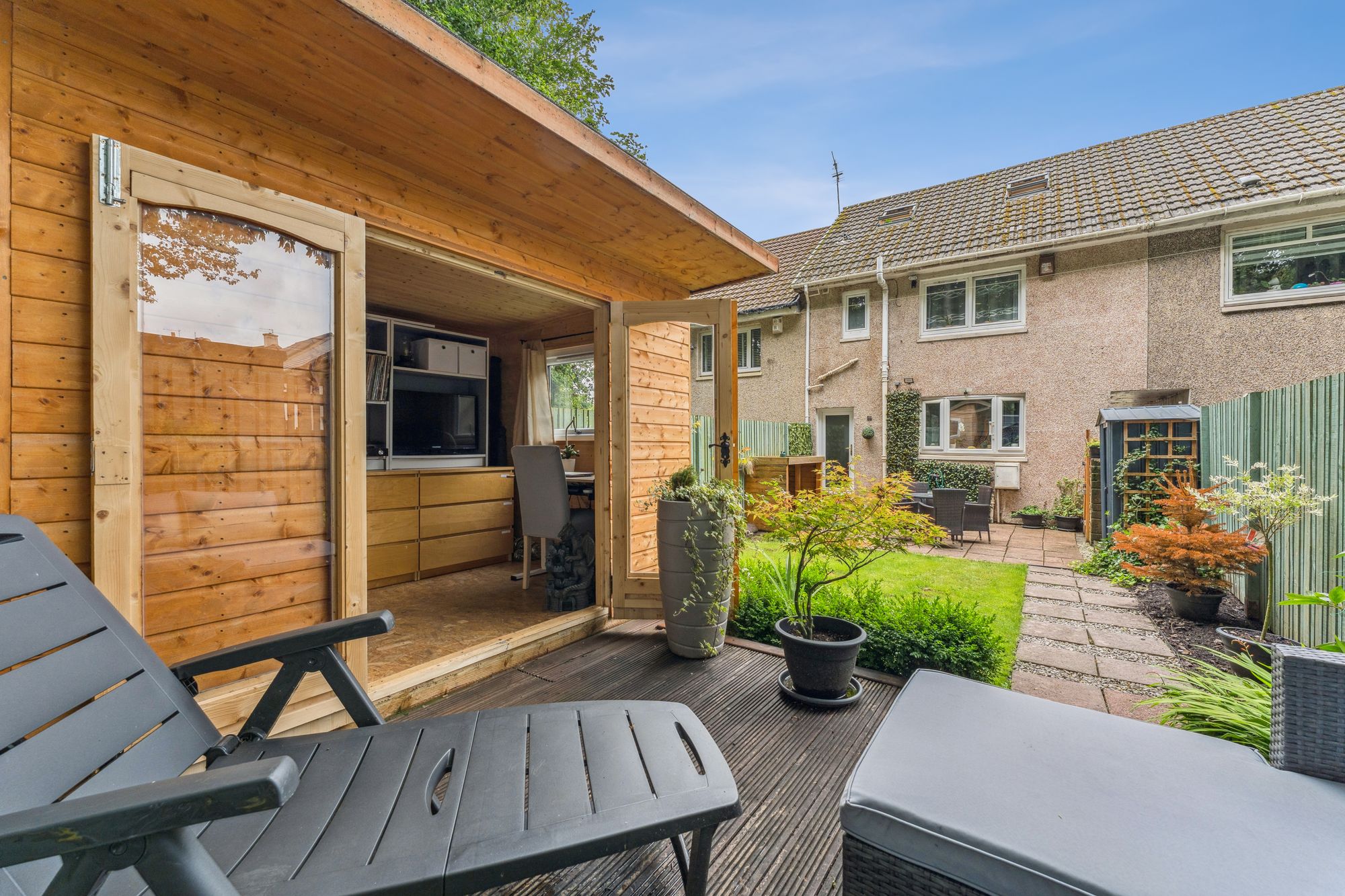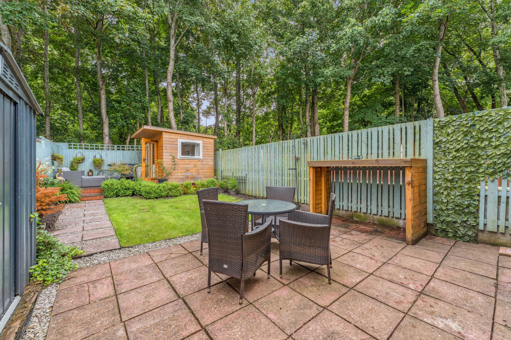 The property occupies beautifully landscaped gardens with a monobloc path leading from the street side, passing a manicured lawn, to the front door of the home. The rear garden is particularly private and very peaceful and comprises a broad patio area, a further lawn, a raised decking area with a fantastic, timber built garden room - currently utilised as a home office. The gardens are fully enclosed and back on to an area of woodland, enhancing the calm the gardens on offer.