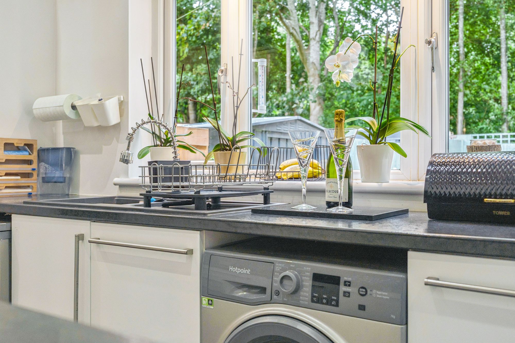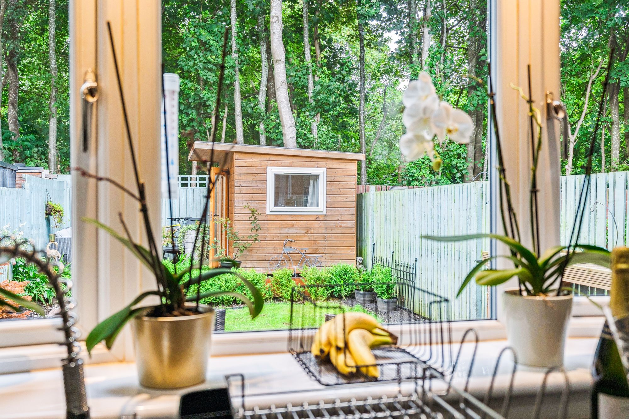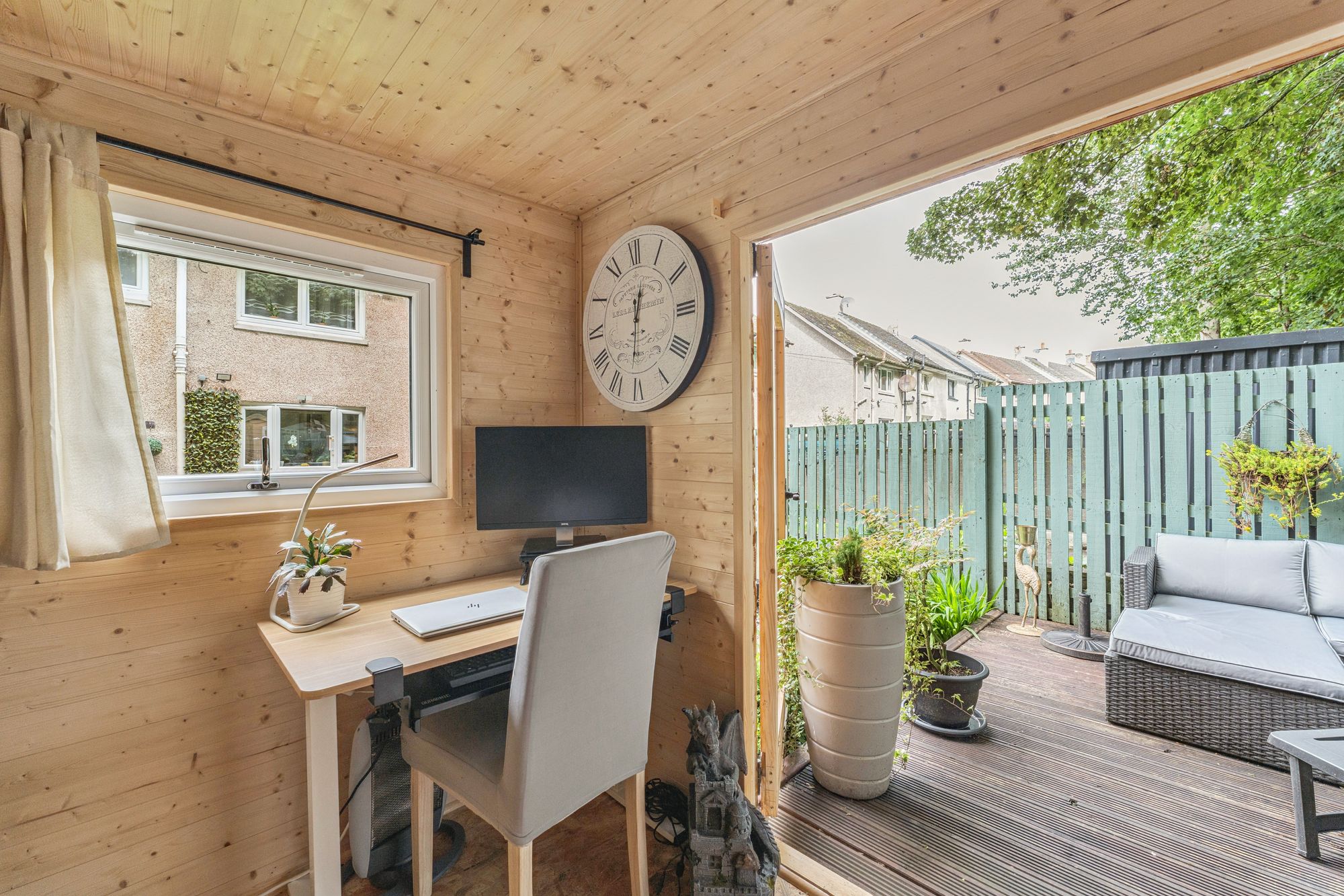 The property occupies beautifully landscaped gardens with a monobloc path leading from the street side, passing a manicured lawn, to the front door of the home. The rear garden is particularly private and very peaceful and comprises a broad patio area, a further lawn, a raised decking area with a fantastic, timber built garden room - currently utilised as a home office. The gardens are fully enclosed and back on to an area of woodland, enhancing the calm the gardens on offer.
