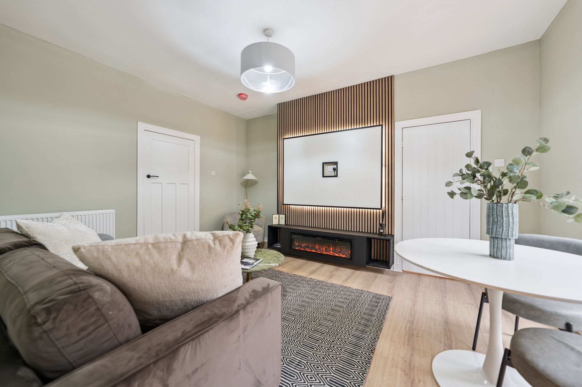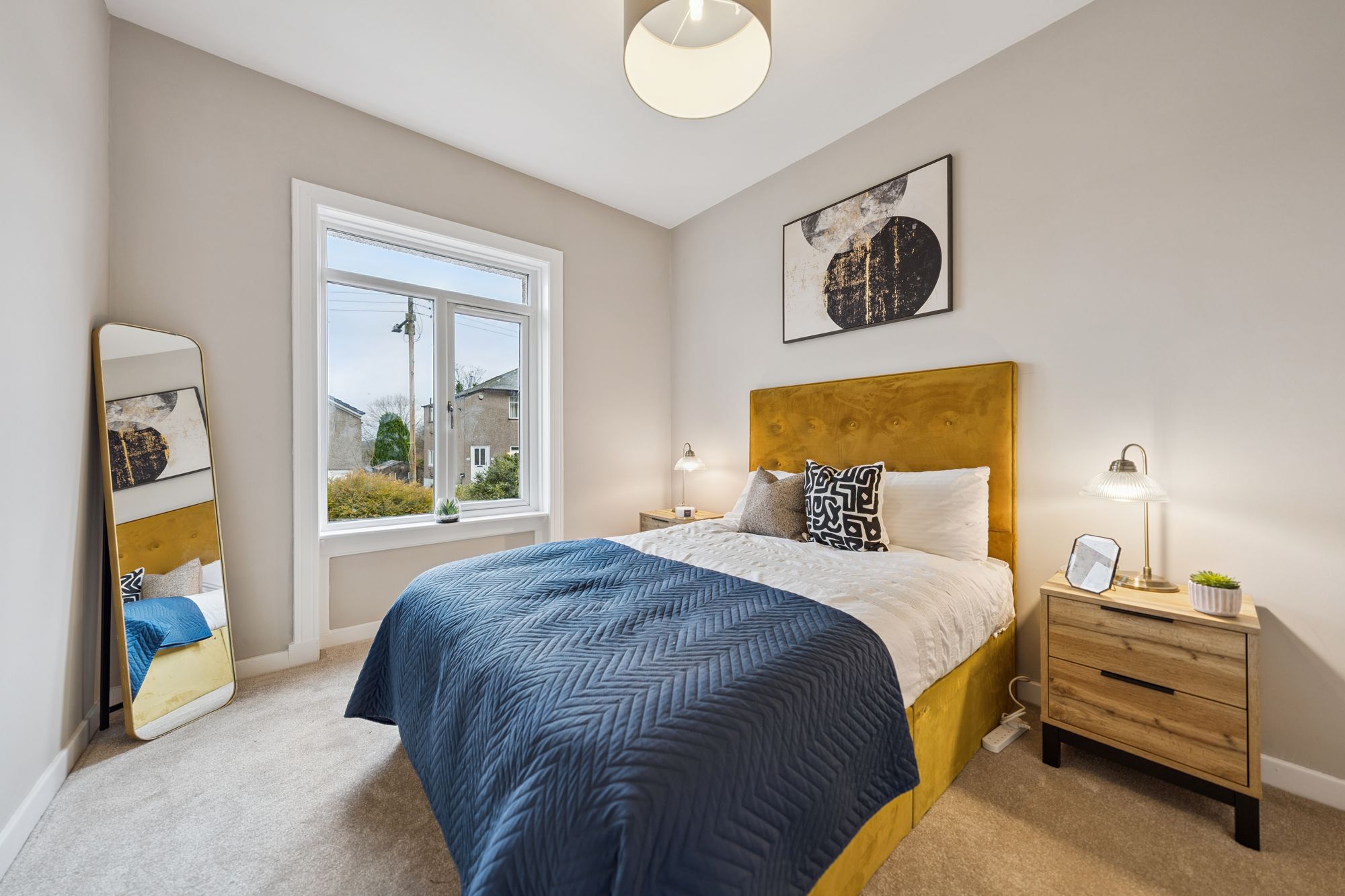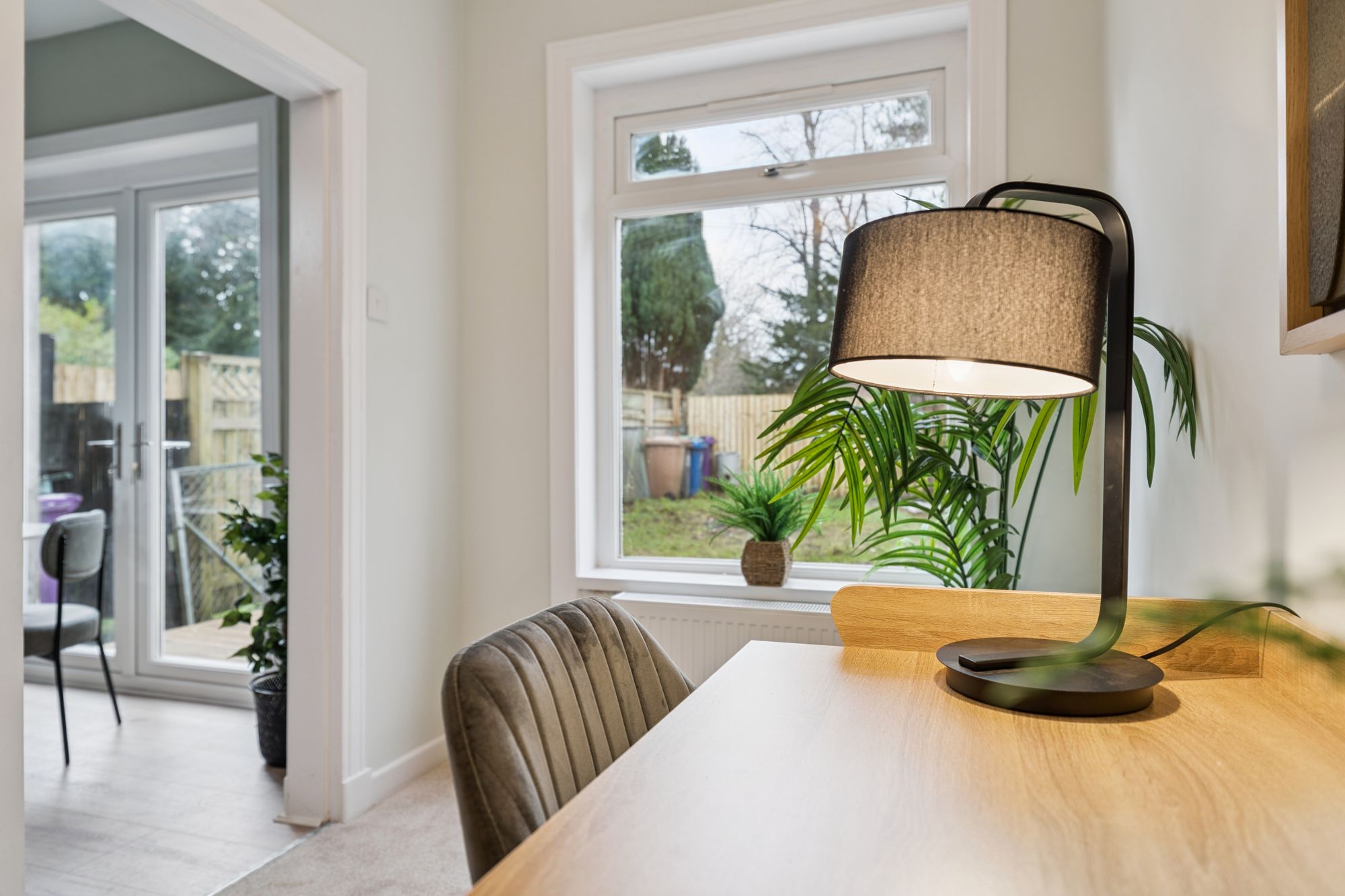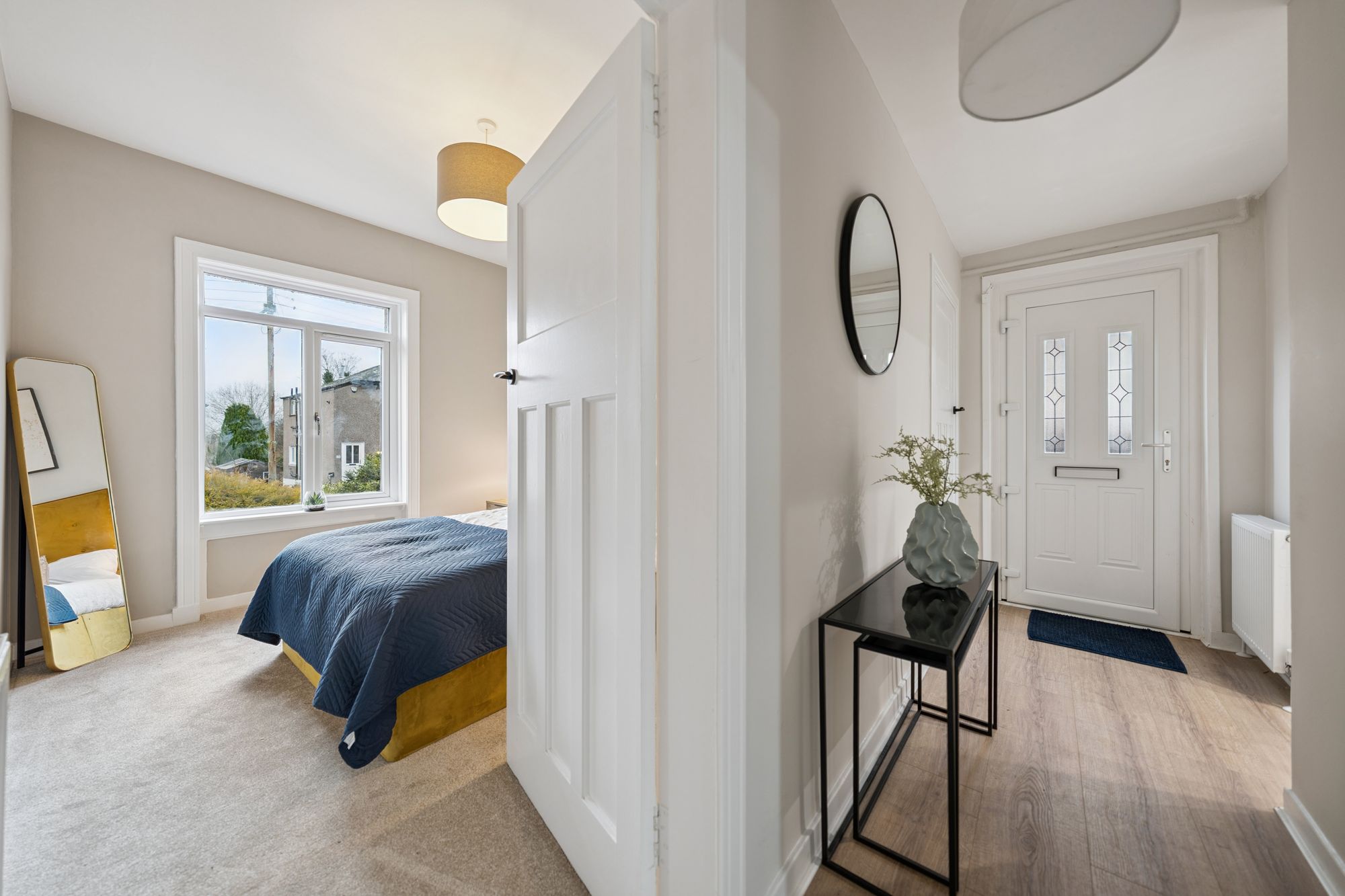 The property offers two generously proportioned, front-facing bedrooms, both providing excellent space for free-standing furniture. The principal bedroom is further enhanced by a broad bay window and an integrated storage cupboard. A third bedroom, currently utilised as a home office, offers flexible accommodation and could equally be used as a dining room or additional living space. Completing the accommodation is a stylish, well-appointed bathroom, fitted with a modern three-piece suite incorporating a shower over the bath.
