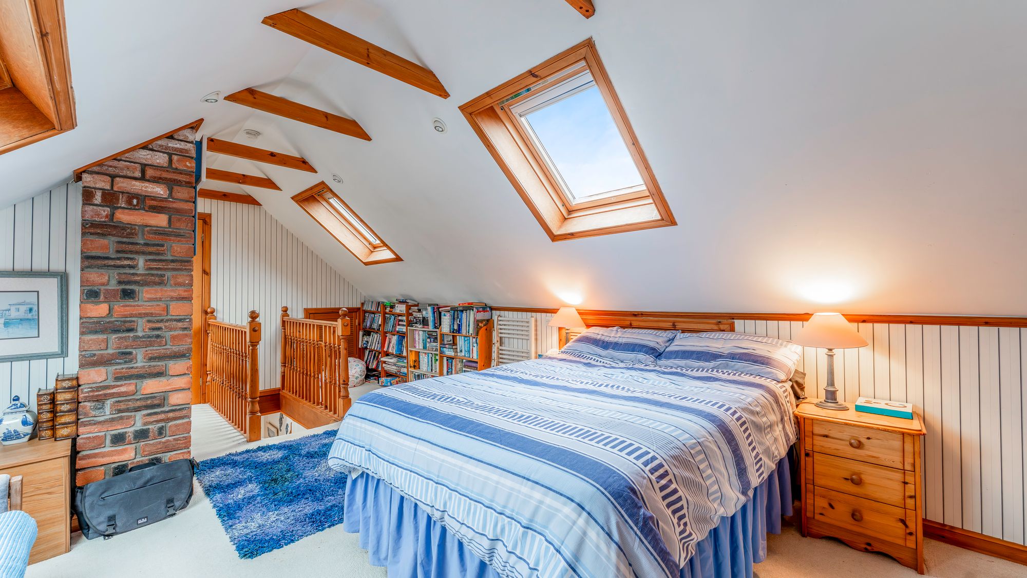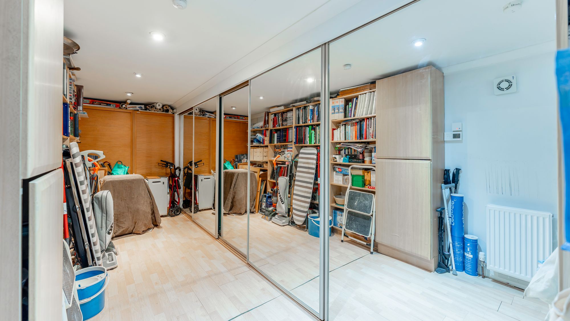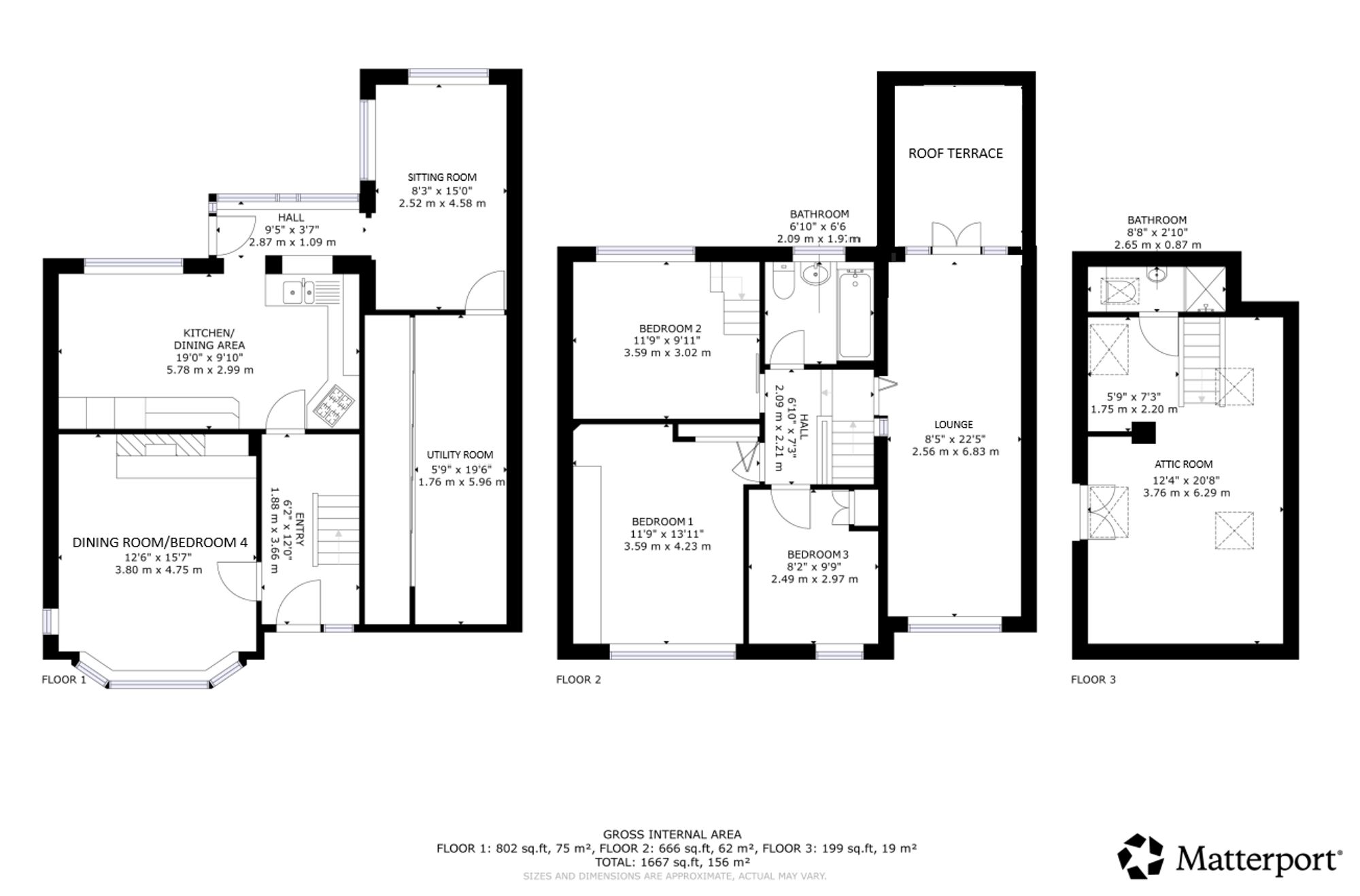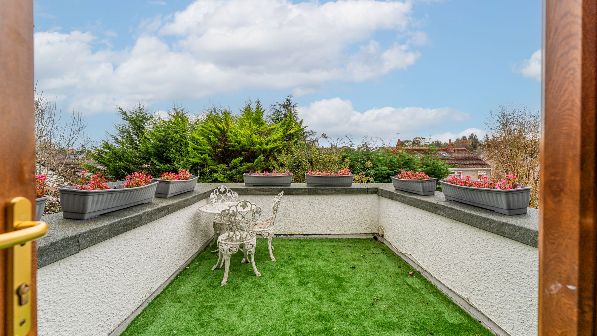 A staircase leads to the mid landing where a beautifully bright lounge enjoys dual aspects and lovely views. French doors open onto a rooftop terrace with artificial grass, perfect for outdoor furniture and entertaining. On the first floor, there is a fully tiled family bathroom and three well-proportioned double bedrooms. The principal bedroom is front facing with fitted wardrobes, while the second overlooks the rear garden and includes a fixed staircase leading to a lined attic room with shower room.