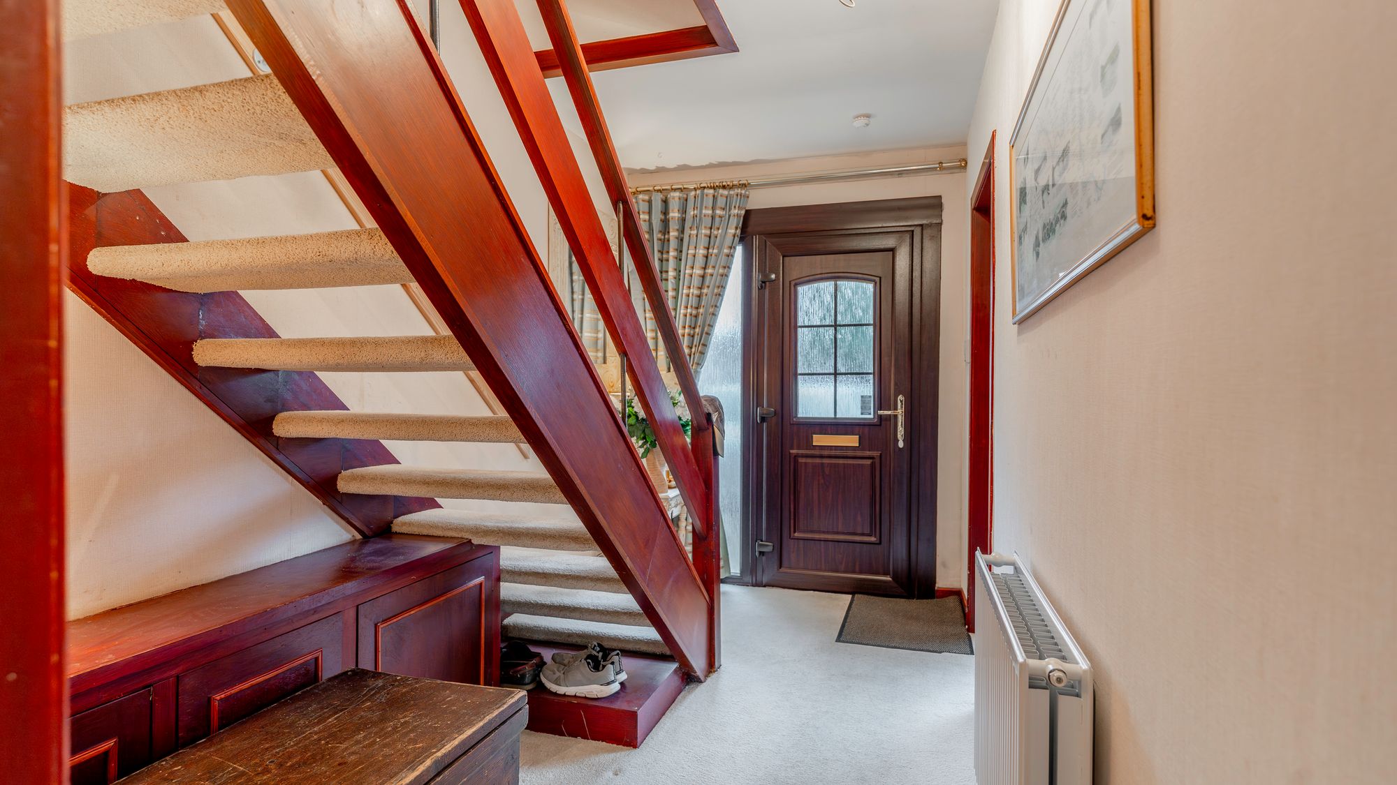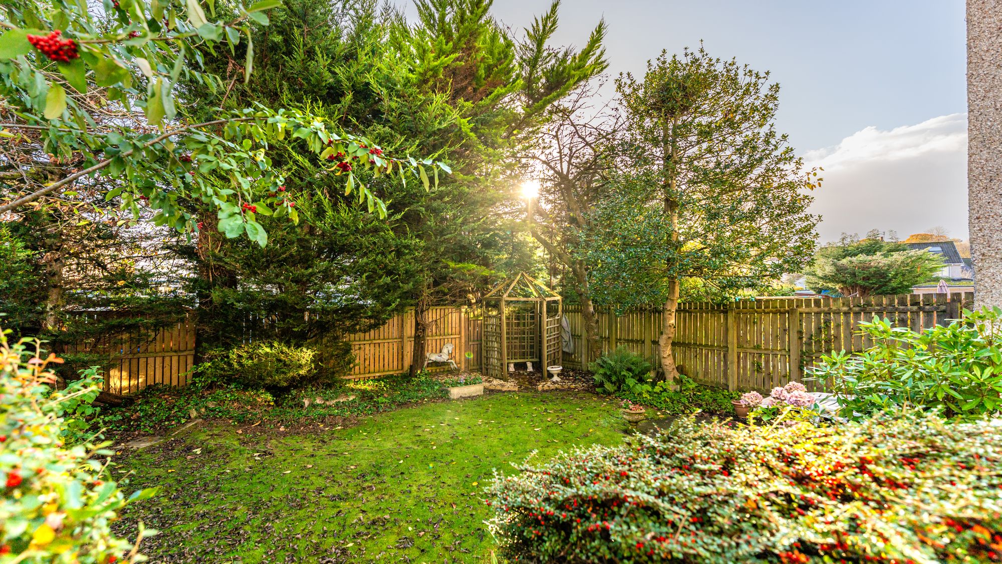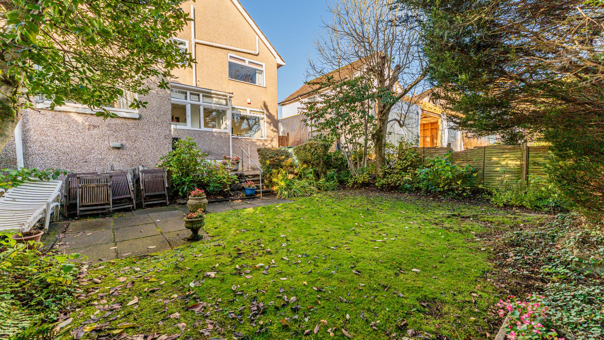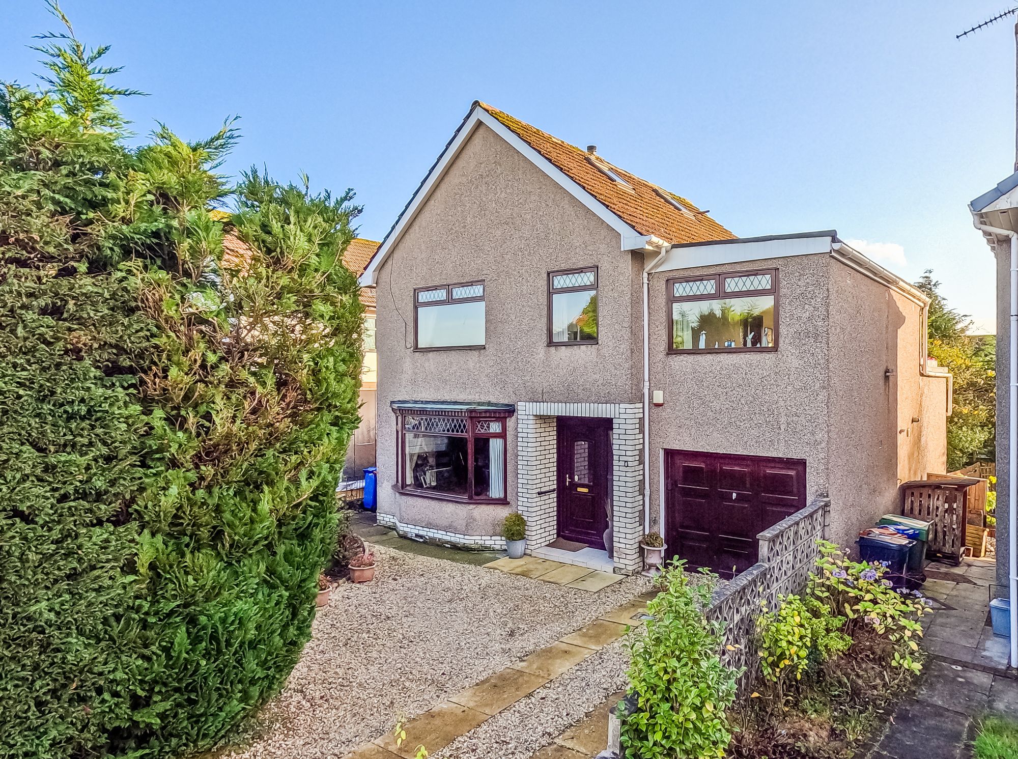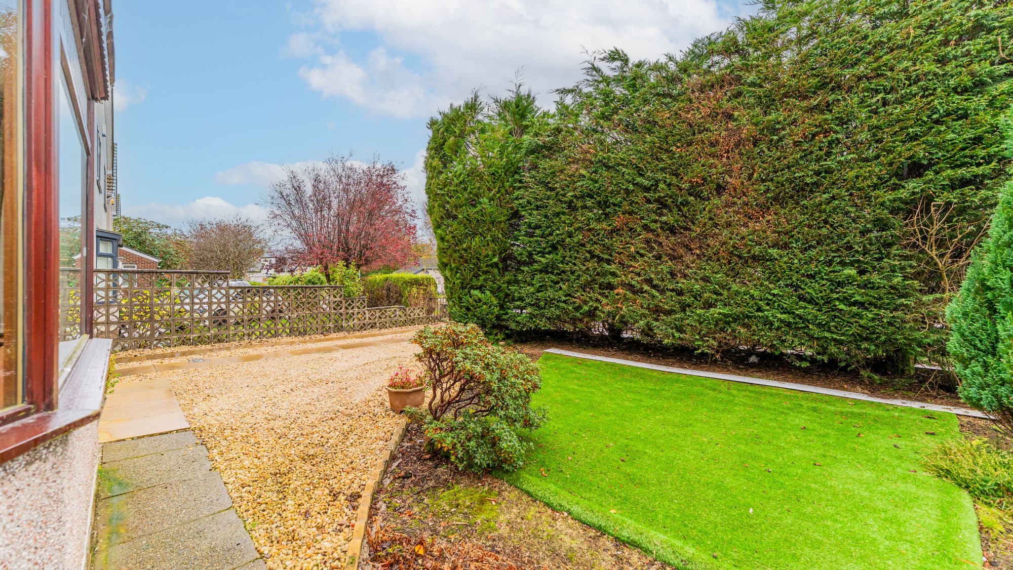 The front garden is neatly presented with artificial grass bordered by a large hedge and stone wall, alongside a gravel driveway providing off street parking. The rear garden is private and enclosed, featuring a lawn, patio area, and surrounding trees and timber fencing.