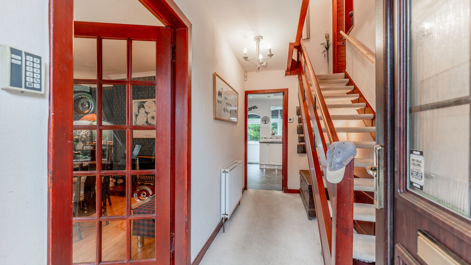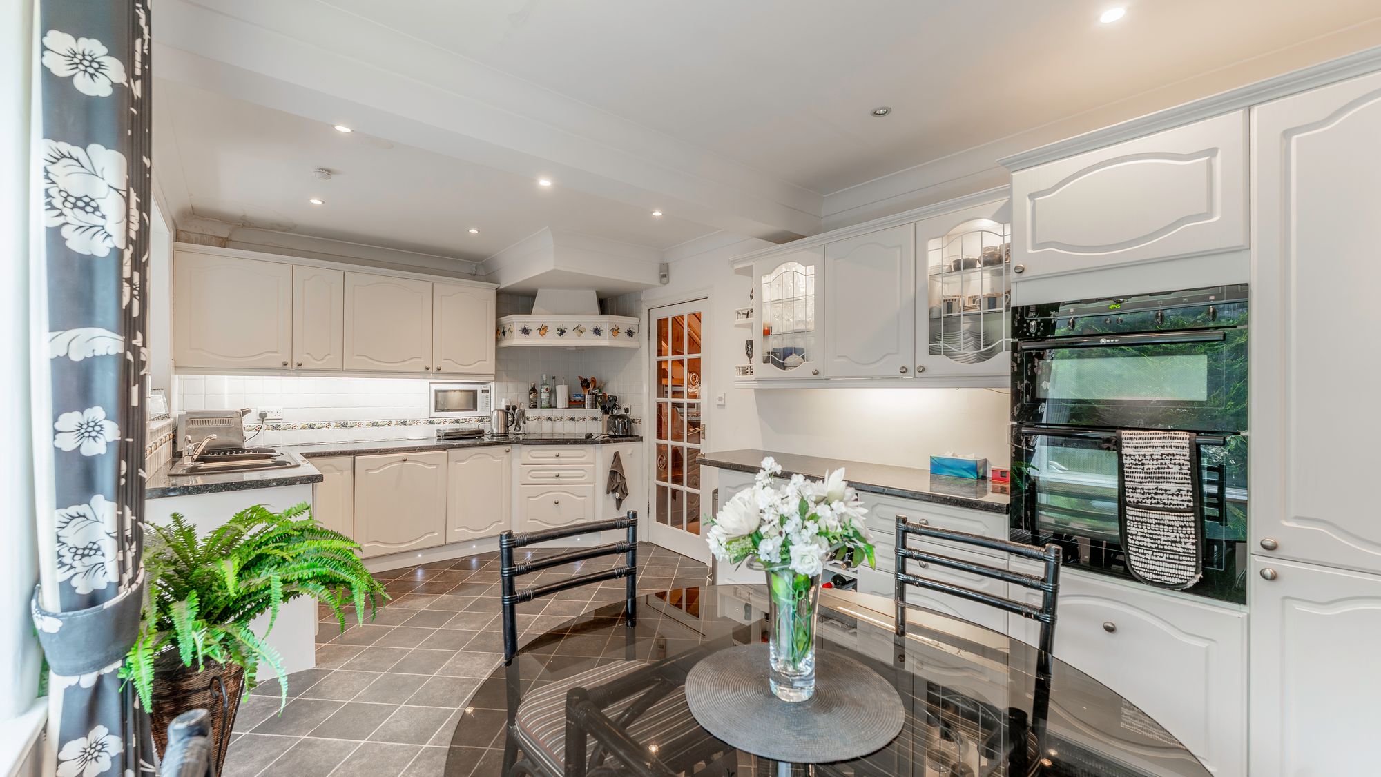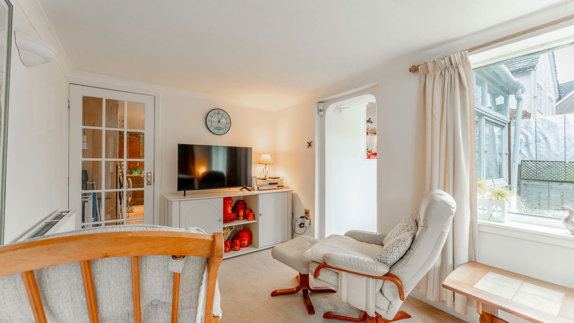 The property opens with a welcoming reception hallway and staircase, leading to a spacious front facing dining room featuring a bay window and electric fire. The kitchen is bright and modern, fitted with white cabinets, dark work surfaces, and integrated appliances including a double oven, dishwasher, microwave, and induction hob with extractor fan. From the kitchen, there is access to a rear porch and the converted garage, now a comfortable sitting room with dual aspects, additional storage, and a utility area.