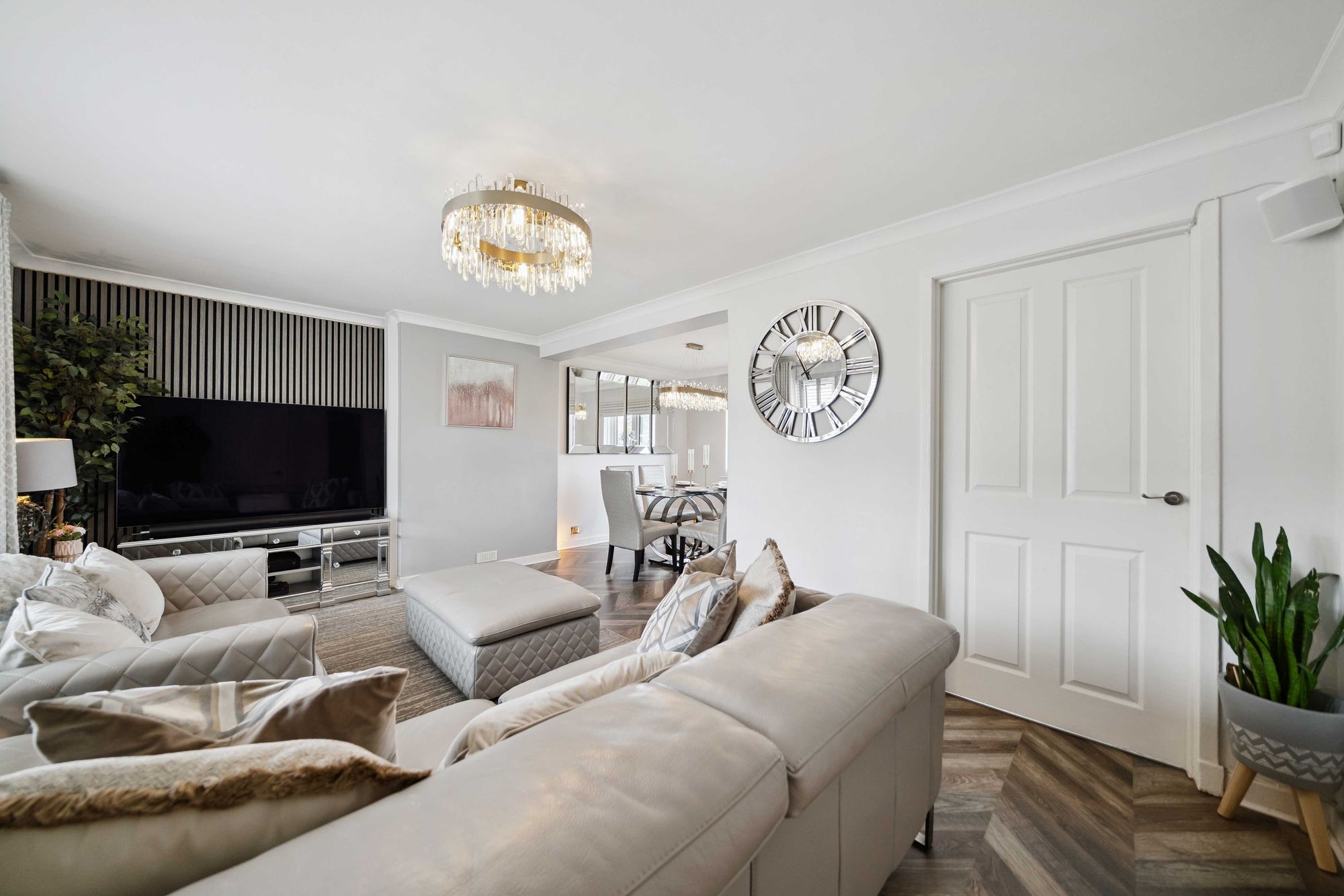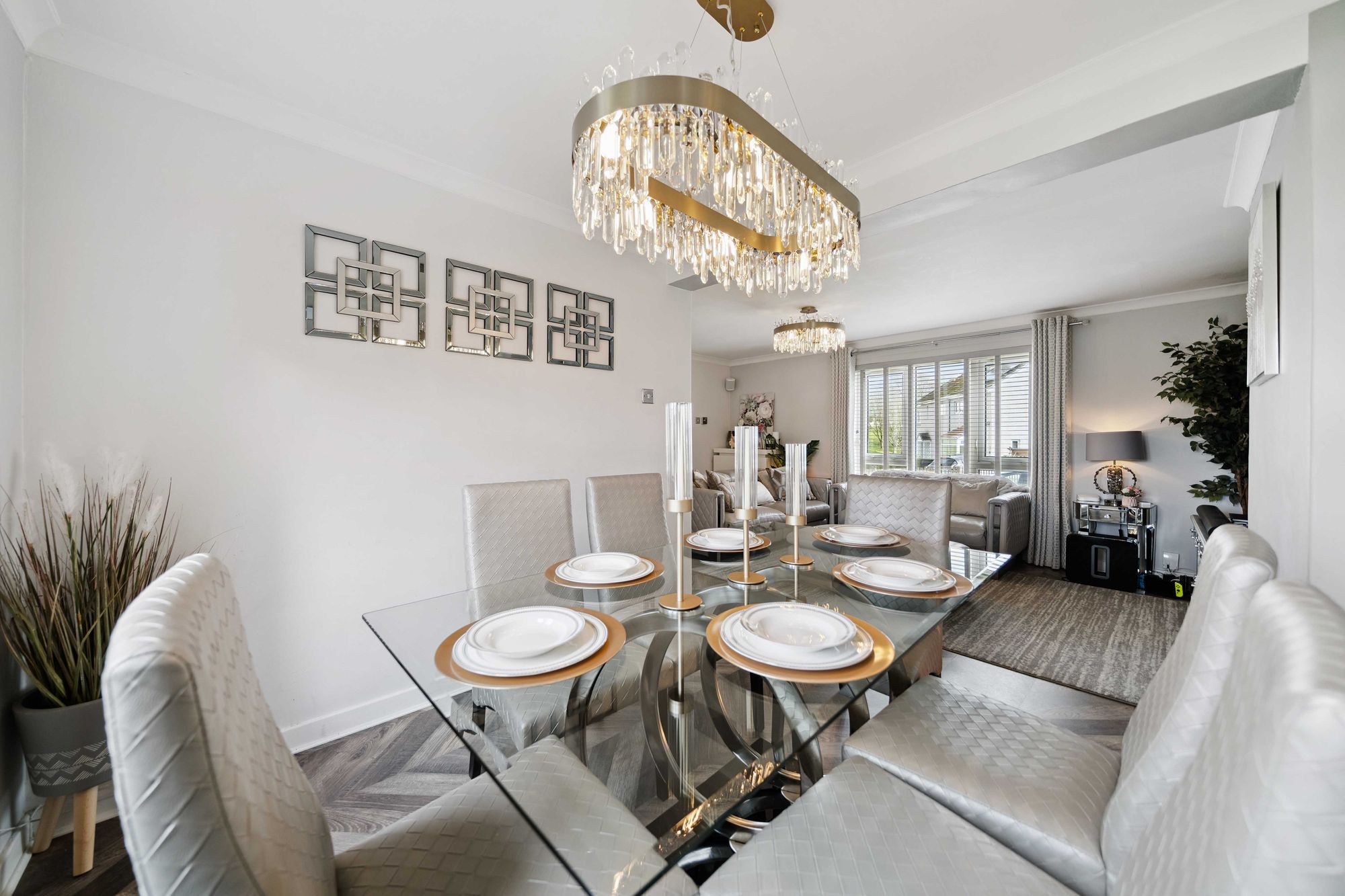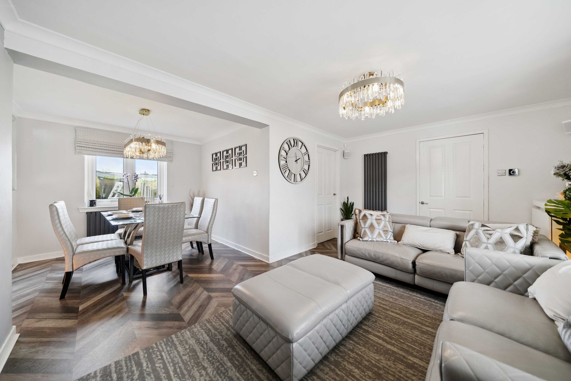 Set within a continually sought-after residential pocket of Busby, this notably spacious end-terrace villa delivers an impeccably stylish decorative interior and is perfectly appointed for modern family living.
