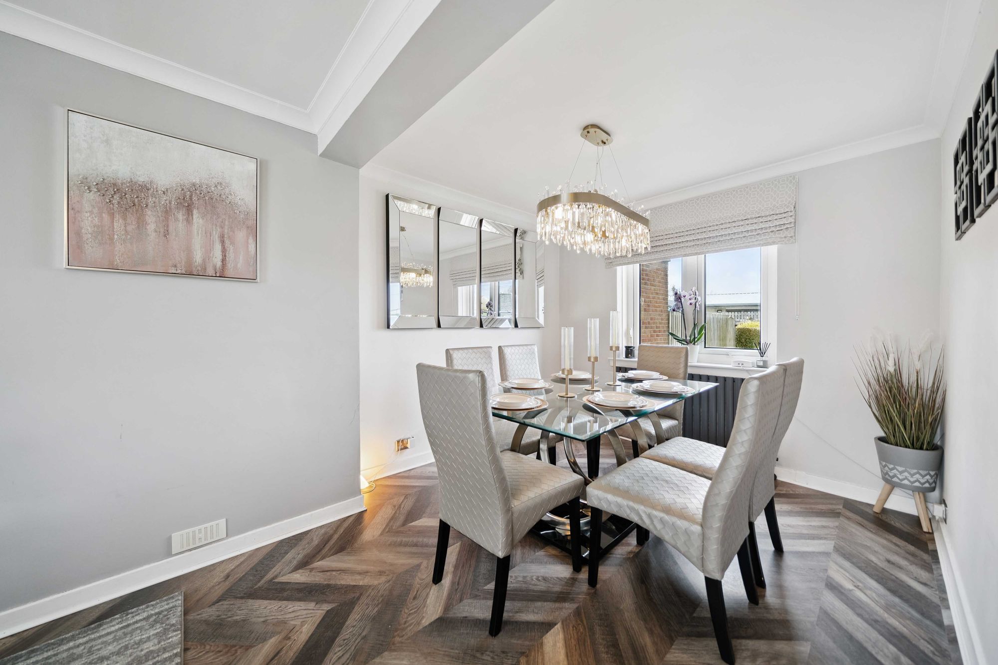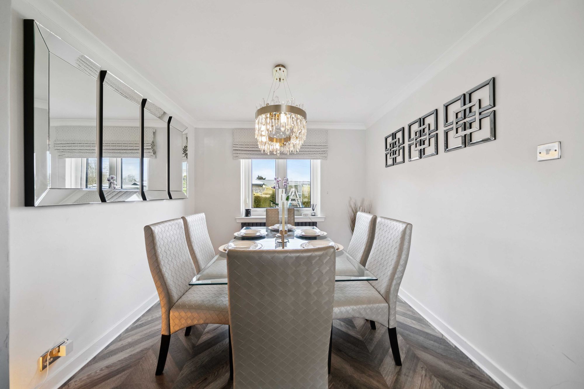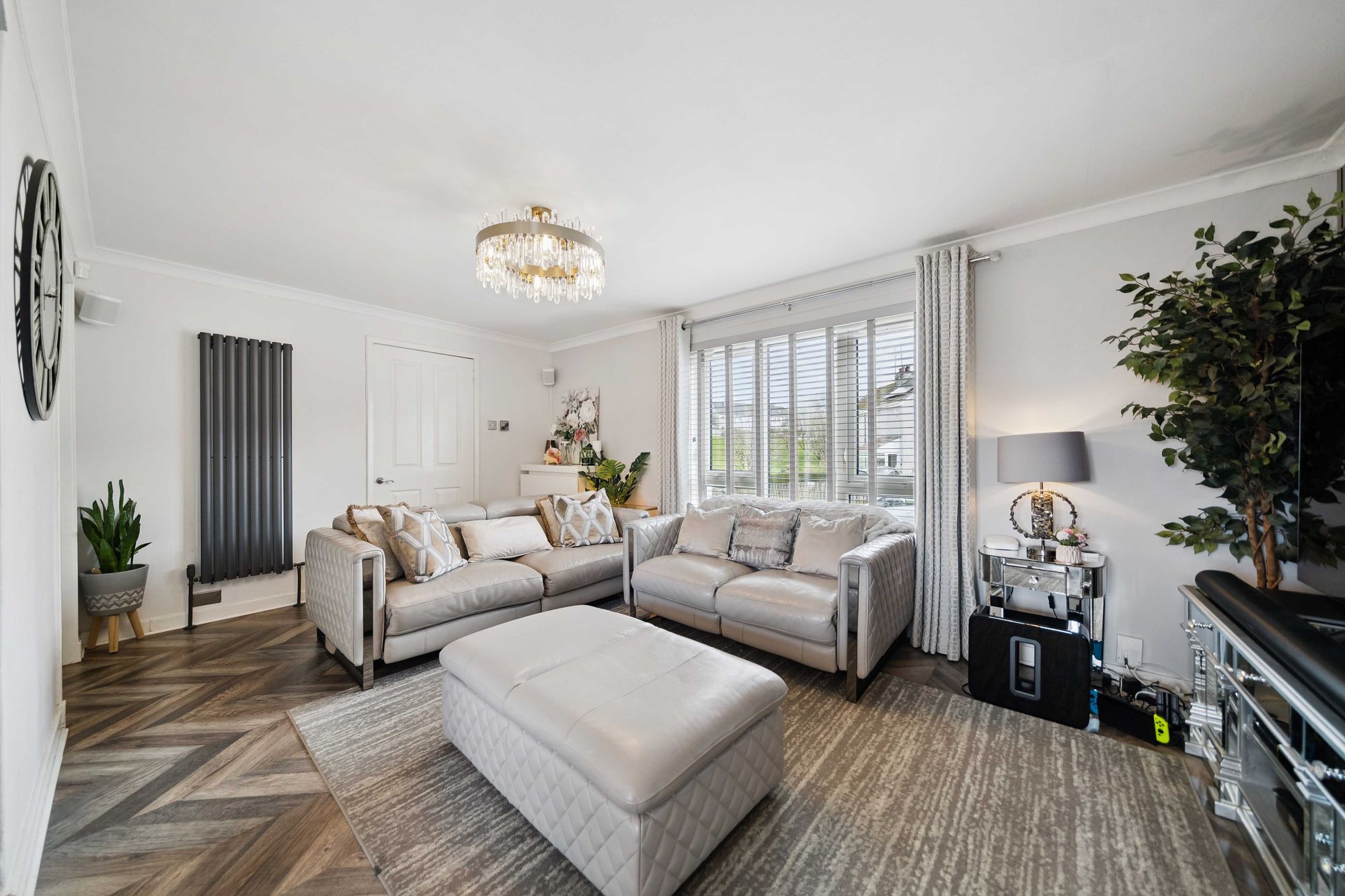 Set within a continually sought-after residential pocket of Busby, this notably spacious end-terrace villa delivers an impeccably stylish decorative interior and is perfectly appointed for modern family living.
