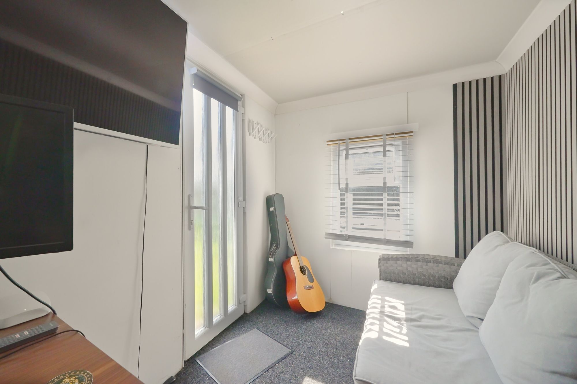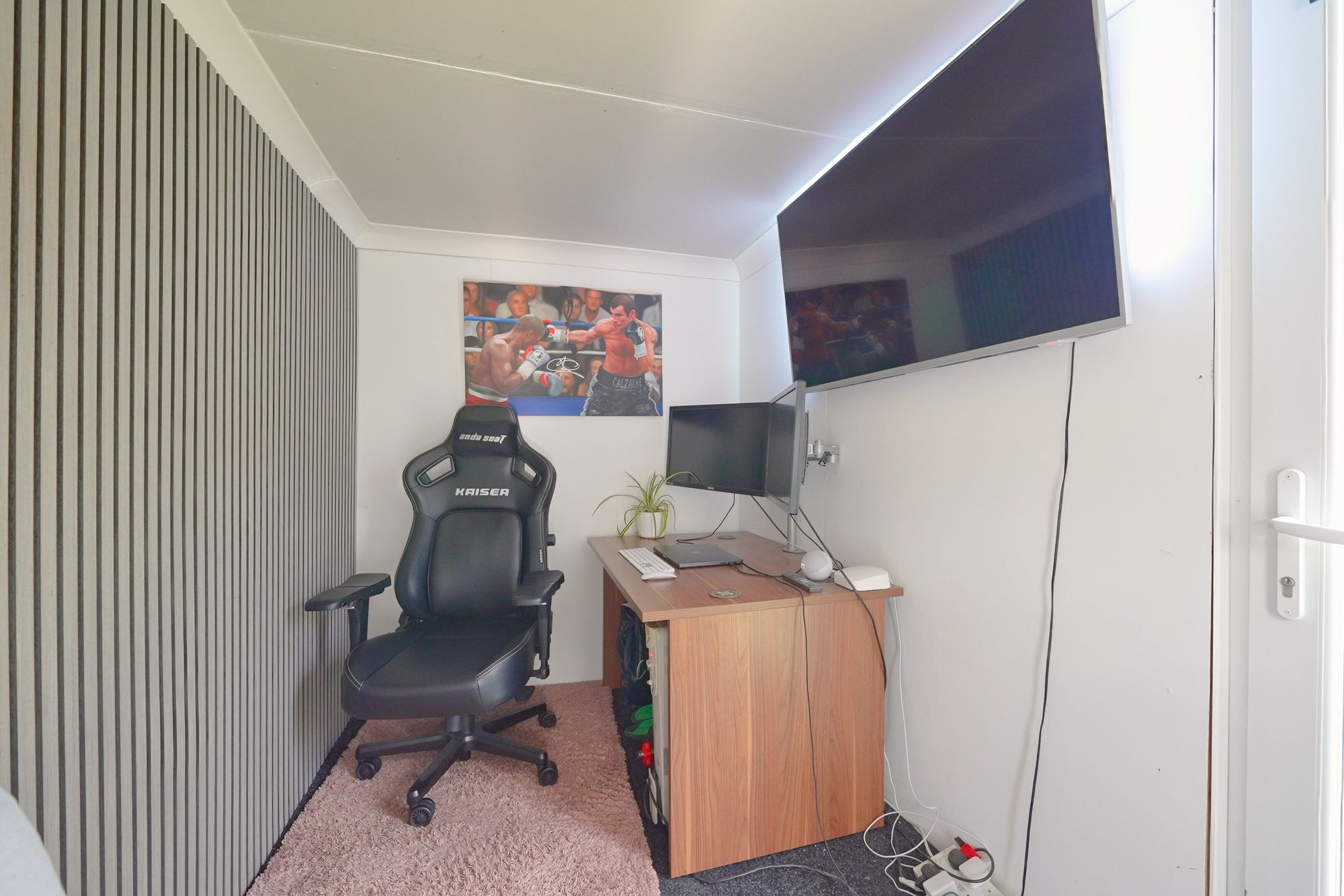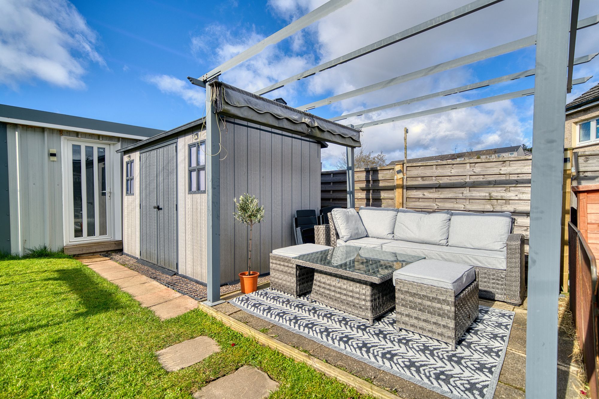 A worthy rival to the striking interior is the superbly spacious garden plot within which this home sits. Sitting slightly proud of pavement level to the front, a superb degree of privacy is afforded whilst, to the rear, there is a predominantly level area of family friendly lawn which is complimented by twin sun-patios designed to take advantage of the garden’s strong southerly aspect. There is also a superb ‘cabin-room’ in situ which might lend purpose as a home office or similar.
