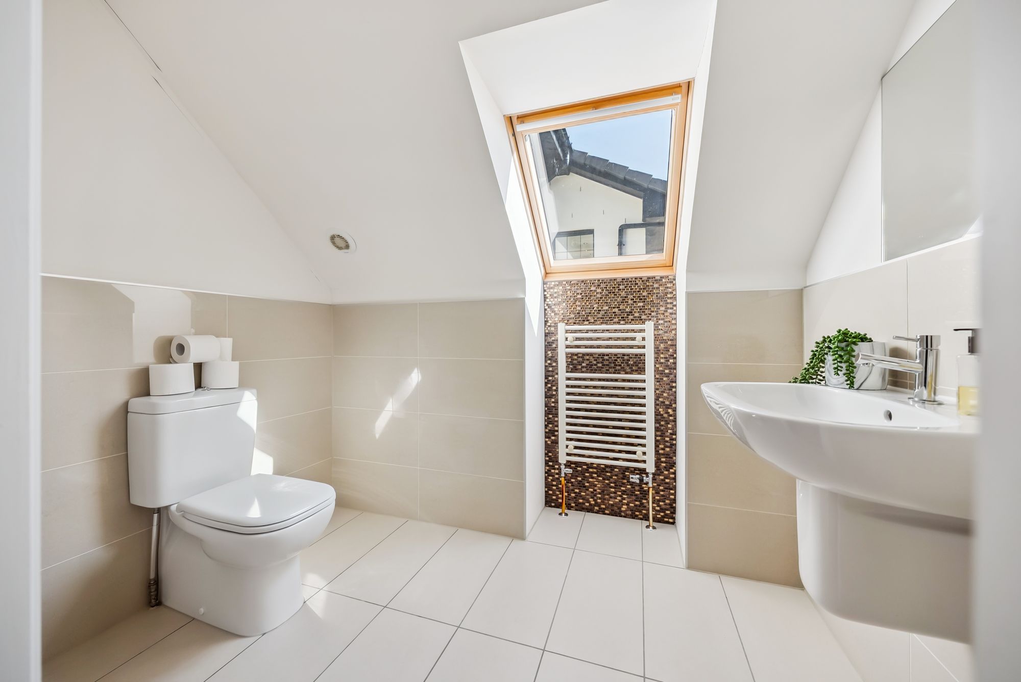 Accessed via a stairs case beside the utility room is a large bedroom or games room, with W.C.