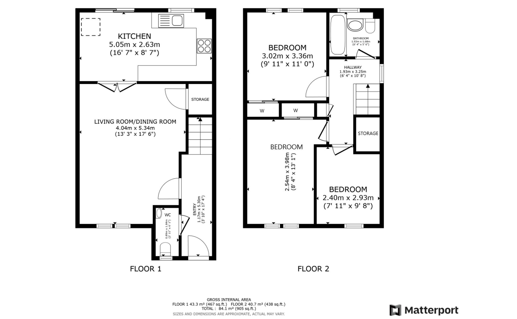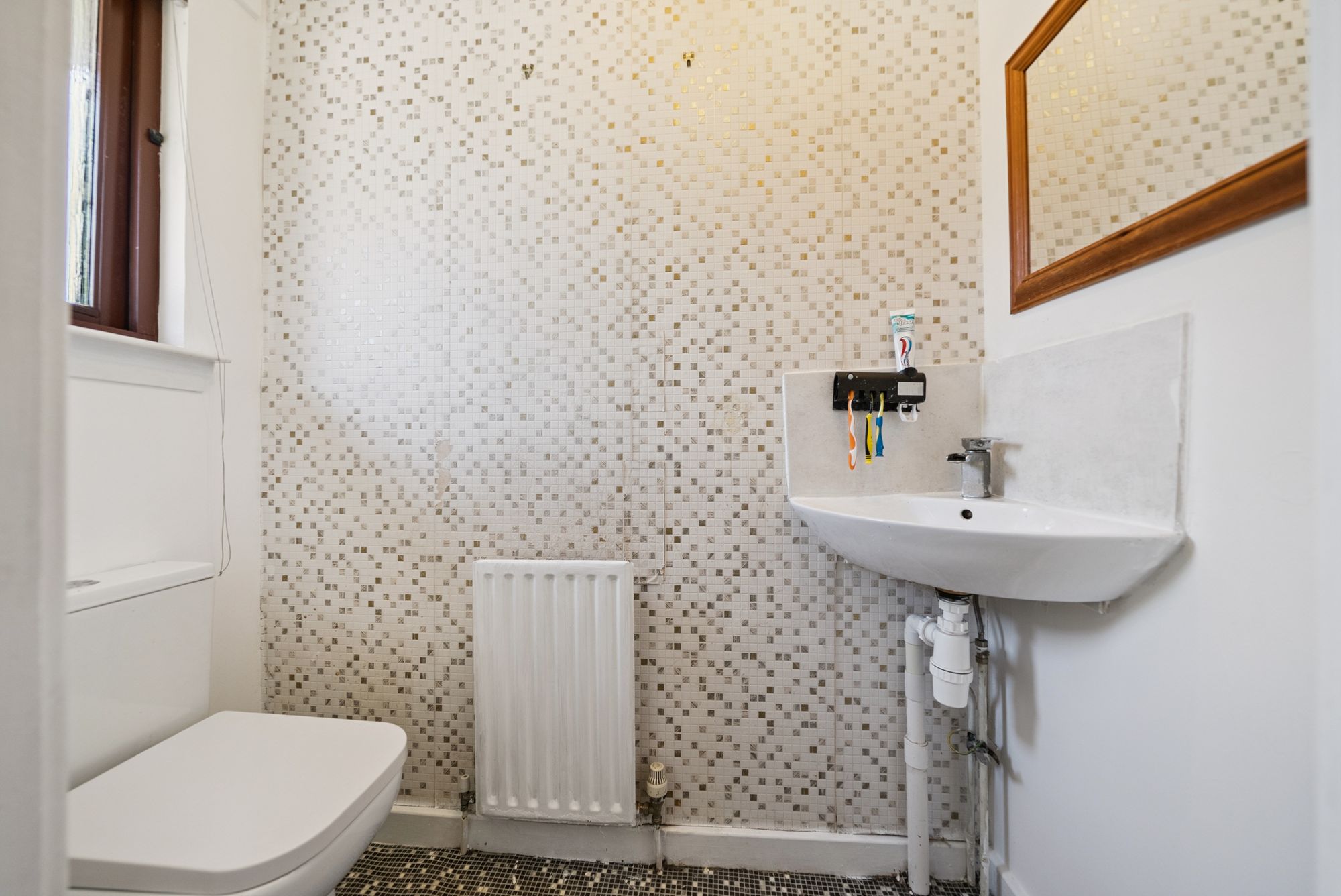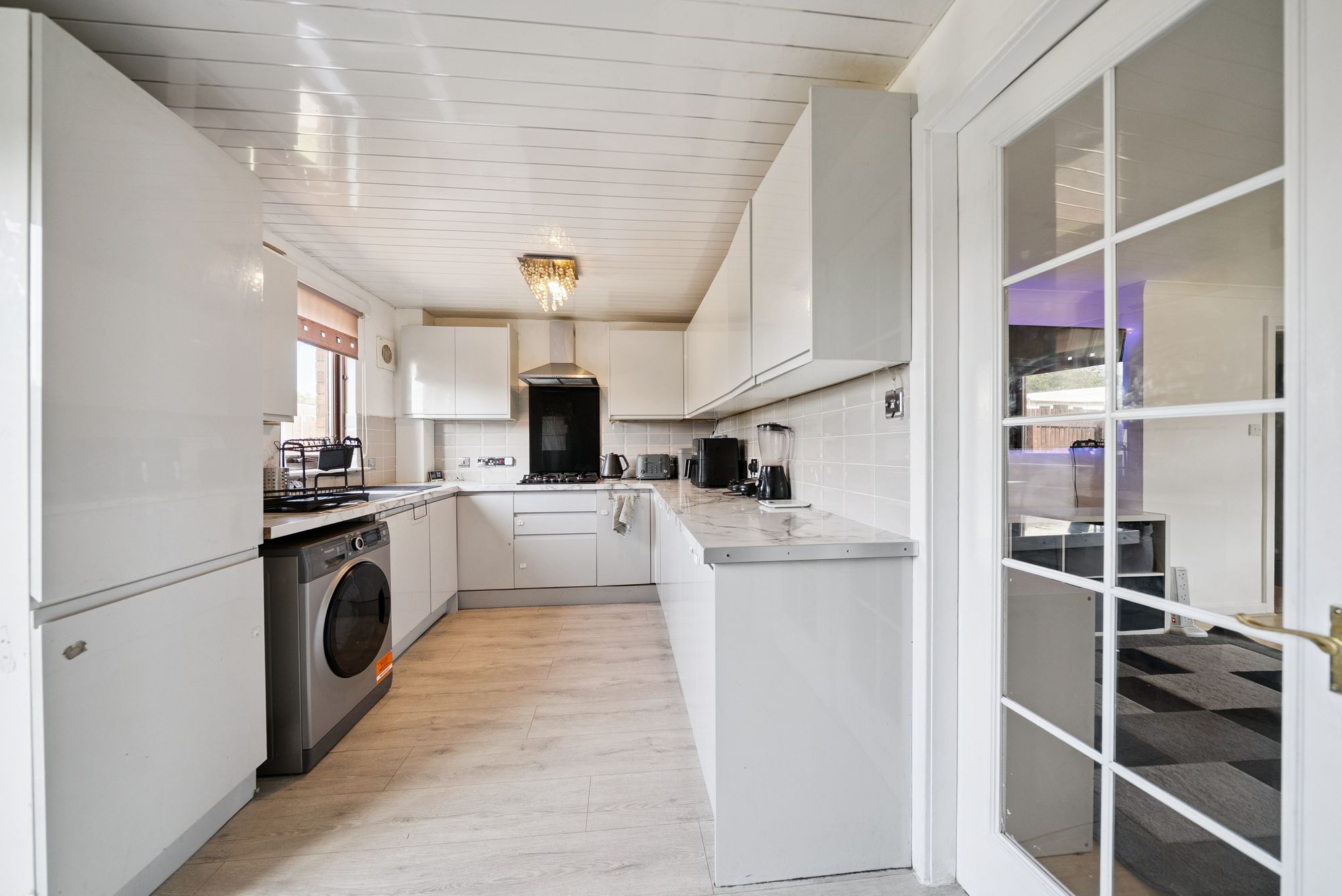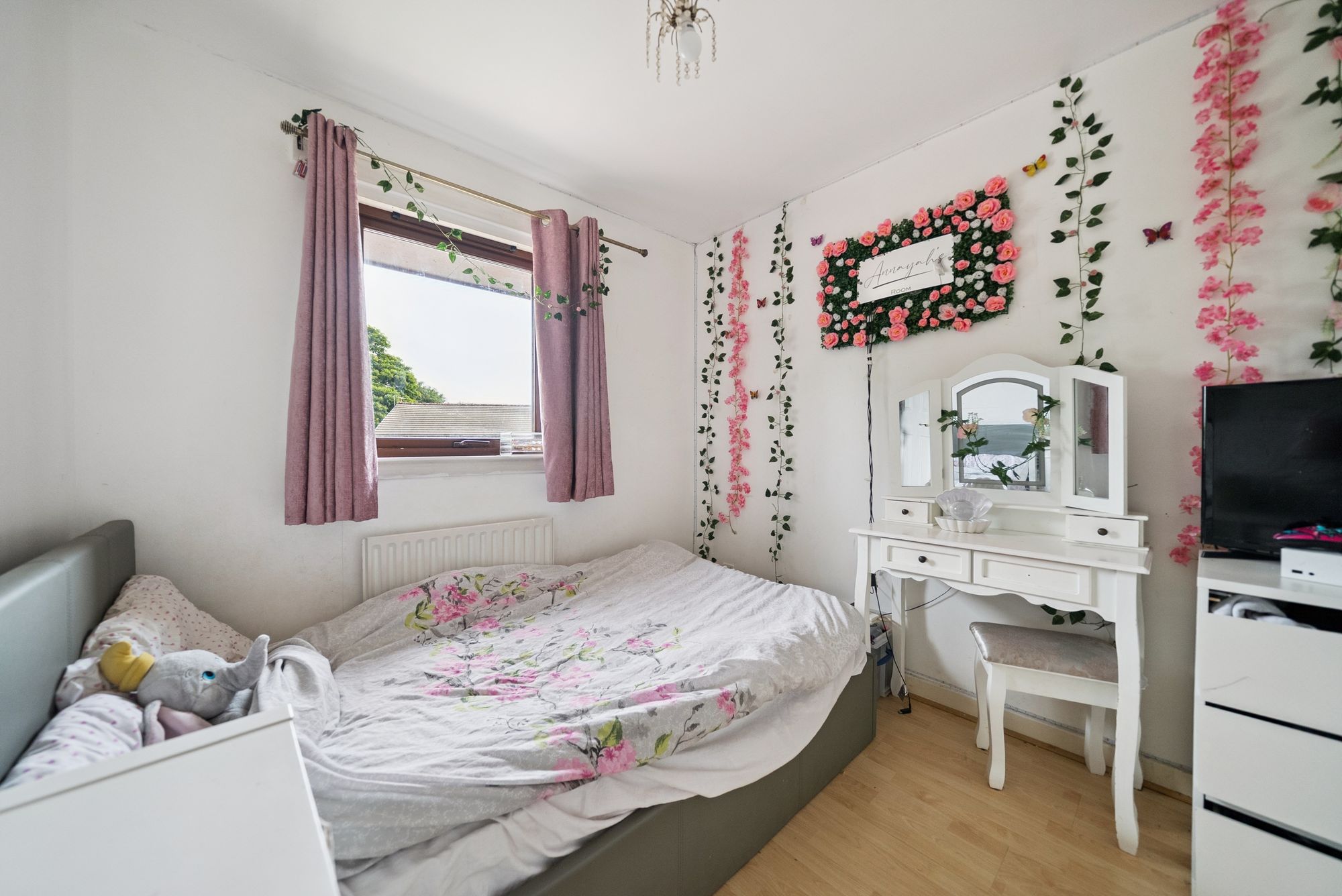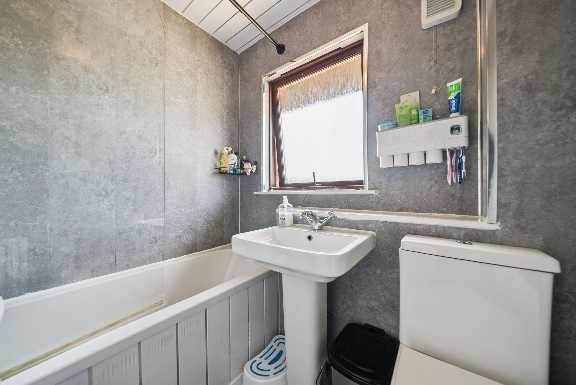 Immediately welcoming upon entry, a lengthy ground floor hallway affords access to a practical two-piece cloakroom as well as a notably bright and generously proportioned lounge which affords ample space for a dining table and features a large storage cupboard off. From here, ‘Georgian paned’ double doors lead in to an impressive re-fitted kitchen hosting a comprehensive range of base and wall mounted units along with a range of modern integrated appliances. On the notably bright upper floor of this home there are three extremely well-proportioned bedrooms, each of which have capacity to host a double bed, and a contemporary family bathroom with white three-piece suite and overhead shower attachment.