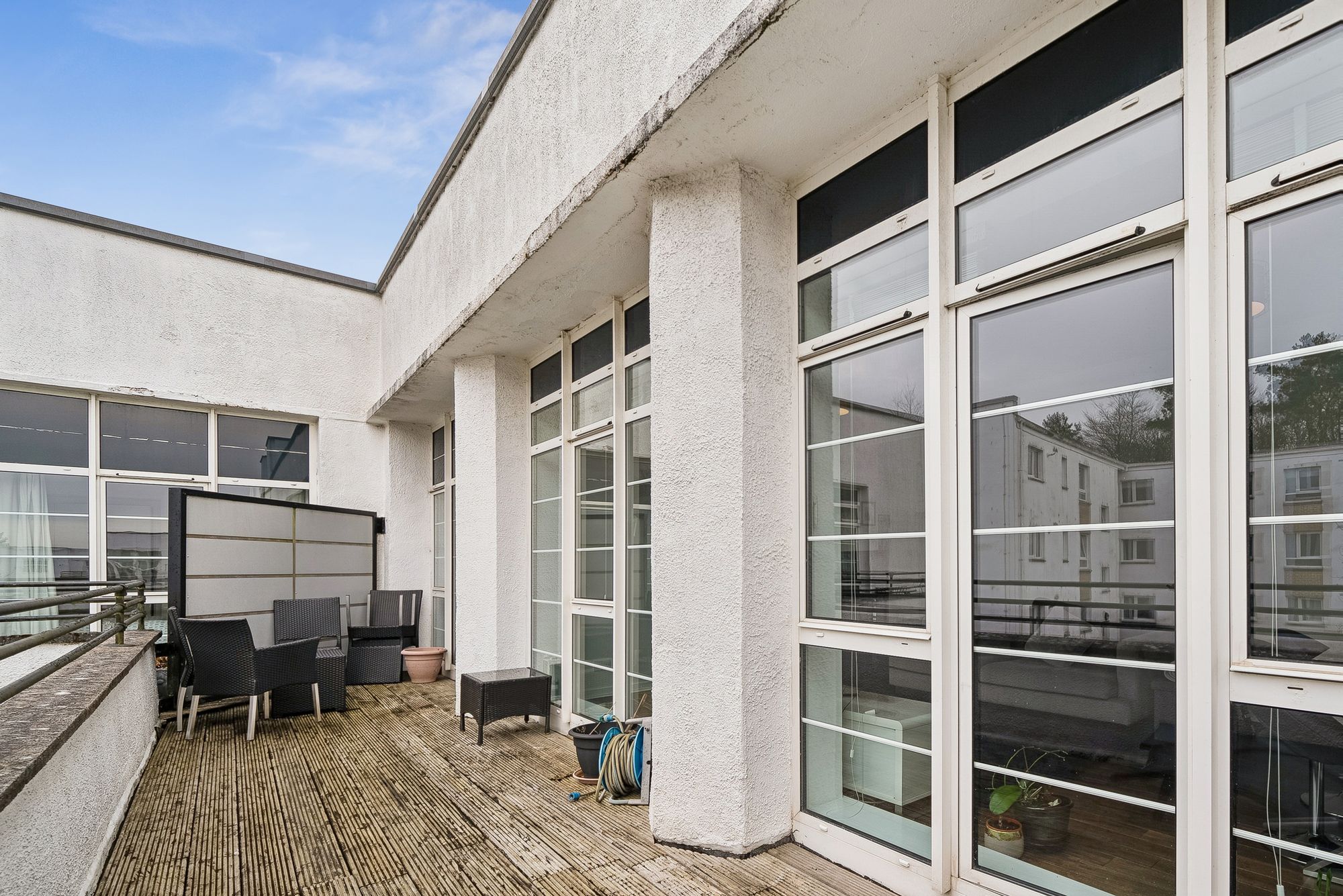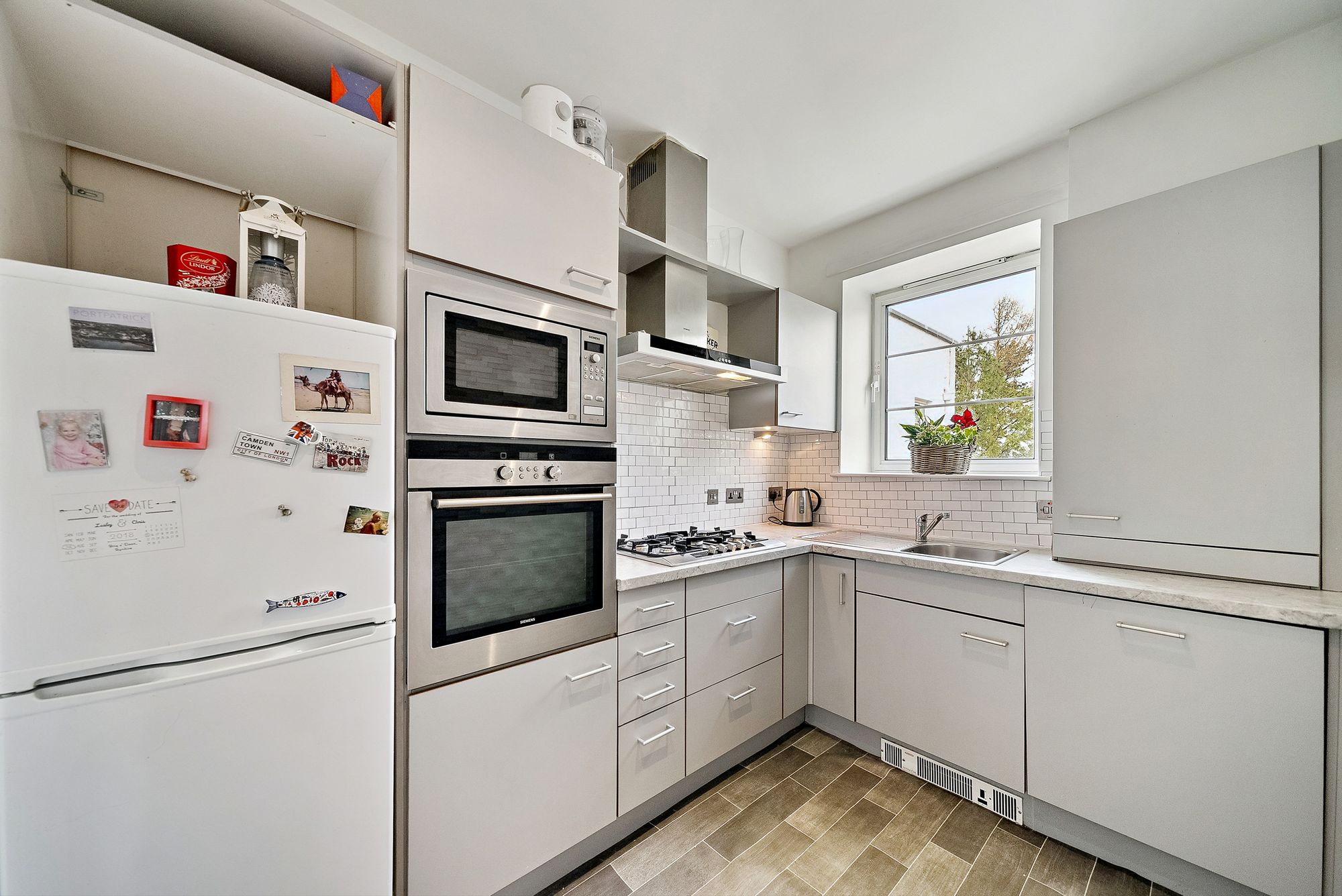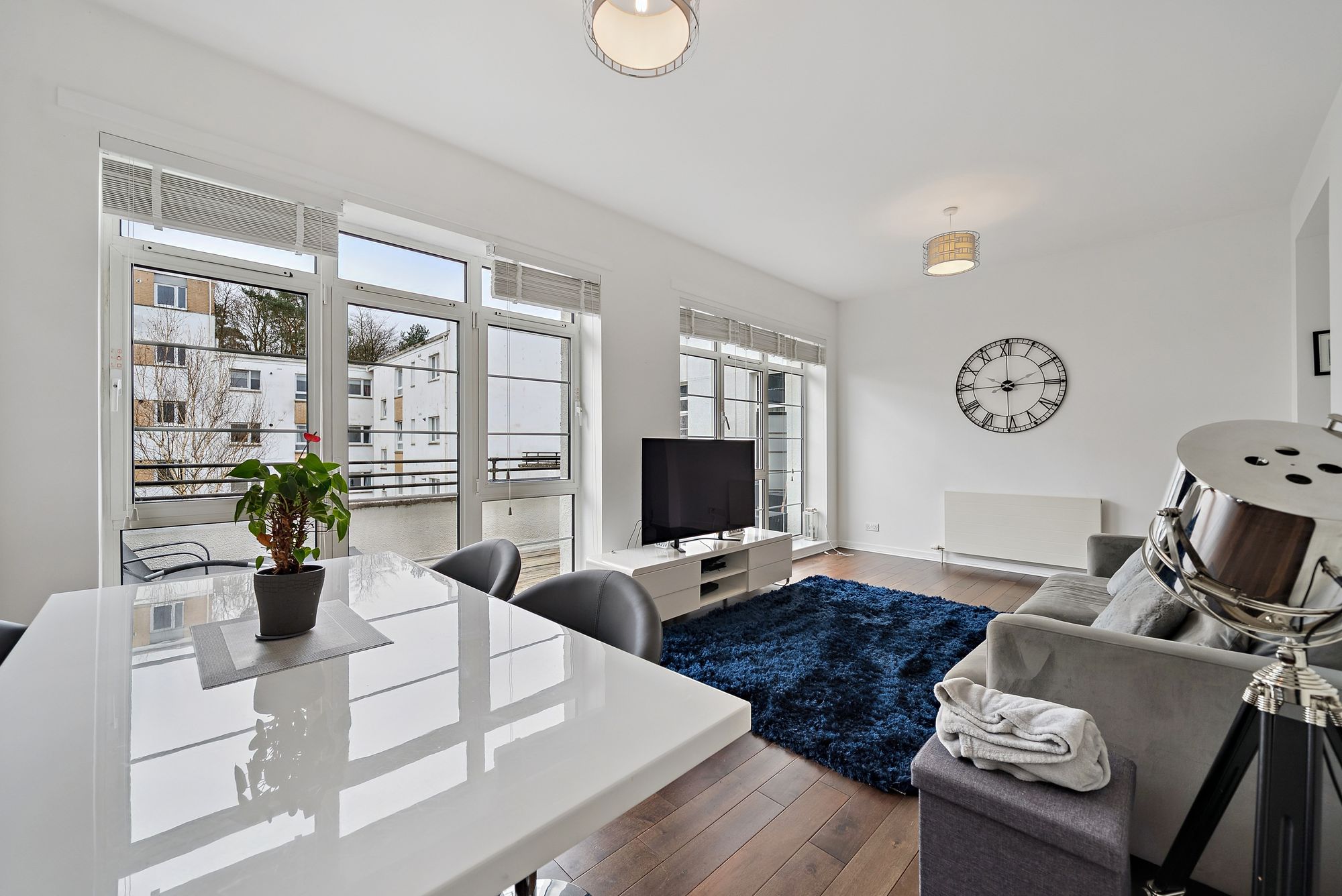 The property is enhanced by high ceilings and large, near floor-to-ceiling windows, creating an exceptional sense of light and space throughout. Additional features include modern gas central heating, double glazing, and professional factoring services ensuring the upkeep of the beautifully maintained communal grounds. The apartment also enjoys a particularly pleasant outlook over a central courtyard garden.