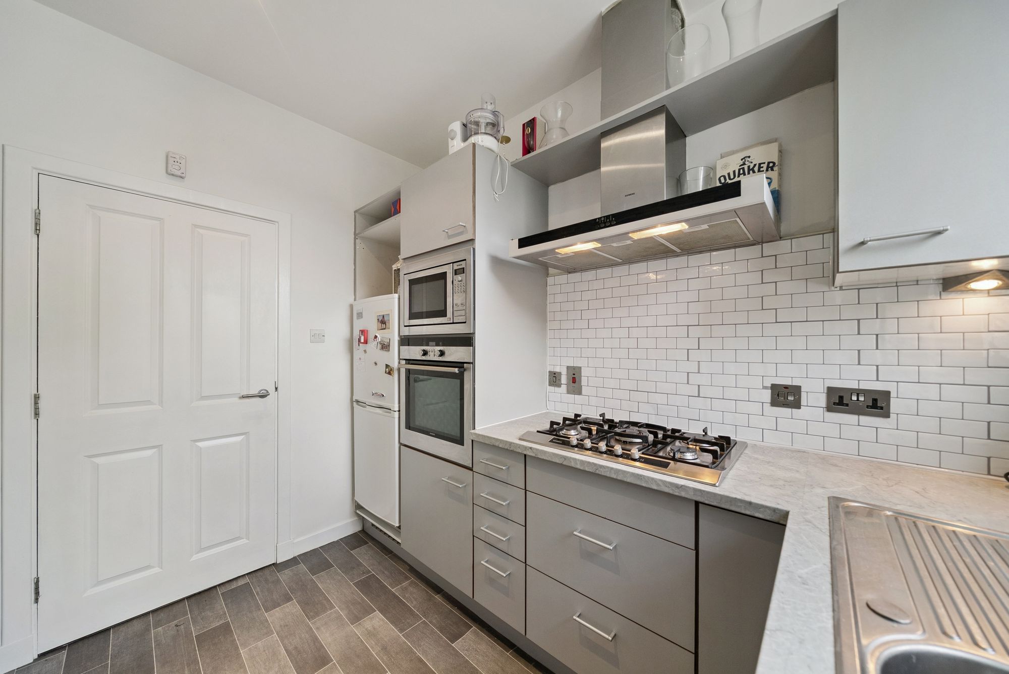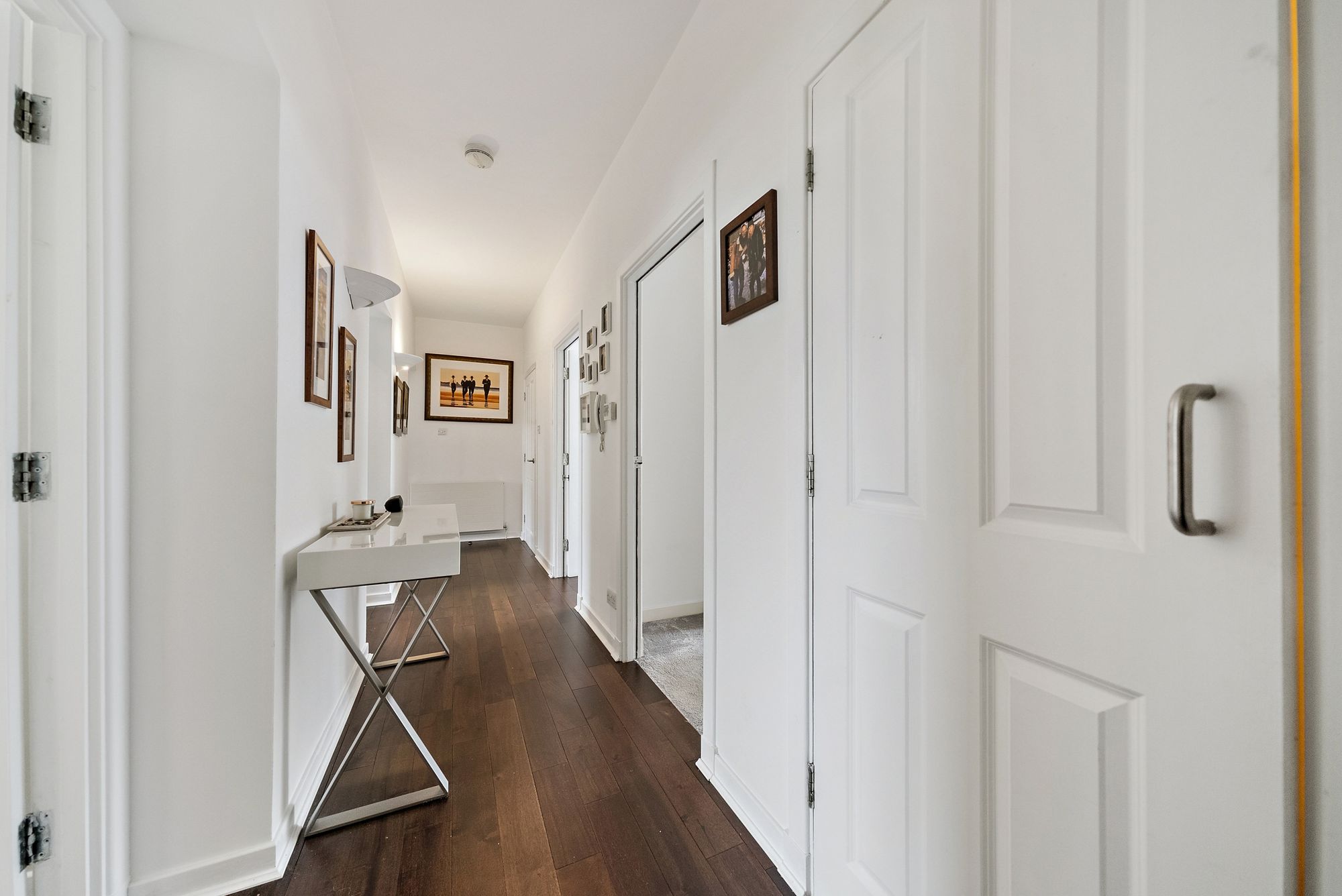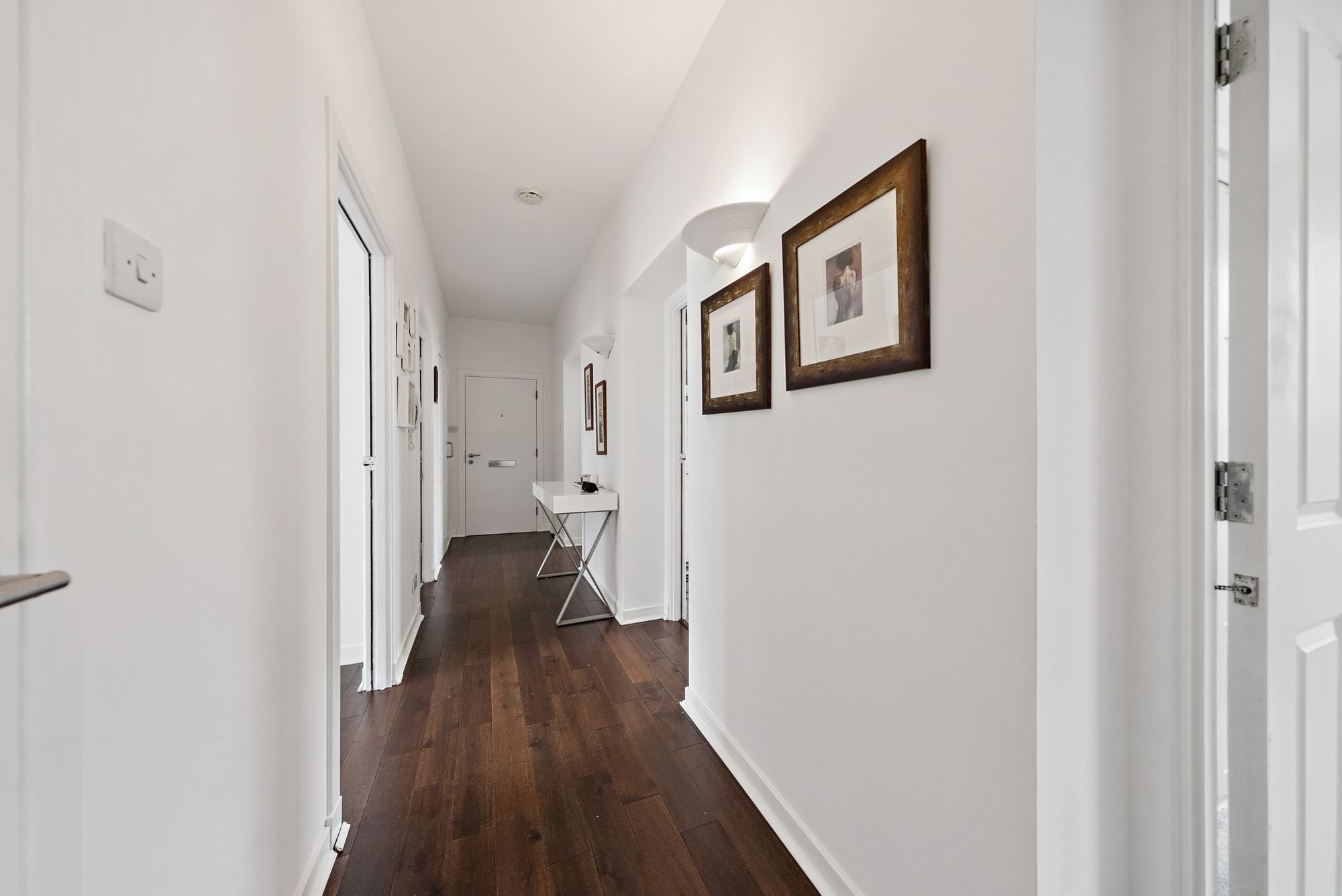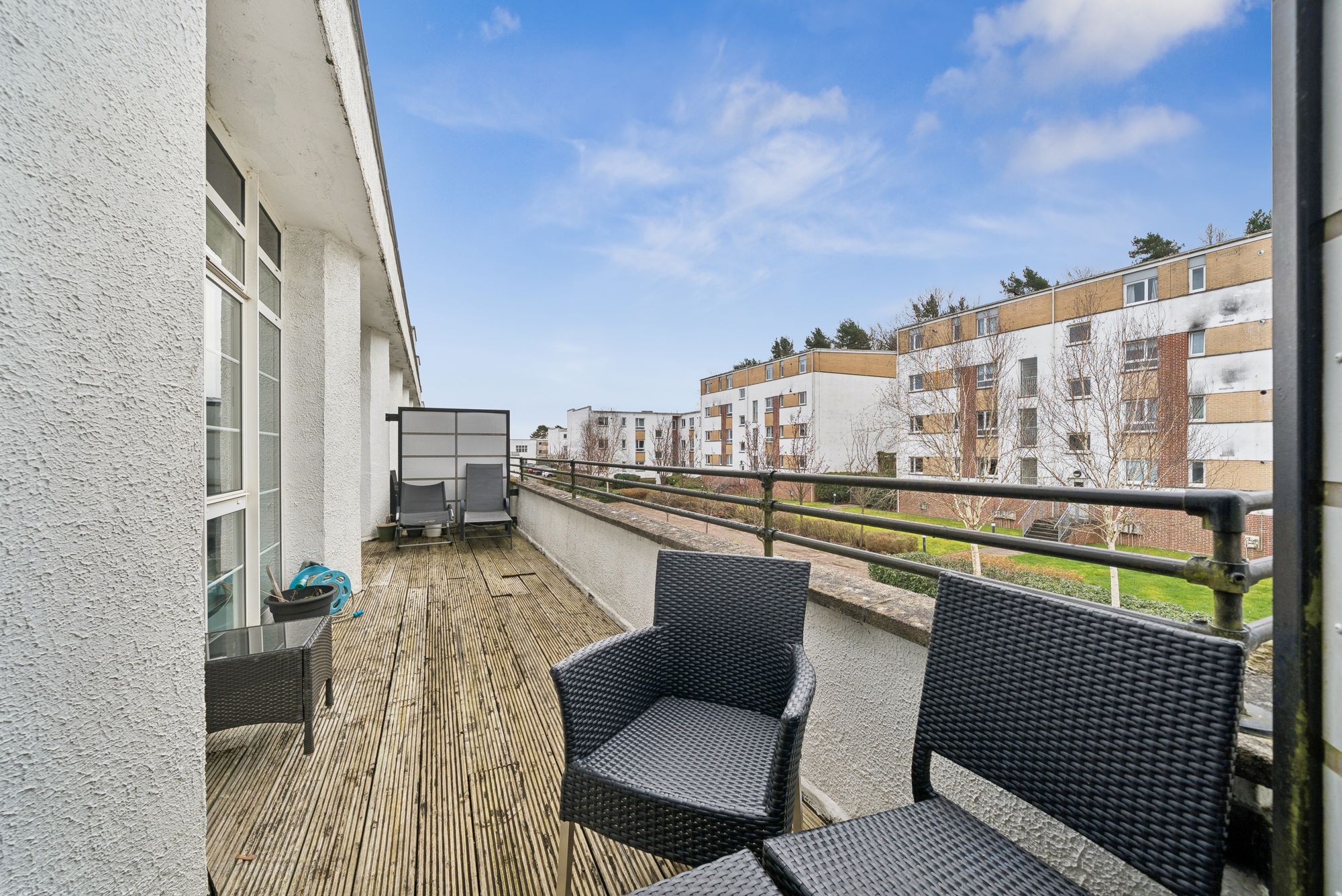 Access is via a secure communal entrance, leading up to the first floor. Internally, a wide and welcoming reception hallway provides excellent storage with two large cupboards. The spacious open plan lounge and dining area enjoys direct access to a sizable decked balcony, while a separate kitchen is well appointed with an extensive range of wall and base units and integrated appliances, including a five burner gas hob, oven, microwave, concealed fridge freezer, cooker hood, and dishwasher.