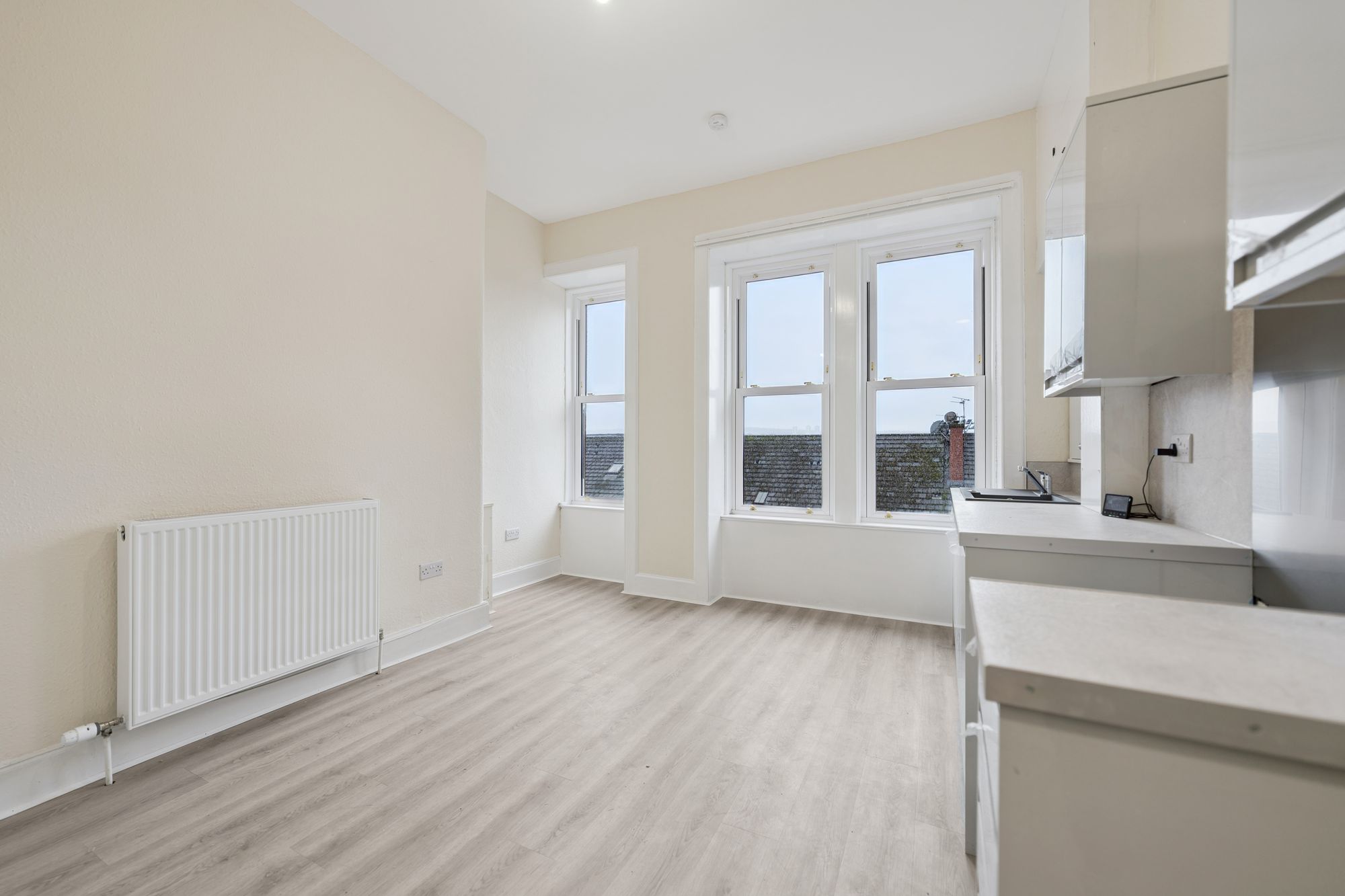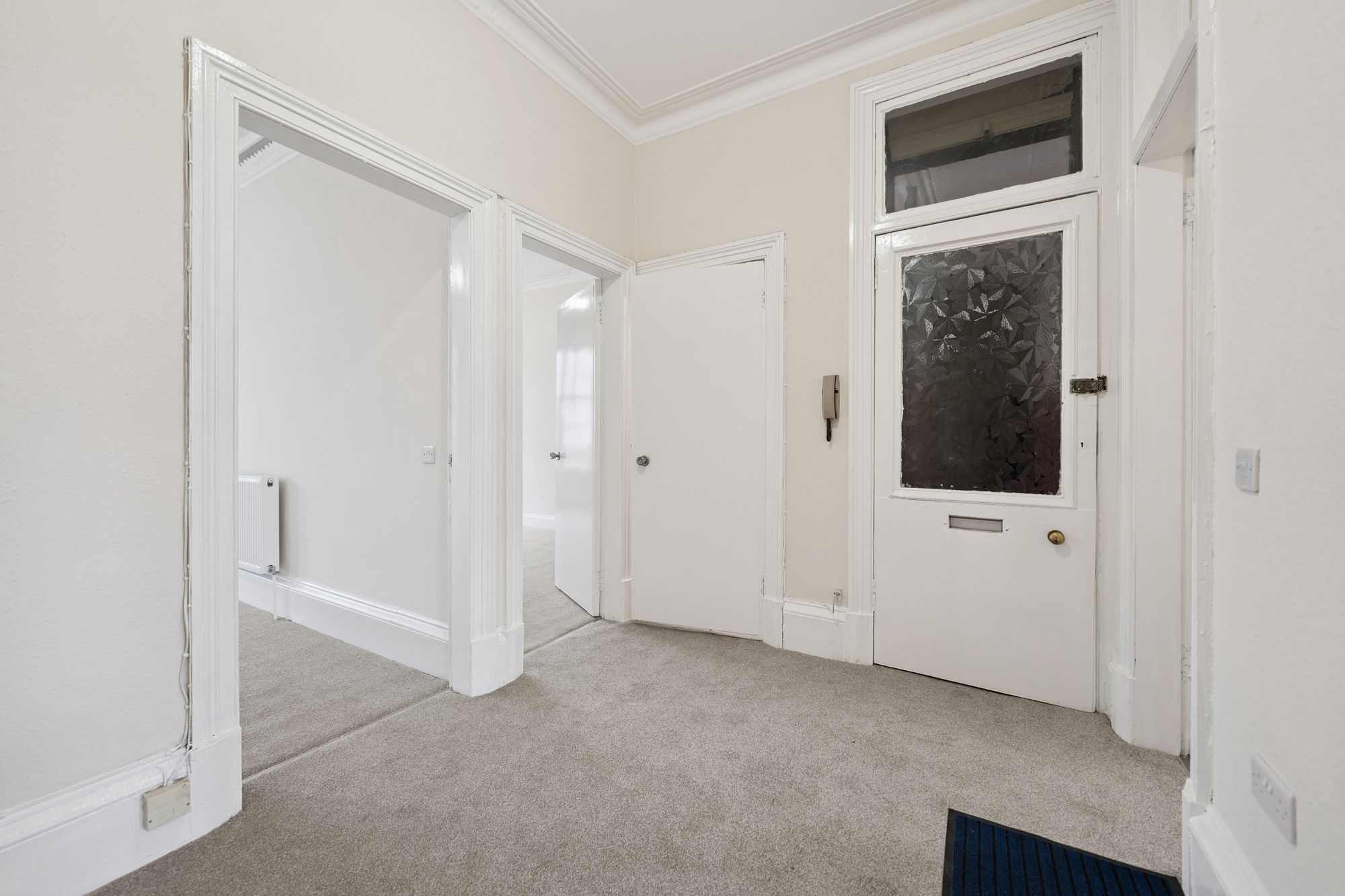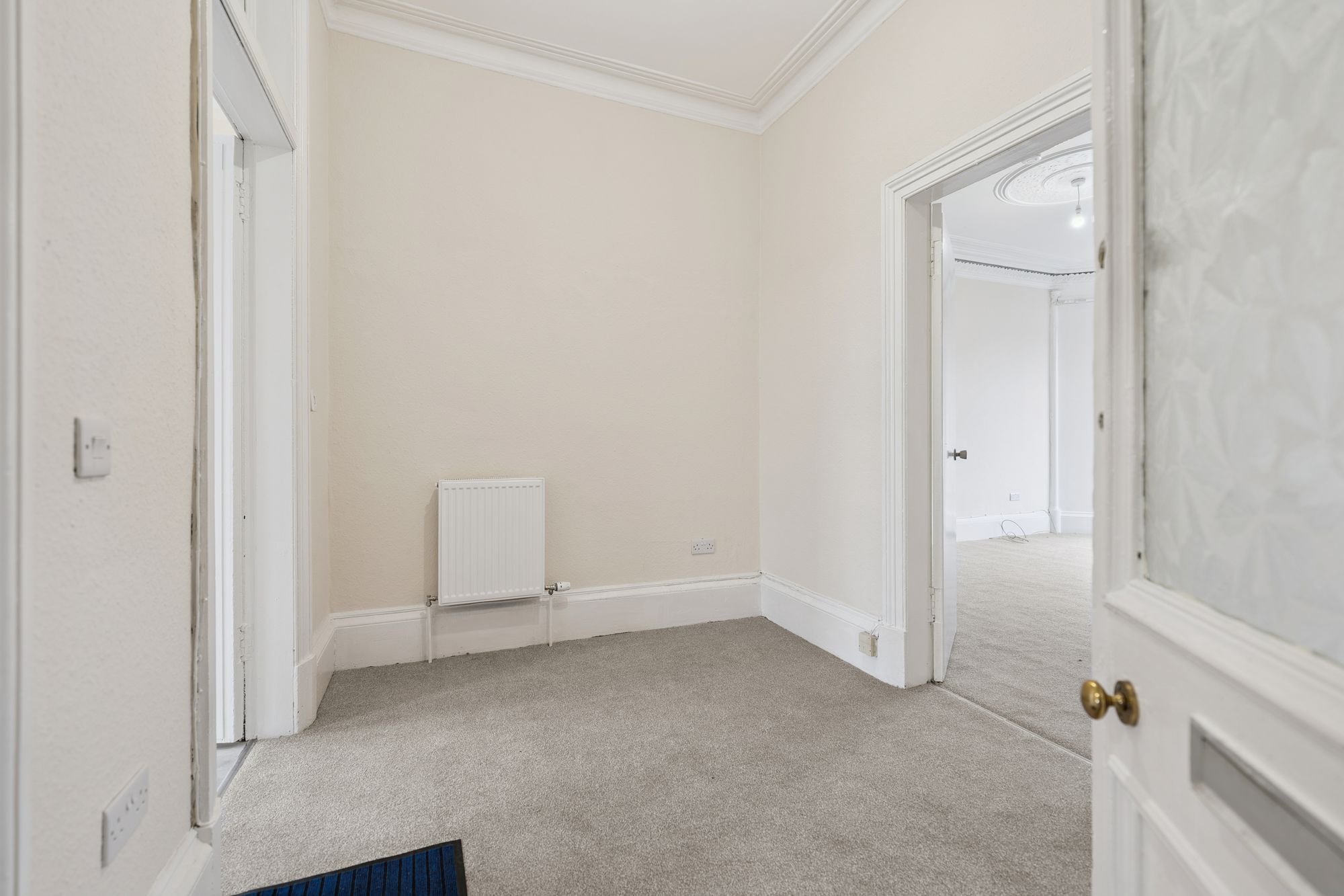 Internally, the apartment boasts generous proportions and an abundance of natural light, while retaining a wealth of traditional character. A broad and welcoming entrance hallway, complete with useful storage cupboard, sets the tone for the space within. The well-proportioned double bedroom offers comfortable accommodation, while the bright front-facing lounge is a true highlight — featuring a charming bay window that floods the room with light and a substantial storage cupboard for added practicality.