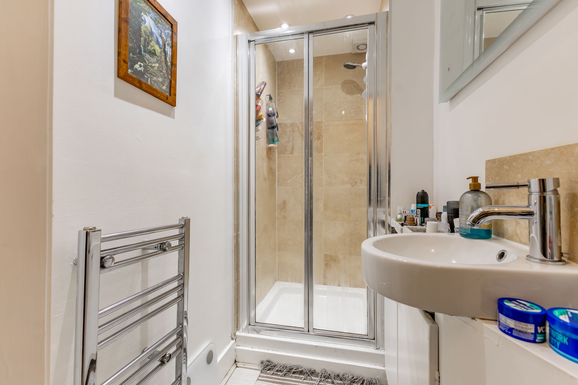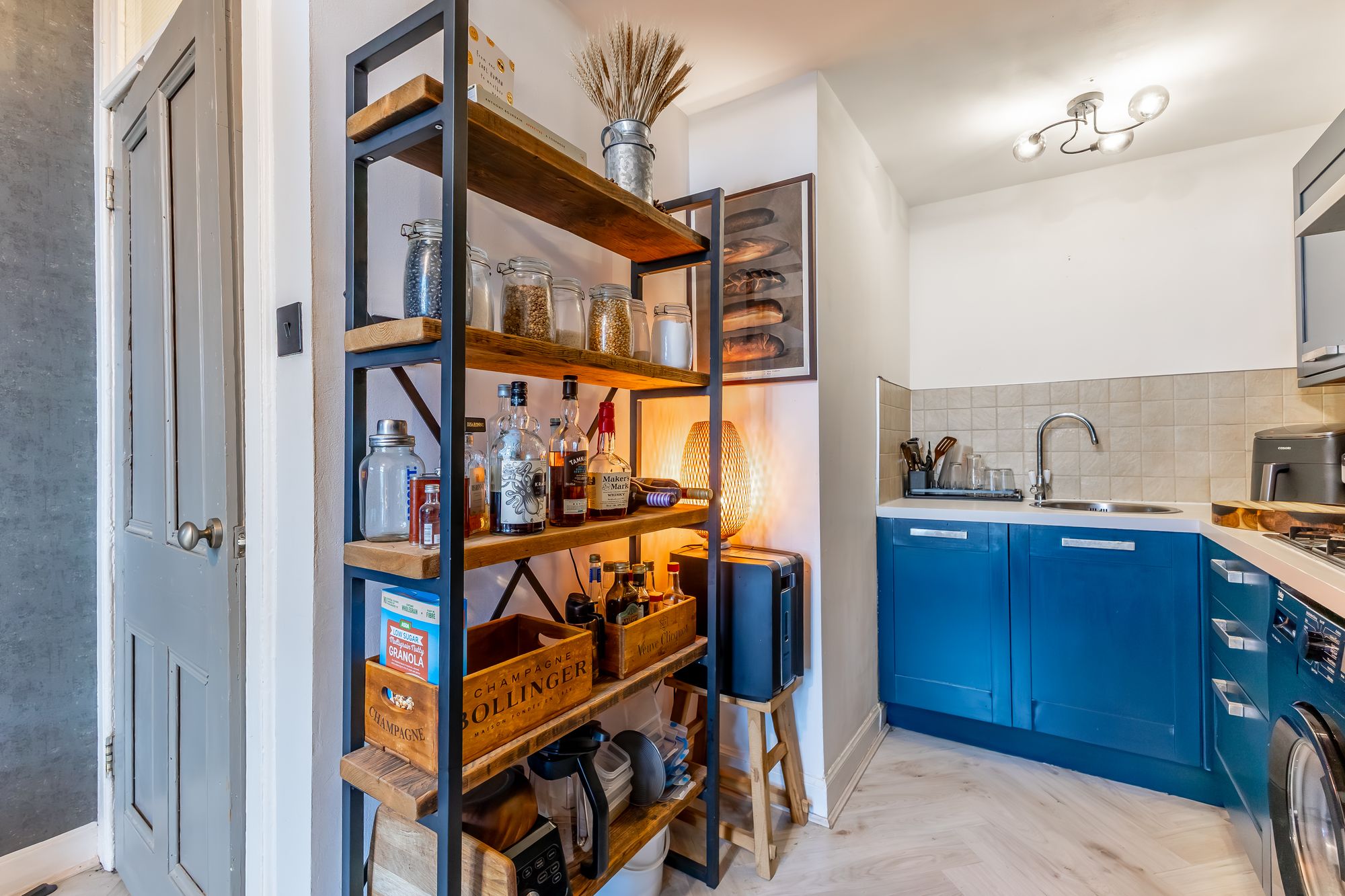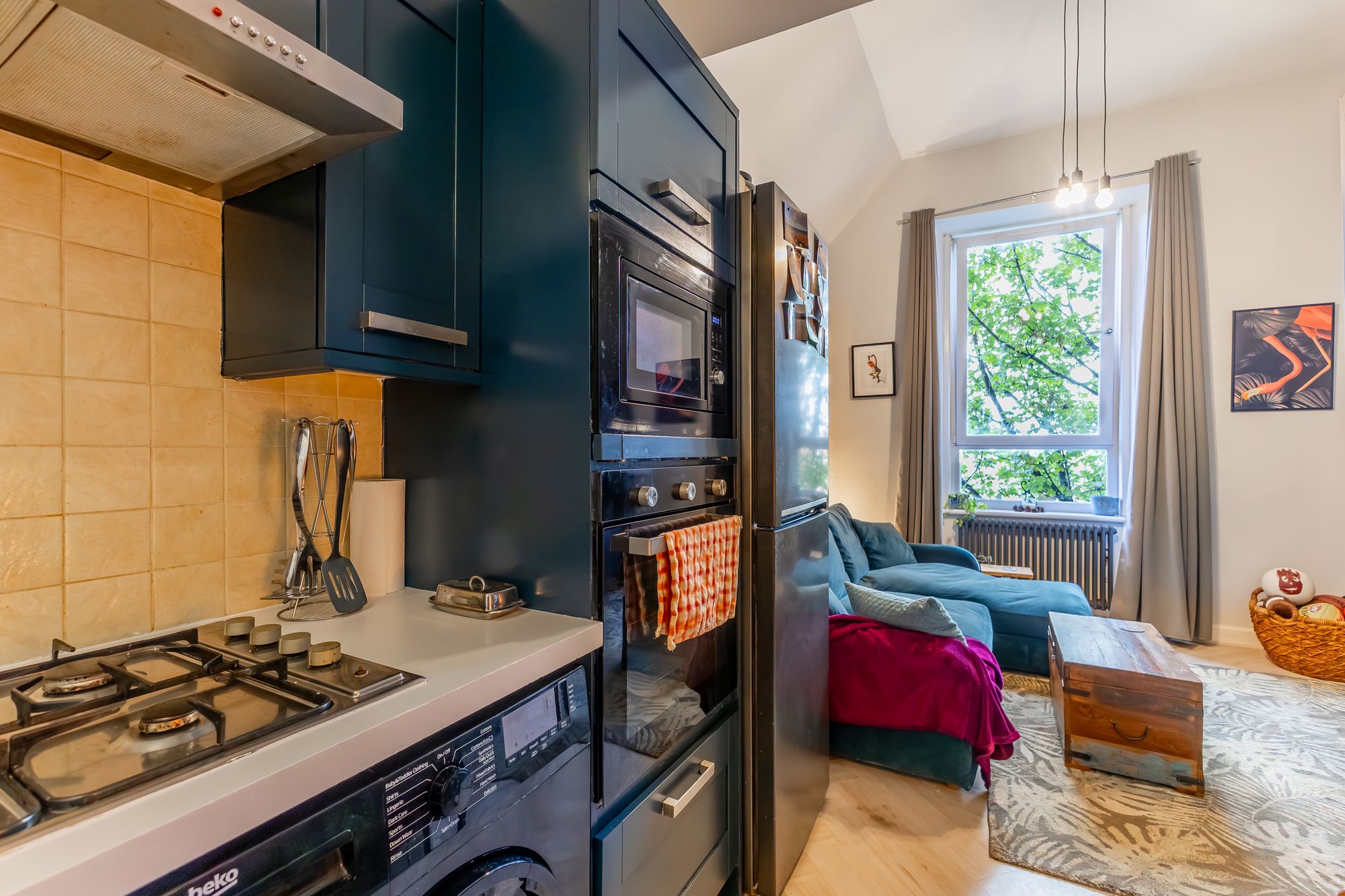 The flat is accessed via a secure entry phone system and a well-maintained communal stair. Upon entering, you’re welcomed into a spacious hallway featuring high ceilings, a stylish radiator, and modern door fixtures and fittings. The accommodation comprises an open-plan kitchen/dining area with a contemporary, well-equipped kitchen, a bright and well-proportioned bedroom, and a stylish shower room with separate WC—both featuring modern fixtures and finishes throughout.