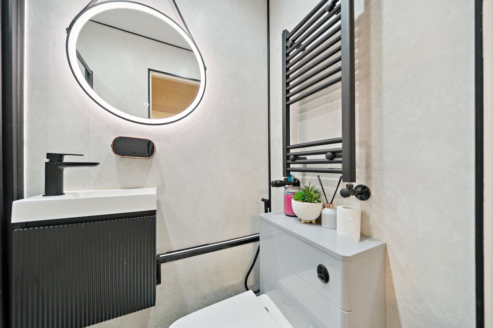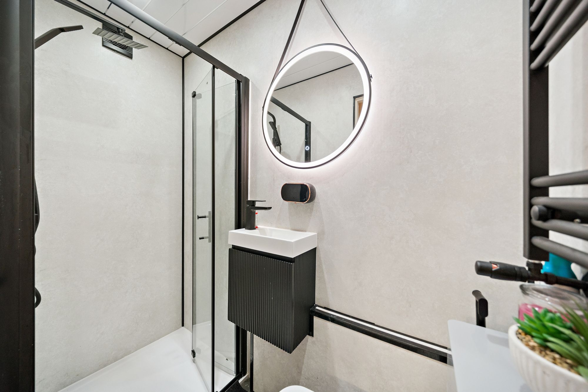 Featuring a modern specification throughout, the welcoming accommodation extends, on the ground floor, to spacious rear-facing lounge, modern fitted kitchen hosting a range of base and wall mounted units, striking re-fitted shower room and a superbly spacious rear hallway which might lend purpose as an agile work-hub.