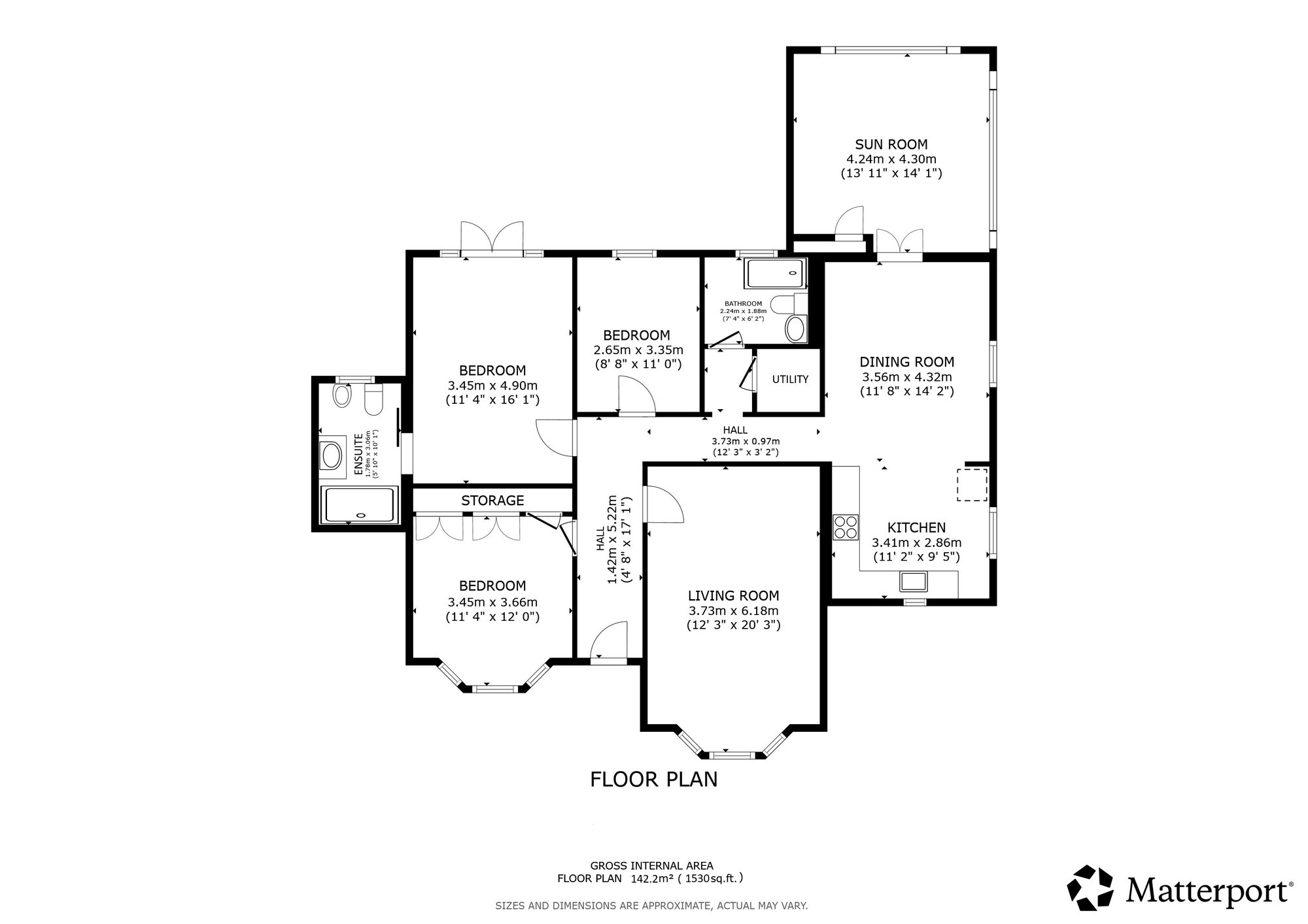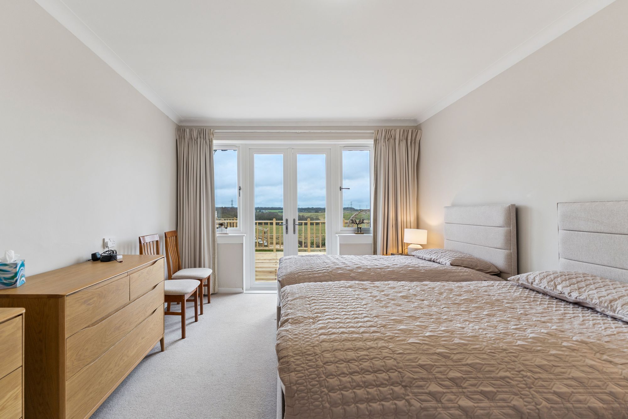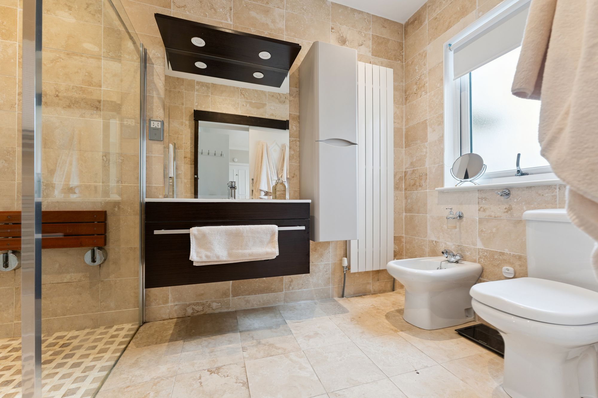The principal bedroom is generously proportioned and benefits from a quality en suite shower room together with French doors opening directly onto the rear garden. Two further well-sized bedrooms, one with fitted storage, are served by a beautifully appointed family shower room with utility cupboard off.