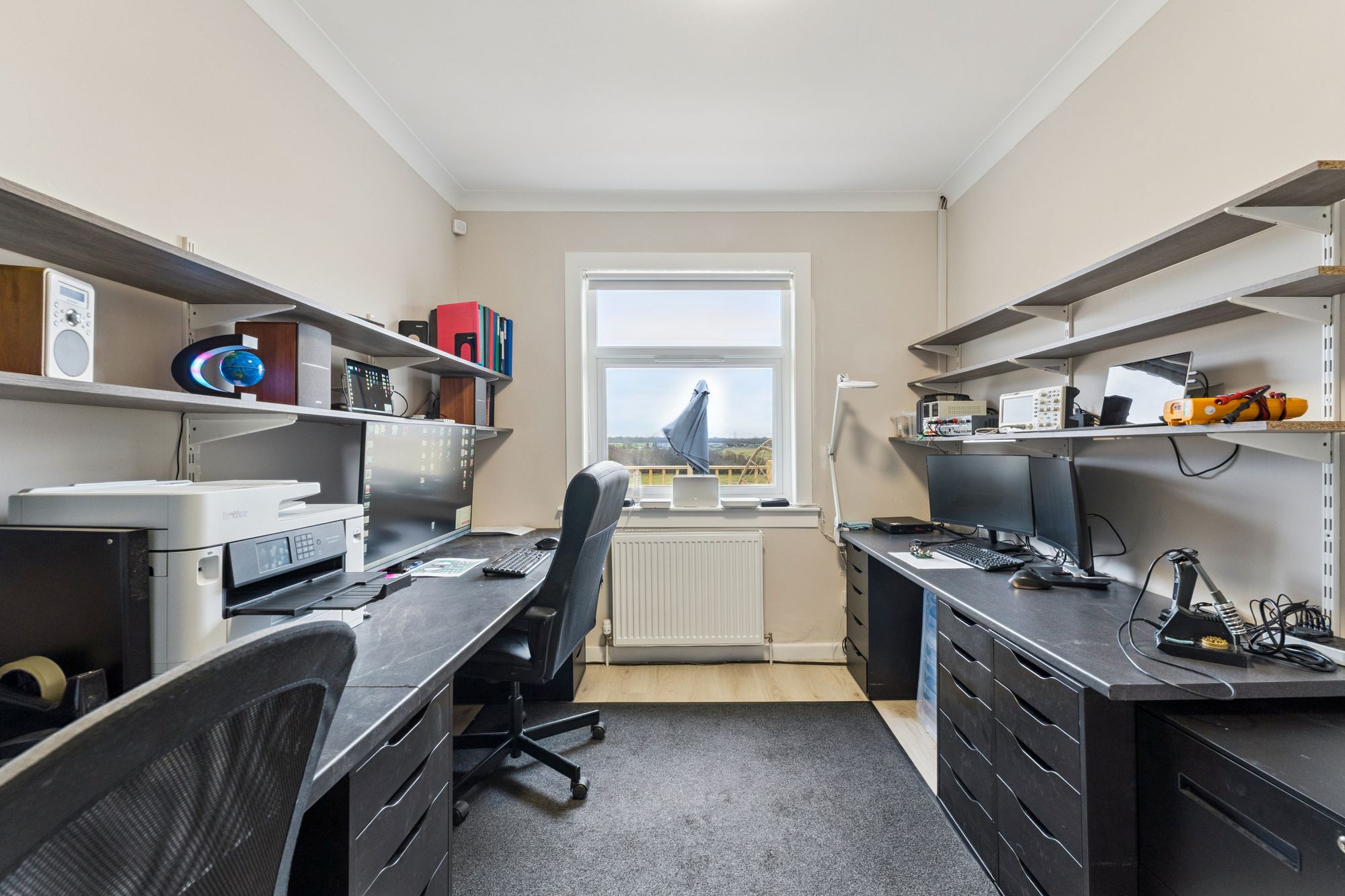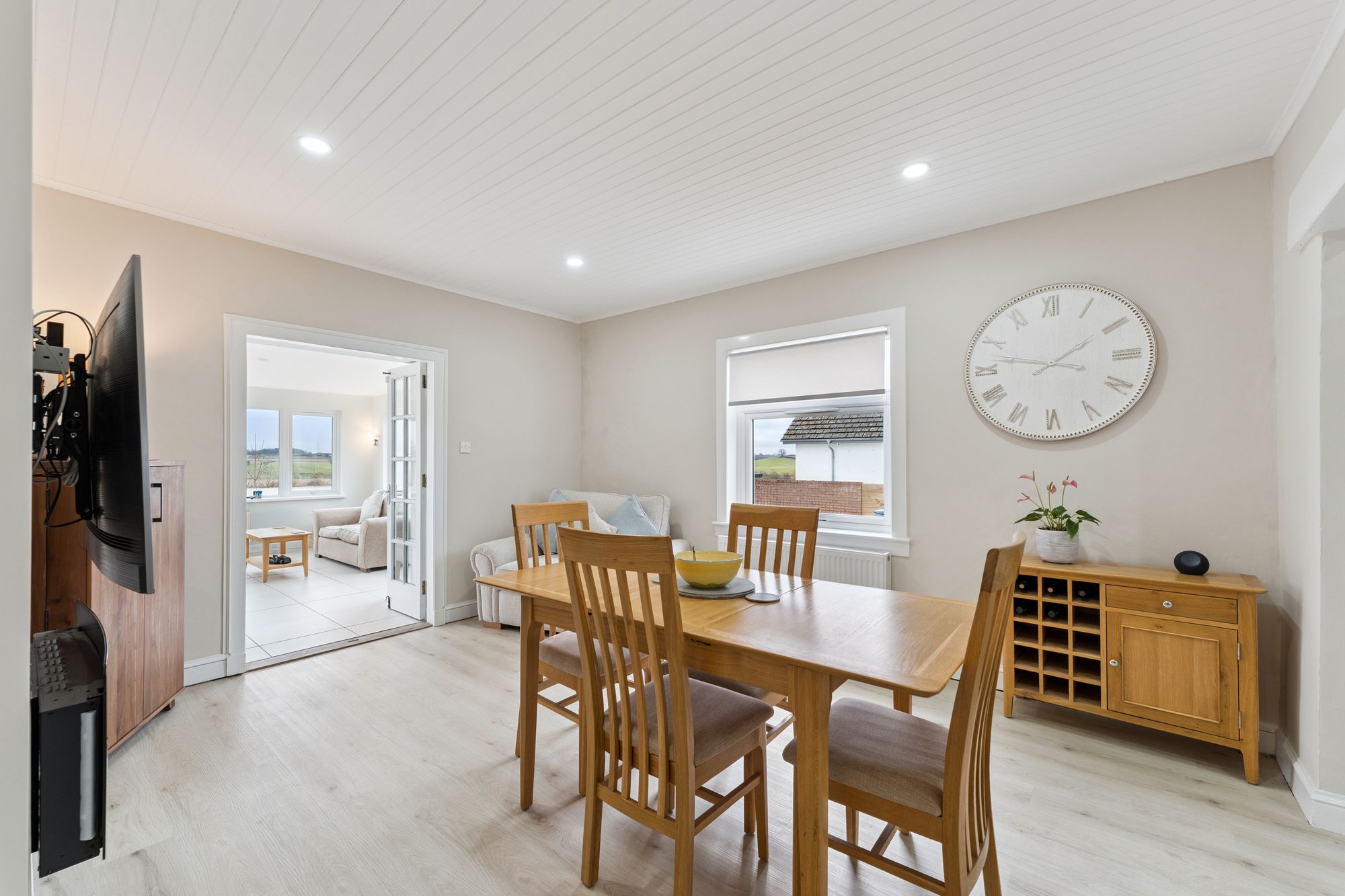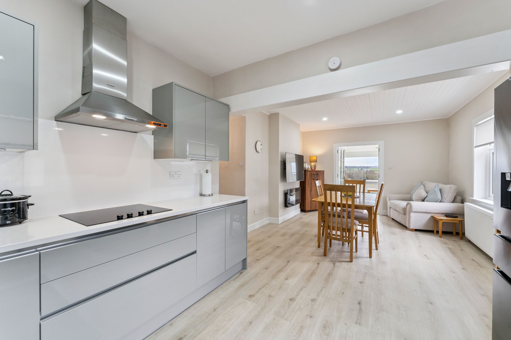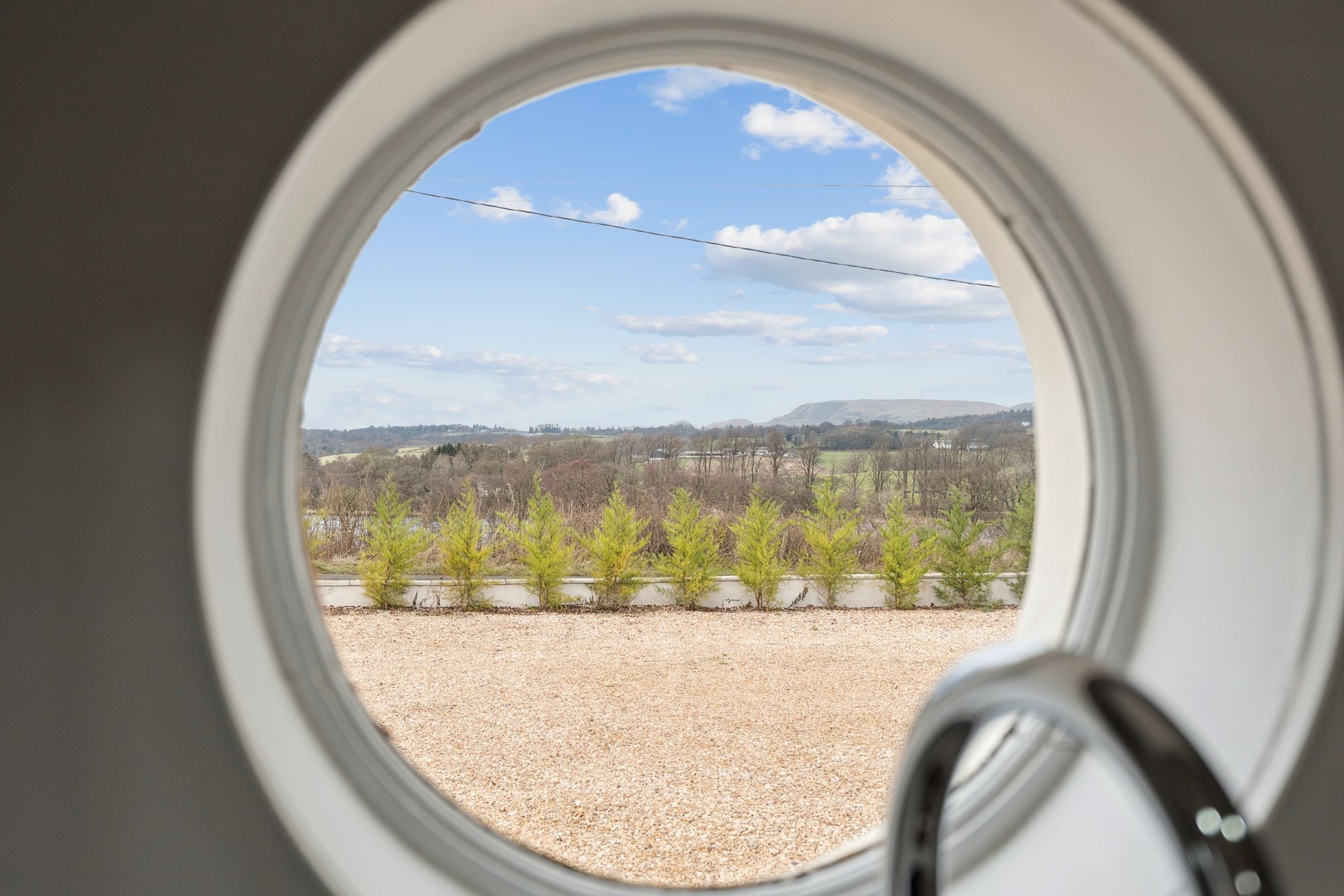 The west-facing extension provides a superb newly fitted dining kitchen, thoughtfully designed with an extensive range of contemporary wall and floor mounted units, integrated appliances and Silestone work surfaces. A charming port window perfectly frames the stunning views towards the Campsies, while additional side windows flood the space with natural light.